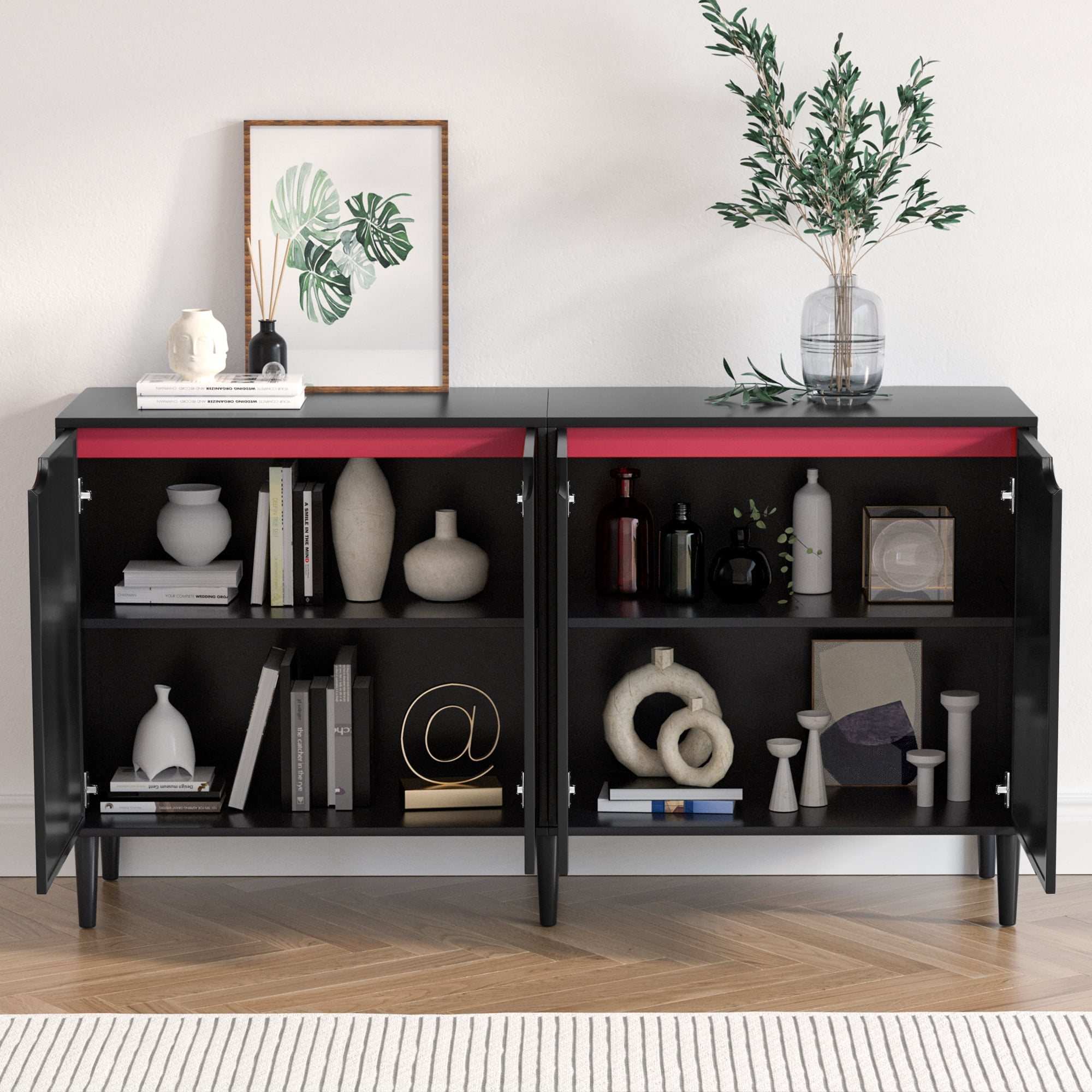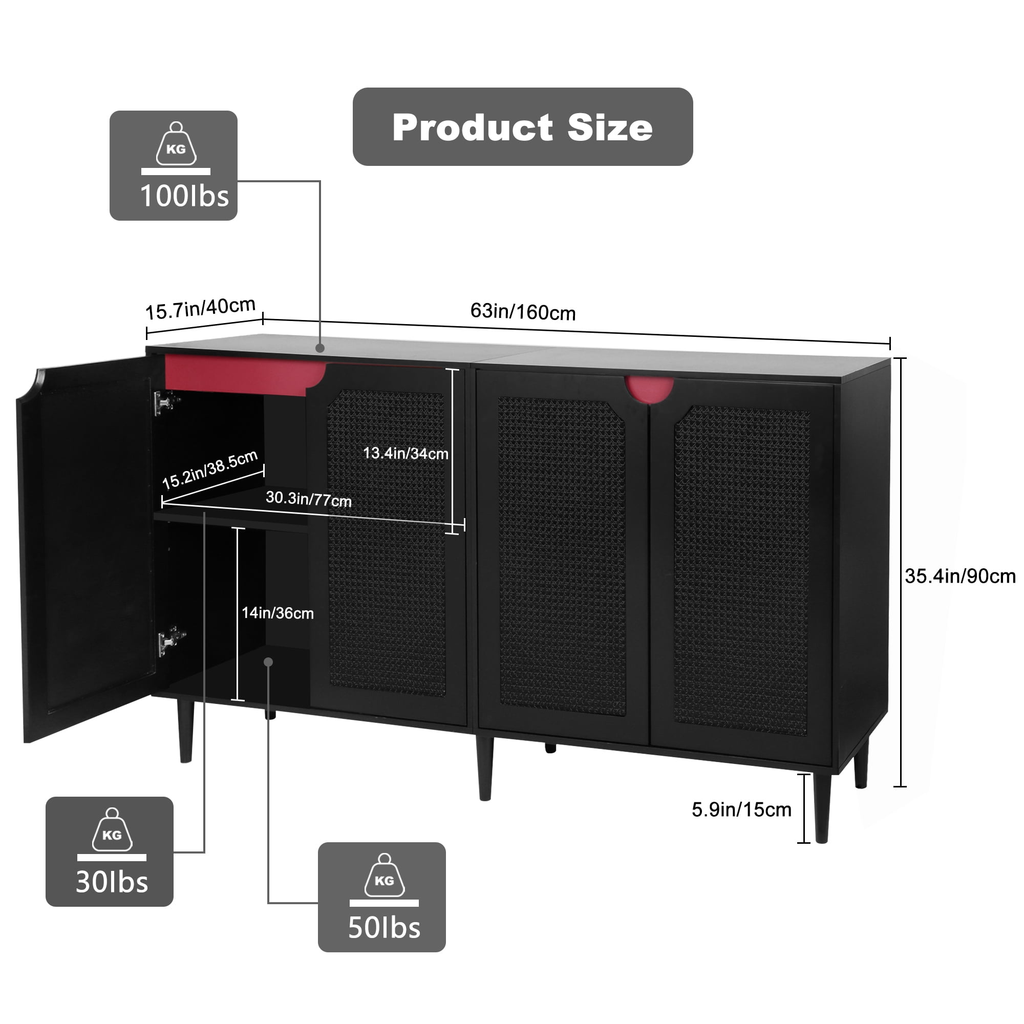 Add an eye-catching addition to your living room, dining room, or hallways with Eumyviv Storage Cabinet. The sideboard cabinet arrives with 4 rattan doors and 2 adjustable shelves. Providing ample storage space for daily accessories, utensils, dry goods, and dishware. The built-in adjustable shelf makes it easy to customize the space freely according to your needs. Chic black finish compliments with unicolor handles for a touch of elegant vibe you crave. Made of durable laminated MDF, it ensures a long life journey with your living space. Environmentally friendly natural rattan ensures no harm and is odorless. Would definitely recommend this perfect cabinet for concealing your unwanted clutter! High-grade MDF board Features long durability Unique black rattan design 4 doors with adjustable shelves inside Organize any room in your home with ample storage space Comes with all the needed accessories and step-by-step instruction Color: Black Style: Mid Century Material: MDF+Real Rattan Overall Dimensions: 15.7″D x 63″W x 35.4″H Package includes: 1*Storage Cabinet All Accessories 1*Detailed Instruction