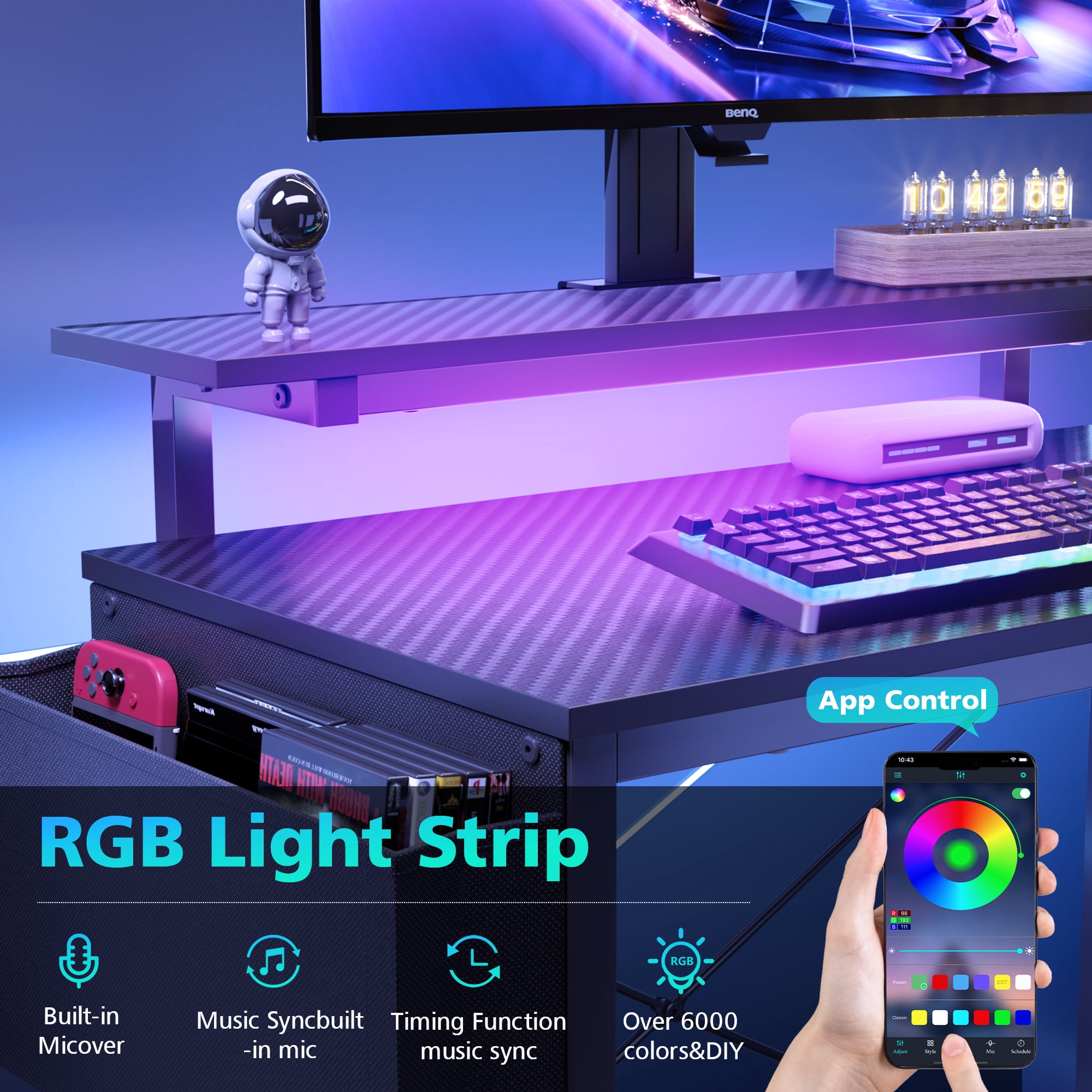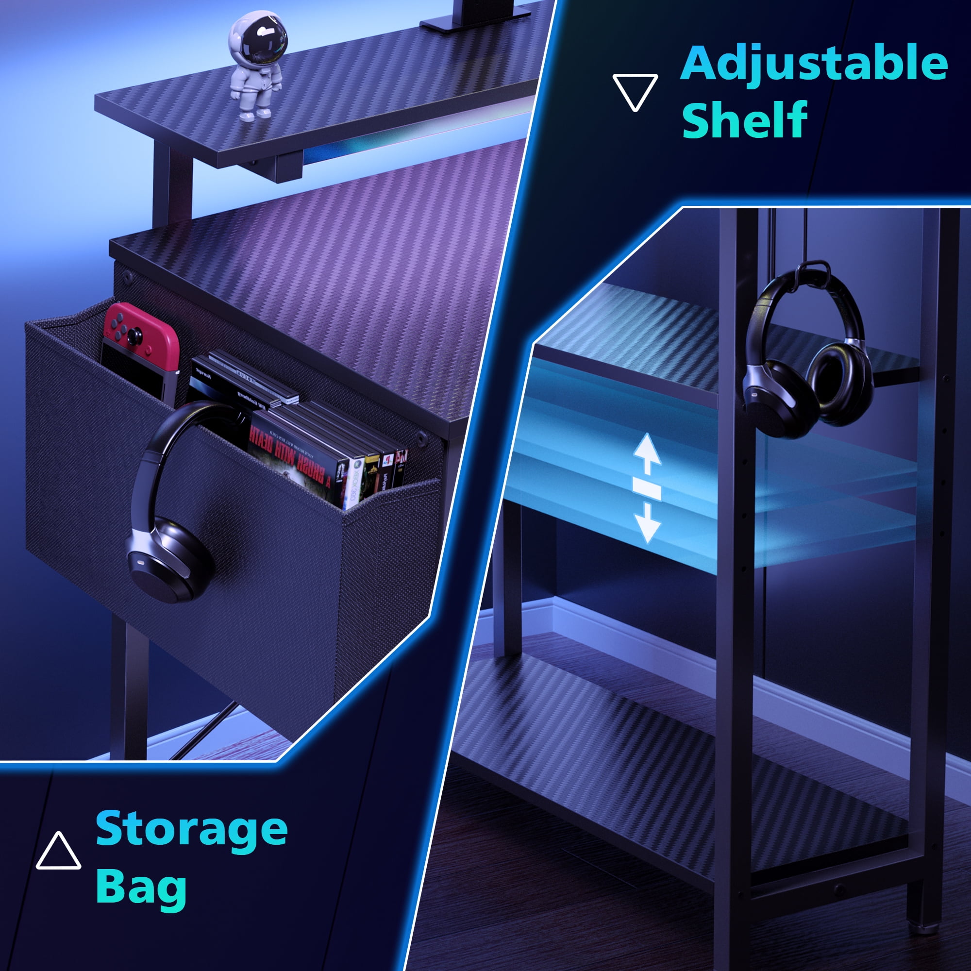 Gamer Desk with Power Outlet: Eunon Gaming l shaped desk features 3 AC outlets + 1USB charing ports& 1 Type-C port ,bringing users great convenience for gaming or home office. Easily charge your computer, ps4, smart phone. Monitor Stand: The 6″H removable monitor stand allows for more space and helps to reduce your neck strain with a better sitting posture by providing an ergonomic sight level Reversible Desk: This computer desk features a reversible design, allowing you to install the storage shelves and monitor stand on the left or right according to your needs. Perfectly fit any corner area. Adjustable Shelves: Equipped with adjustable shelves, this corner desk provides four different height options for ample storage space to store books, plants, gaming gear, and more. The open structure design also ensures generous legroom, creating a comfortable workspace. Sturdy & Stable Construction:Eunon desk is constructed by high-quality P2 board to ensure stability and durability as well as scratch and water resistance. Adjustable non-slip foot pads ensure not only protect your floor from being scratched, but also ensure stability on uneven ground. Easy to Assemble: We provide the tools needed for installation and concise and clear installation instructions, so people without installation experience can also install this table within 1 hour. One-year warranty, Eunon is fully responsible for any quality issues. If you have any other questions, please feel free to contact us. Specifications: Dimension: 41.34″L x 31.50″D x 30.71″H Overall Product Weight: 38.57 lb Top Load Bearing: 100 LBS Color: Black Carbon Fiber What’s in the box: 1 x Computer Desk 1 x Hardware Pack 1 x Assembly Manual 1 x LED Light Strip 1 x Remote Control 1 x Storage bag 1 x Monitor Stand 1 x Power Outlet