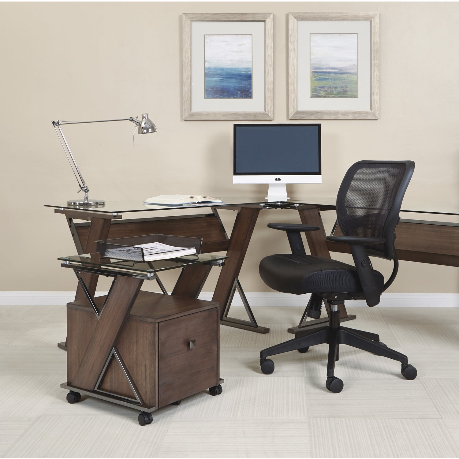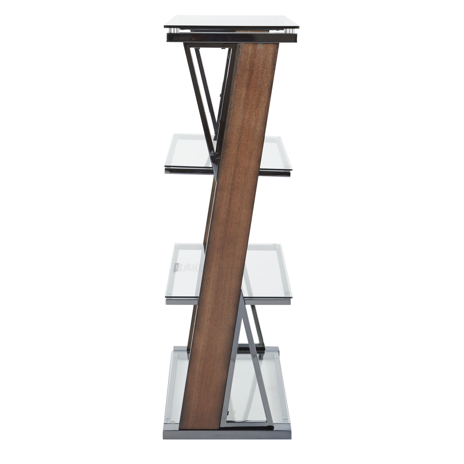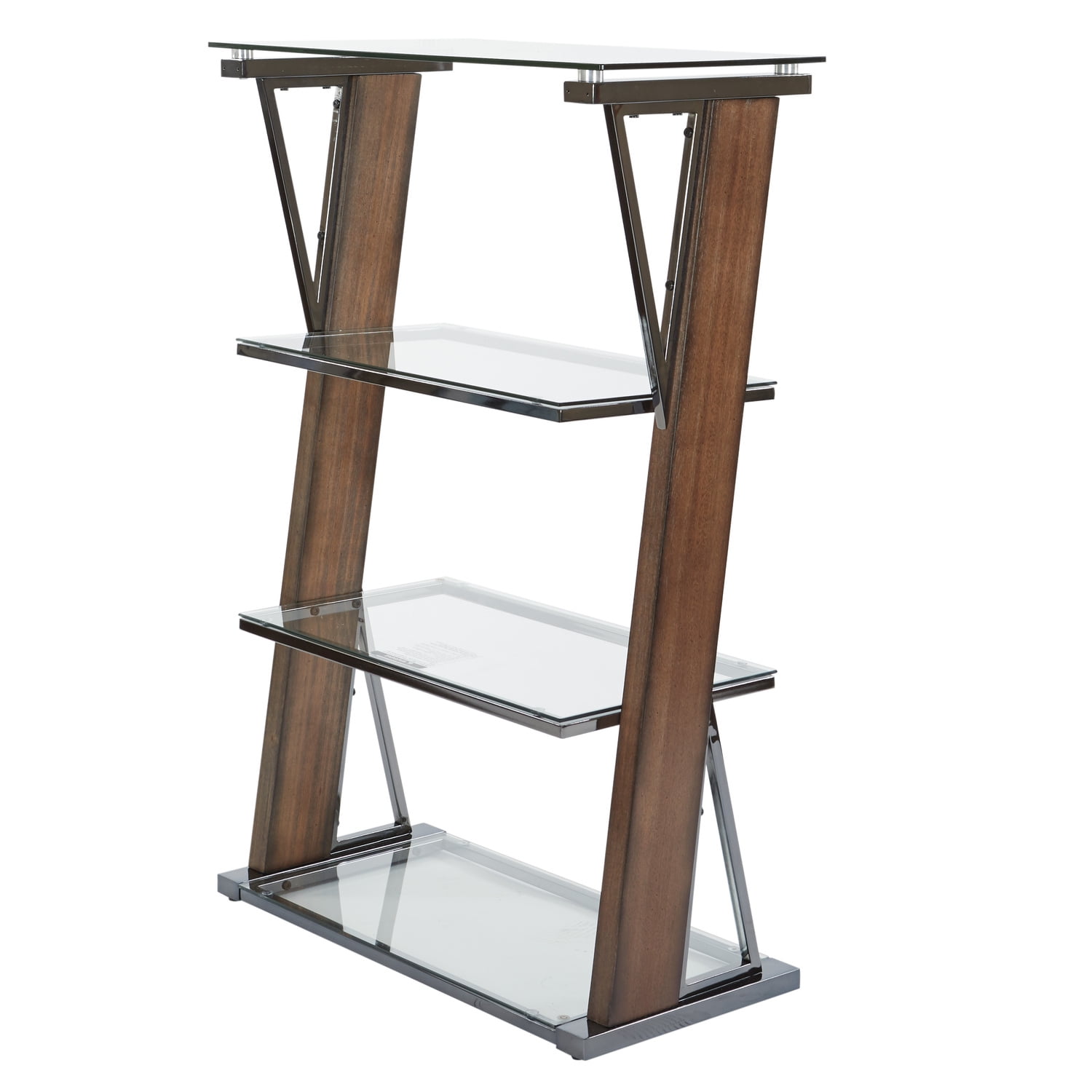 From the home office to the living room, showcase your style with this modern book shelf. Display books, decorative accents, and house plants from one of four tempered glass shelves. Contrasting black nickel plated metal and roasted caramel wood veneers combine for height and structure lending an urban cool vibe. Exude modern sophistication in your home with the OSP Designs Eureka 4 shelf bookcase.