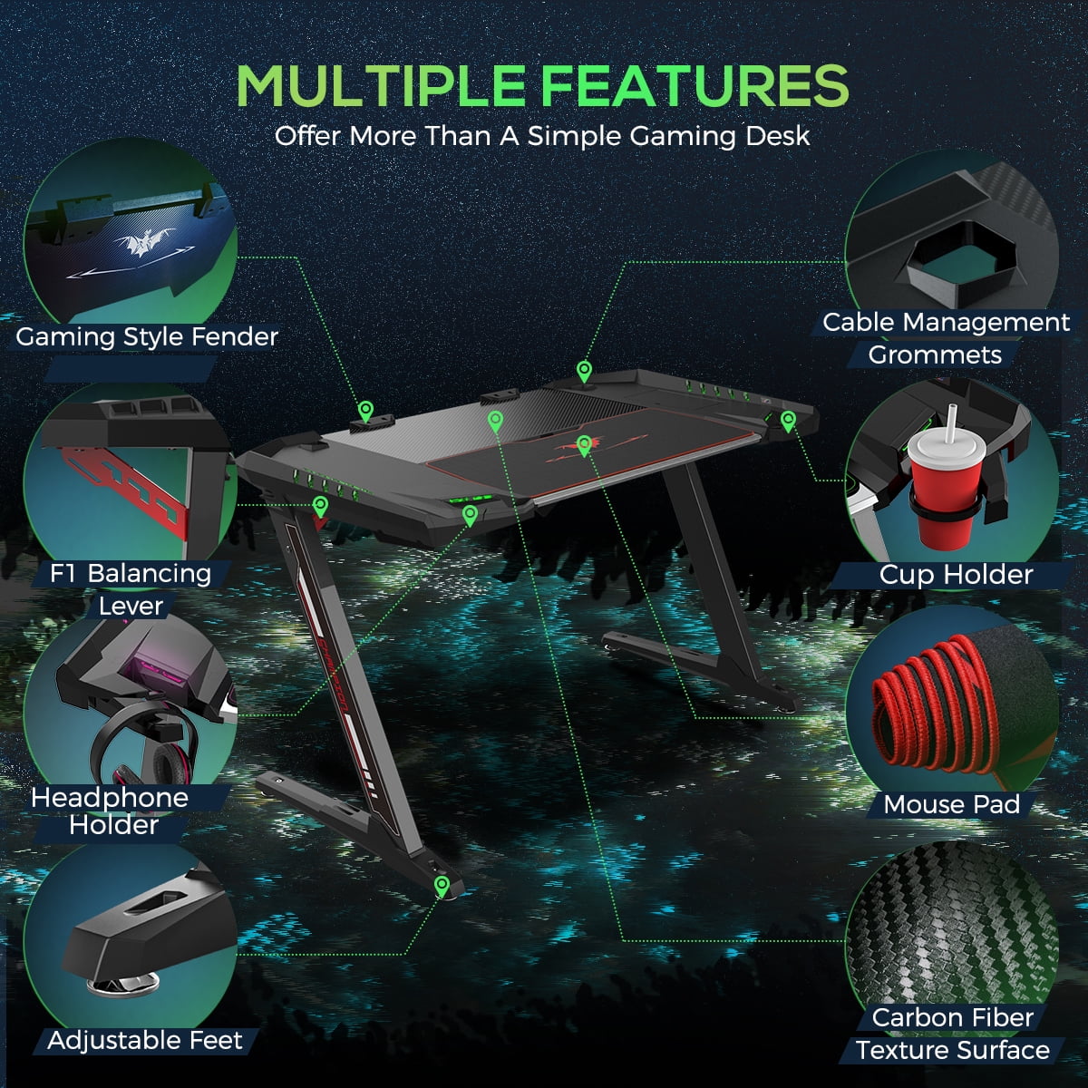 Immersive RGB Lighting – The Eureka Ergonomic Black Z2 office gaming desk has customizable RGB lights that give a unique look to your gaming desk Large Gaming Surface – This 50-inch carbon fiber textured gaming desk is easy to write on and is sturdy and durable enough to hold up to 300 lbs of gaming equipment. 5° Ergonomic Decline – Stay comfortable with this ergonomic design for hours with the declined keyboard area covered by a large mouse pad that we include for free. Mobile Device Slot – Put your phone/tablet in your line of sight for added comfort. Included Items – This black gaming desk comes with a cupholder, game controller rack, power strip holder, and headphone holder.