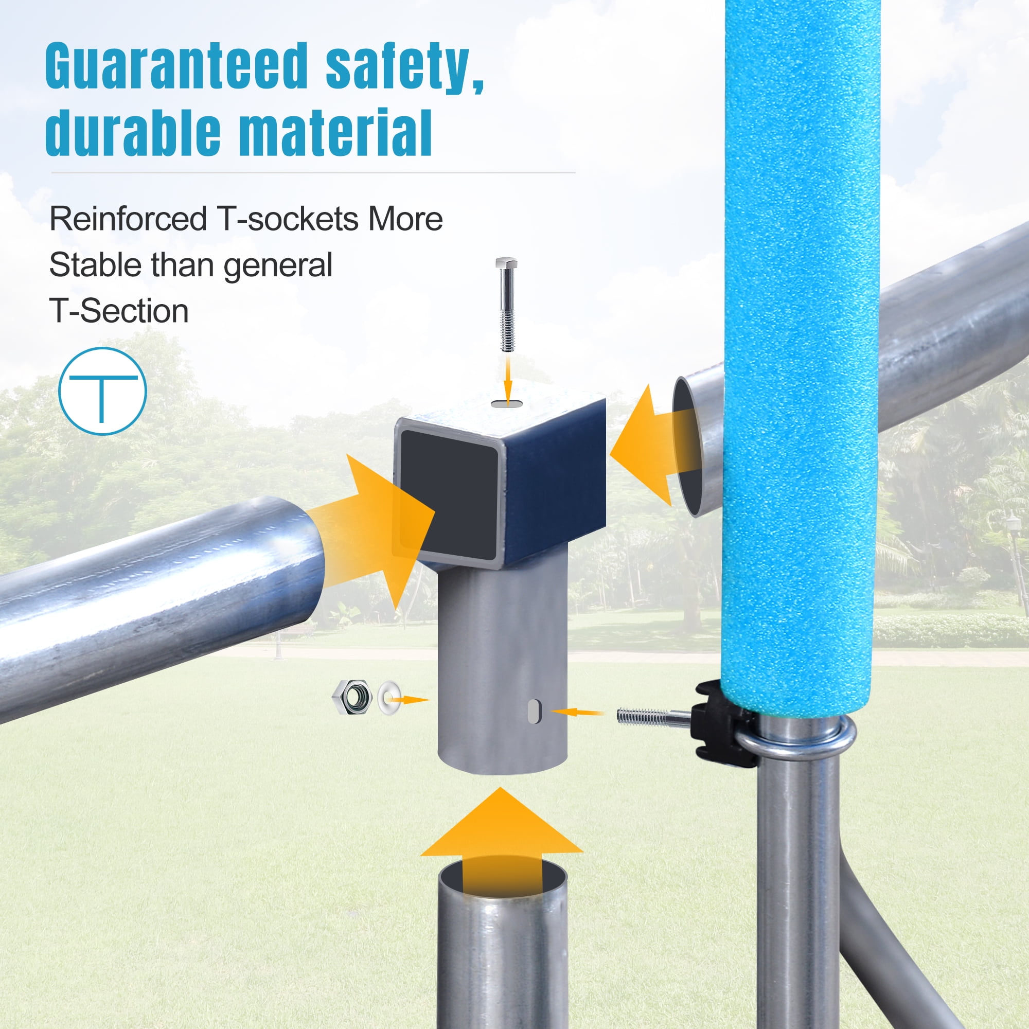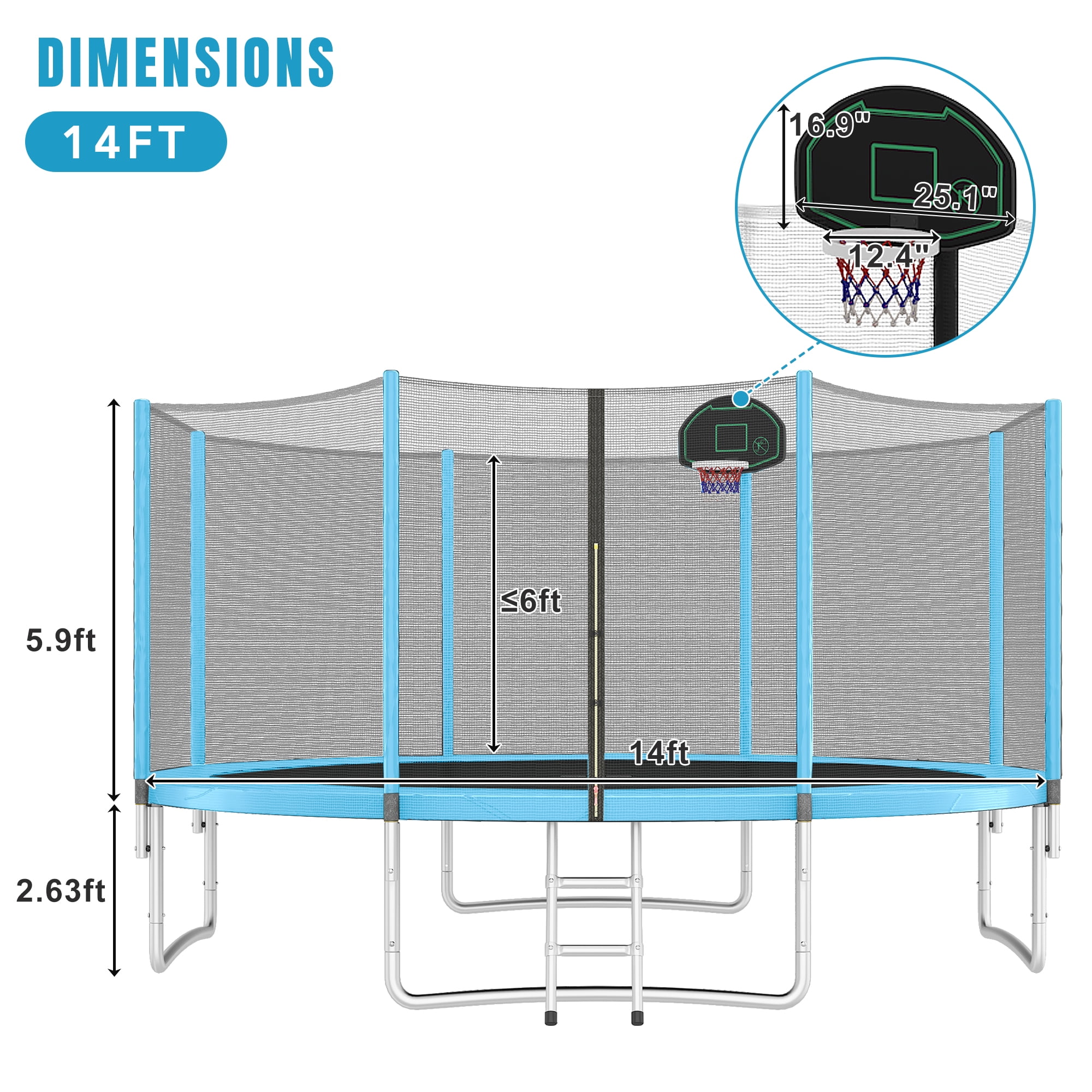 This 14FT trampoline features a 360-degree safety net that is securely attached to the jumping mat all the way around, reducing the risk of an arm or leg falling through. The full enclosure with a zipper door provides added safety and peace of mind. The high-strength trampoline mat is woven together, making it durable and soft on your feet. 80 galvanized springs are evenly stretched around the mat, ensuring a smooth and responsive bounce. The net pole height is 73 inches, and the mat/frame height is 31 inches.