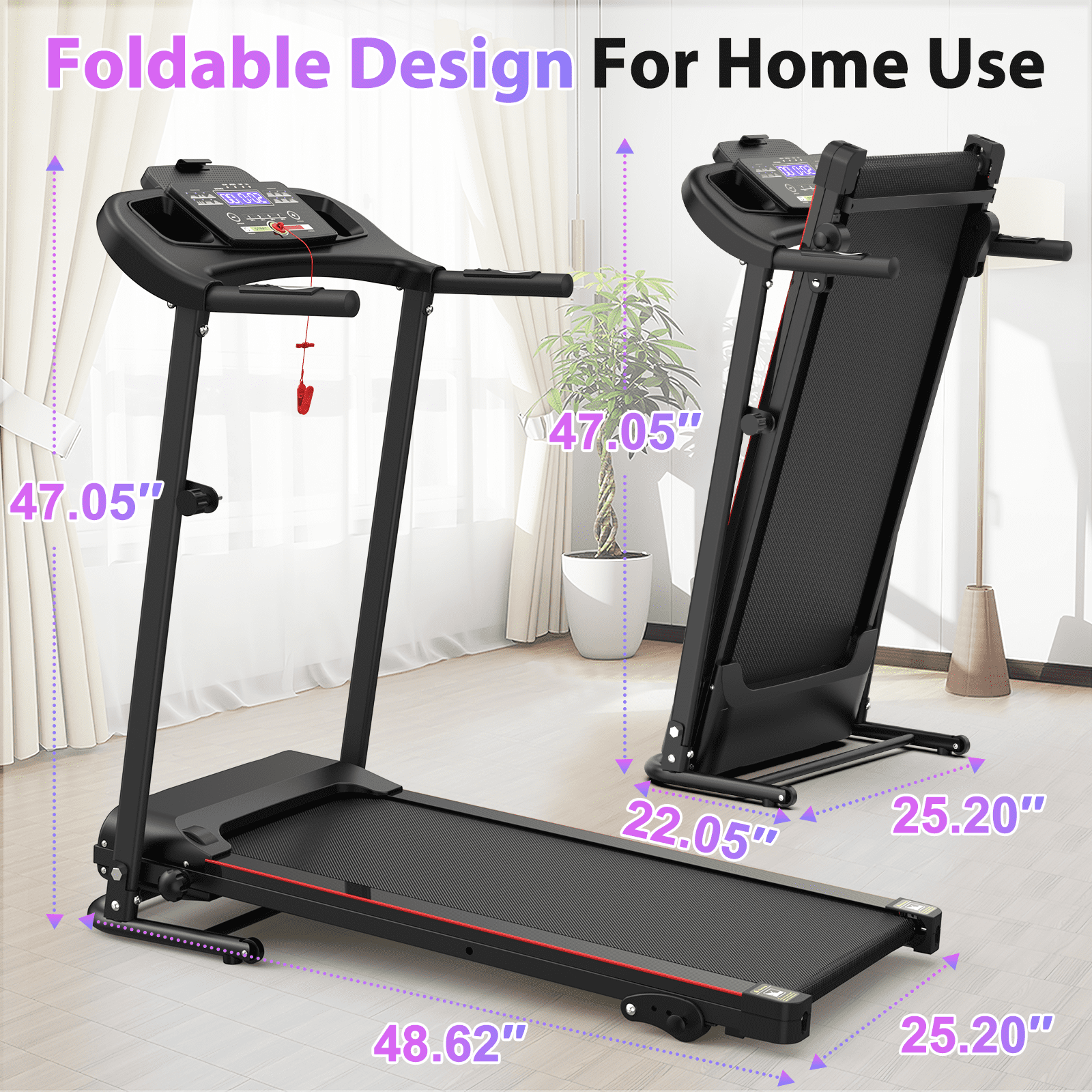 Speed range: 0.5 7.5 MPH for customizable workouts Manual incline for enhanced fatburning efficiency Weight capacity: Supports up to 265 lbs Powerful 2.5HP ultraquiet motor for stable operation Spacious running area: 15.55″ x 39.76″ for comfort LED display tracks speed, distance, time, and calories 5layer antislip belt for joint protection Lightweight and foldable for easy storage