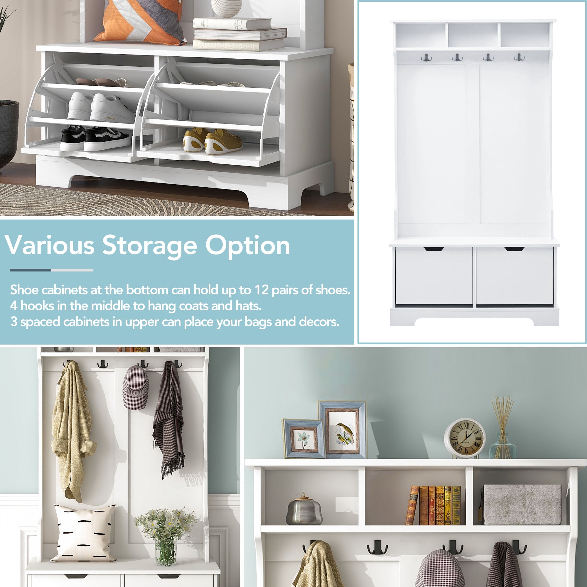 Euroco 2 Flip Shoe Storage Drawers Coat Rack Entryway Hall Tree Sleek, Minimalist Design: A modern, stylish coat rack and shoe storage solution that seamlessly complements any home decor 4-in-1 Versatile Functionality: Includes a coat rack, shoe bench, storage shelves, and flip-down hidden shoe cabinets for all your organizational needs Ample Shoe Storage Capacity: Holds up to 12 pairs of shoes, keeping your footwear neatly organized and easily accessible Multiple Hanging Hooks:Equipped with four hooks, perfect for hanging coats, hats, and accessories Spacious Upper Cabinets:Features three large upper cabinets, providing extra space for bags, decor, or other items, ensuring a clutter-free environment