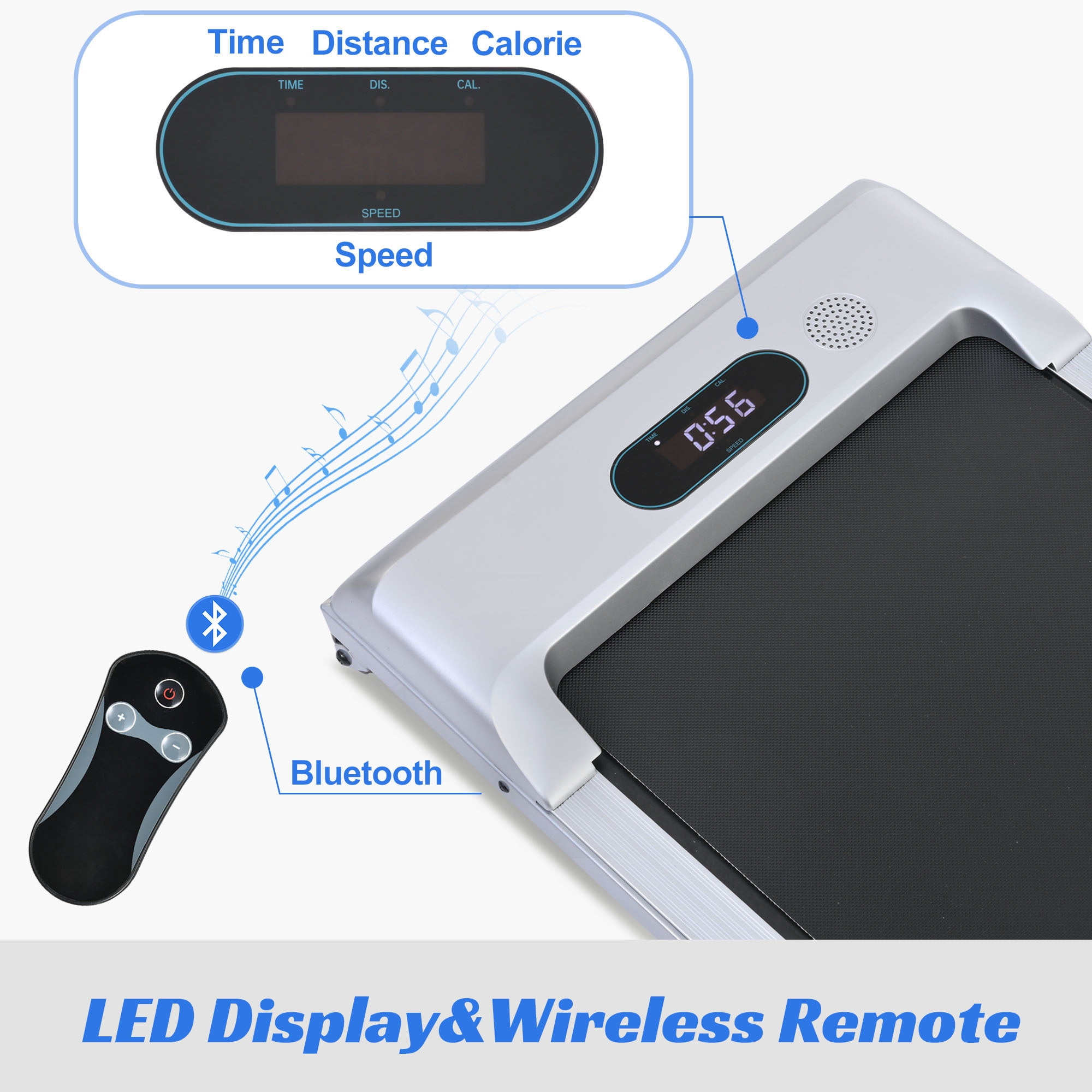 【2 in 1 Under Desk Treadmill】The independent remote control can efficiently control and adjust the running speed and improve the running safety. Available in 0.5 to 4 MPH Speed levels, this walking treadmill allow you to select different speed base on your physical condition and exercise based. Maximum weight: 500lbs. 【Quiet and Powerful Motor】With a 2.5 HP powerful quiet Motor,the electric treadmill is perfect for running, jogging, and walking in the comfort of your home. With a durable steel frame and multi-layer shield design, the under desk treadmill’s shock-absorbing and noise-reducing, making your running quieter, safer and more comfortable. 【Bluetooth Connection and LED Display】 The LED display clearly shows time, calories, step, speed and distance, monitoring your progress in real time and keeping your movement data at a glance. Connect the treadmill to your phone through Bluetooth, so you can play music while you are exercising. 【Non-assembly Design & Space Save Design】 This 2 in 1 treadmill arrives fully assembled and can be used directly after unboxing. Foldable design and transportation wheels allow for easy mobility and portable foldable treadmill for storage, fold it up and walk away in one easy step, perfect for home , apartment, office use. 【More Freely】39.37″x 14.96″ Widened Running Belt Making running or walking on this treadmill more freely. 5 layers non-slip running belt and Silica gel column support will greatly absorb shock to provide cushioning for knee, muscle and joints.
