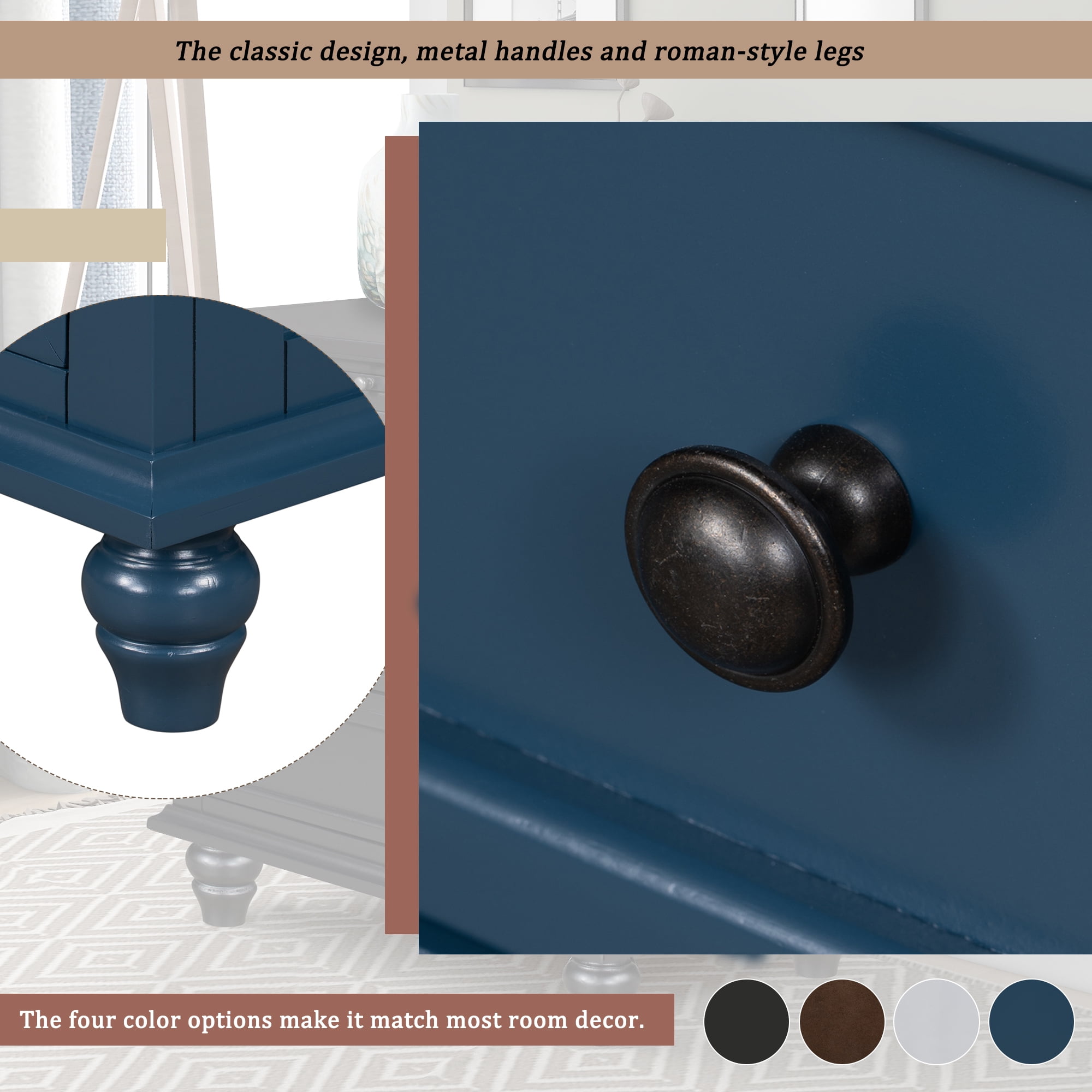 The end table features 3 spacious drawers for storing remotes, coasters, magazines and other household items.One pull-out tray to extend your top space.Pull-out tray is 40 LBS. Keep essential items within arm’s reach with this end table with storage. This beautiful piece stands perfectly next to your sofa. The classic design,metal handles snd roman-style legs.The four color options make it match most room decor. 【Stylish and modern design】Simple style looking of this storage cabinet matches well to the decoration no matter where it is. The simple and modish design of the bedside furniture matches perfectly with any furnishing style. You can find more fabric dressers of the same collection from EUROCO and make your purchase a bundle. 【Spacious Storage】This cabinet meets your diverse storage needs with plenty of organizing space.There are three drawers to provide sufficient storage space for your files, daily necessities, sundries and keep organized. Top board can place your favorite photos, vase, decorations, lamps or other knickknacks.It can be used as a bedside table, an entryway table, or a telephone table in the bedroom, living room, or study. 【Quality Construction】The cabinet is not easy to deform, scratch-proof, moisture-proof.The cabinet is made of solid wood and MDF, ensuring sturdiness and durability. 【Confidence in purchase】Our cabinet isn’t just a piece of furniture; it’s a statement of quality and commitment. Crafted by seasoned professionals, we’re confident in its durability. 【Dimensions】28*13.9*28.1 inches, it is designed to fit well in most room, offering sufficient storage without taking up excessive space.Embrace the perfect blend of utility and elegance. 【Easy Assembly】Simply assemble the legs, and it can be used, very simple and convenient. *Installation Precautions Tips 1:It is best to lay cardboard on the ground before installation to avoid staining or scratching the product. Tips 2:Try to avoid friction between product partes during installation, otherwise it may cause scratches that are difficult to remove. Tips 3:Do not tighten the screws 100% too early. *Notice About Color: Due to screen display or light problems, the color of the products received may be slightly different from the pictures, Please refer to the actual product for the actual color. About Size: Sizes are measured manually, there will be some slight differences.