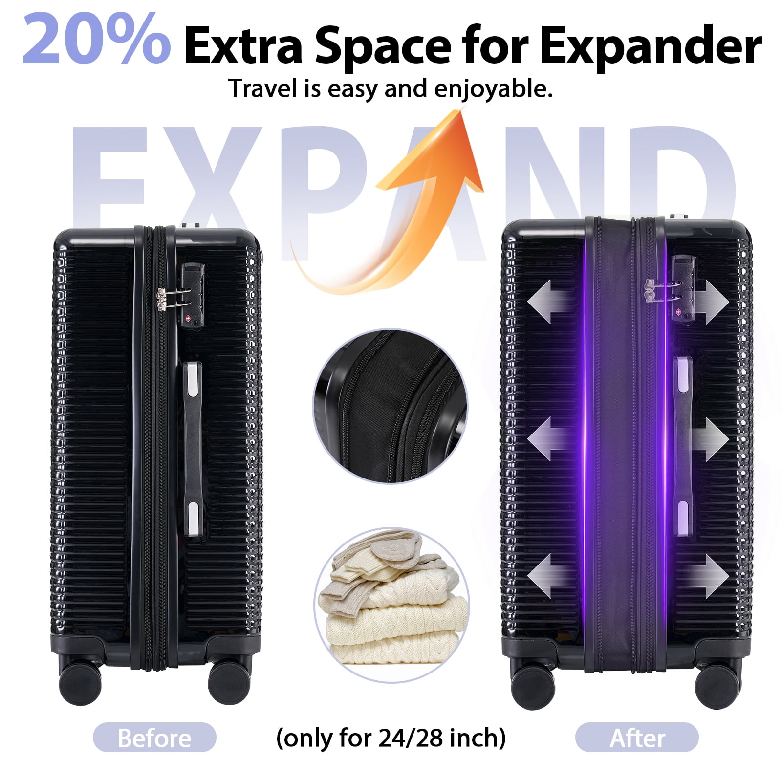 The luggage set adopts ABS+PC hardshell resists impacts, with textured dot patterns for scratch-proof style.Perfect for balancing durability, convenience, and sleek design across all travel needs.TSA lock which allows only TSA agents to inspect your bags without damaging the lock.360° silent spinner wheels ensure effortless mobility.And an adjustable telescoping handle allow you to quickly maneuver in tight spaces and it’s sturdier than most of the telescoping handle on the market.20inch and 24inch luggage is perfect for business and personal travel.