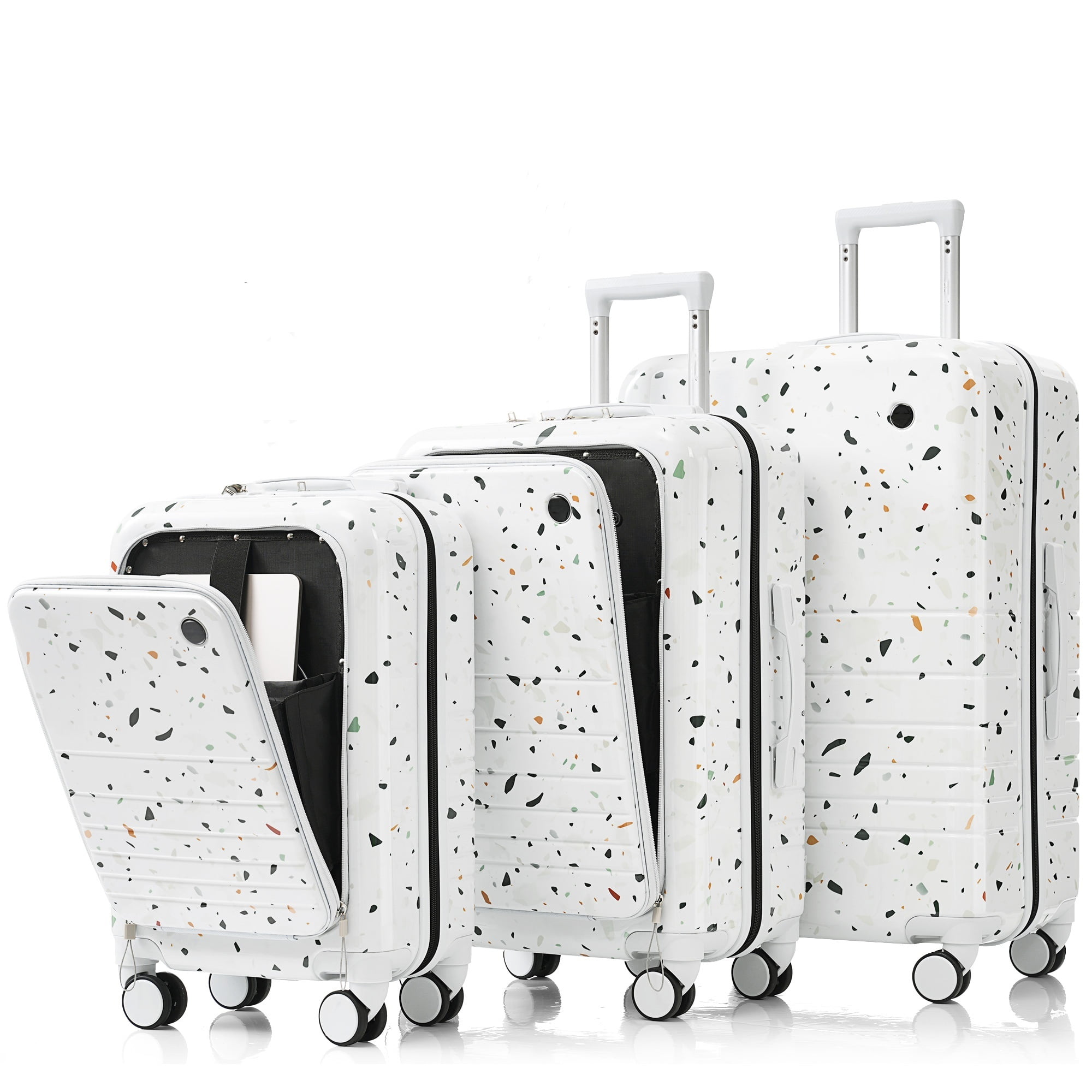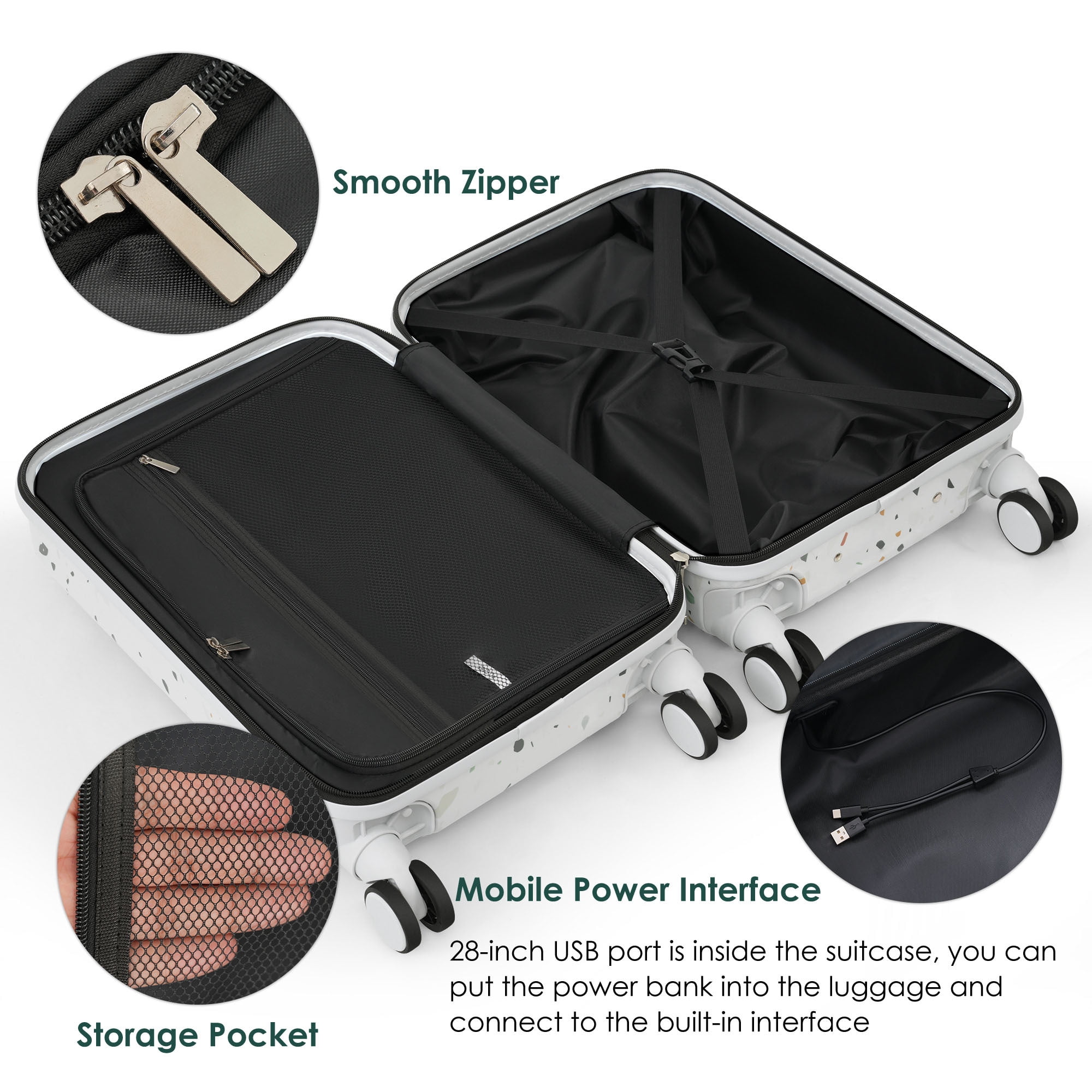 【Effortless Travel】Say goodbye to travel hassles with our 3-piece suitcase set featuring sizes of 20, 24, and 28 inches. The 20 and 24-inch cases open from the front for easy access to your belongings, making packing and unpacking a breeze. 【Smooth Maneuverability】Designed for ease of movement, each suitcase is equipped with 360-degree rotating wheels, allowing you to glide through crowded airports and busy streets with ease. Say goodbye to dragging heavy luggage behind you! 【Stay Connected on the Go】Keep your devices charged wherever your adventures take you. All three suitcases come with built-in USB ports (power bank not included), so you can conveniently power up your smartphone or tablet while on the move. 【Smart Organization Features】From a hook for hanging bags to a convenient cup holder for your beverages, our suitcase set is packed with thoughtful features to enhance your travel experience. Stay organized and enjoy easy access to your essentials. 【Durable and Reliable】Crafted from tough ABS+PC material, our suitcase set offers durability and protection for your belongings, ensuring they arrive at your destination safe and sound. Invest in quality luggage that stands the test of time.