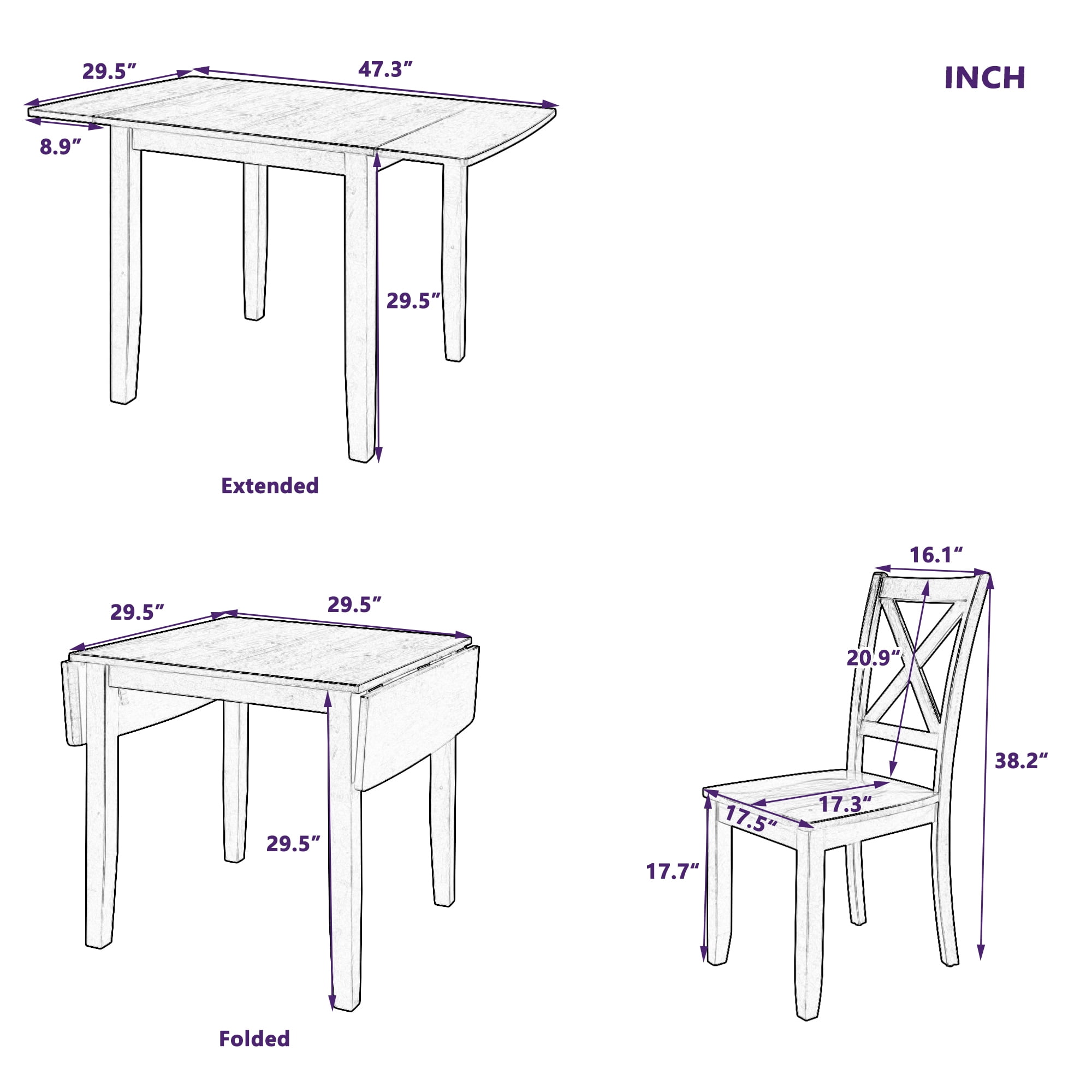 Euroco are committed to upgrading and updating dining table set products, using high-quality materials that are comfortable and more reliable, and will let you enjoy your cozy leisure time with your family and friends! 【Extendable Drop Leaf Design】Offer 2 great dining chairs and an attractive kitchen table,this refined dinette set will reinvent your dining room with its extendable drop leaf design. Featured with two foldable sides, this table provides you with the flexibility of creating more living space or eating space as needed. 【Premium Construction】Built with solid rubber wood legs and MDF for tops, this kitchen set is designed to last for years. The combination of a finished brown coating is ideal for indoor modern feelings while creates a sturdy dining experience. 【Small Places Solution】Perfect size for your small studio apartment or a small dining room. Both chairs can be tucked underneath the standard height table to space-saving storage when not in use. Just put the dining set standing against the wall to avoid crowded feelings. 【Easy Assembly&Maintenance】Simple assembly required, all hardware and instructions included in the boxes. Just need 30 minutes with 4 hands. With its refined coating, just a damp cloth will make the set clean. 【Dimensions and Warranty】Extended Dining Table: 47.3×29.5×29.5inch(LXWXH); Folded Dining Table: 29.5×29.5×29.5inch(LXWXH);Dining Chair: 17.5×17.3×38.2inch(LXWXH); Seat Depth: 17.3inch; Seat to Floor: 17.7inch. Warm notice that 2 boxes in total which may not come together. Please feel free to contact us if any issues.