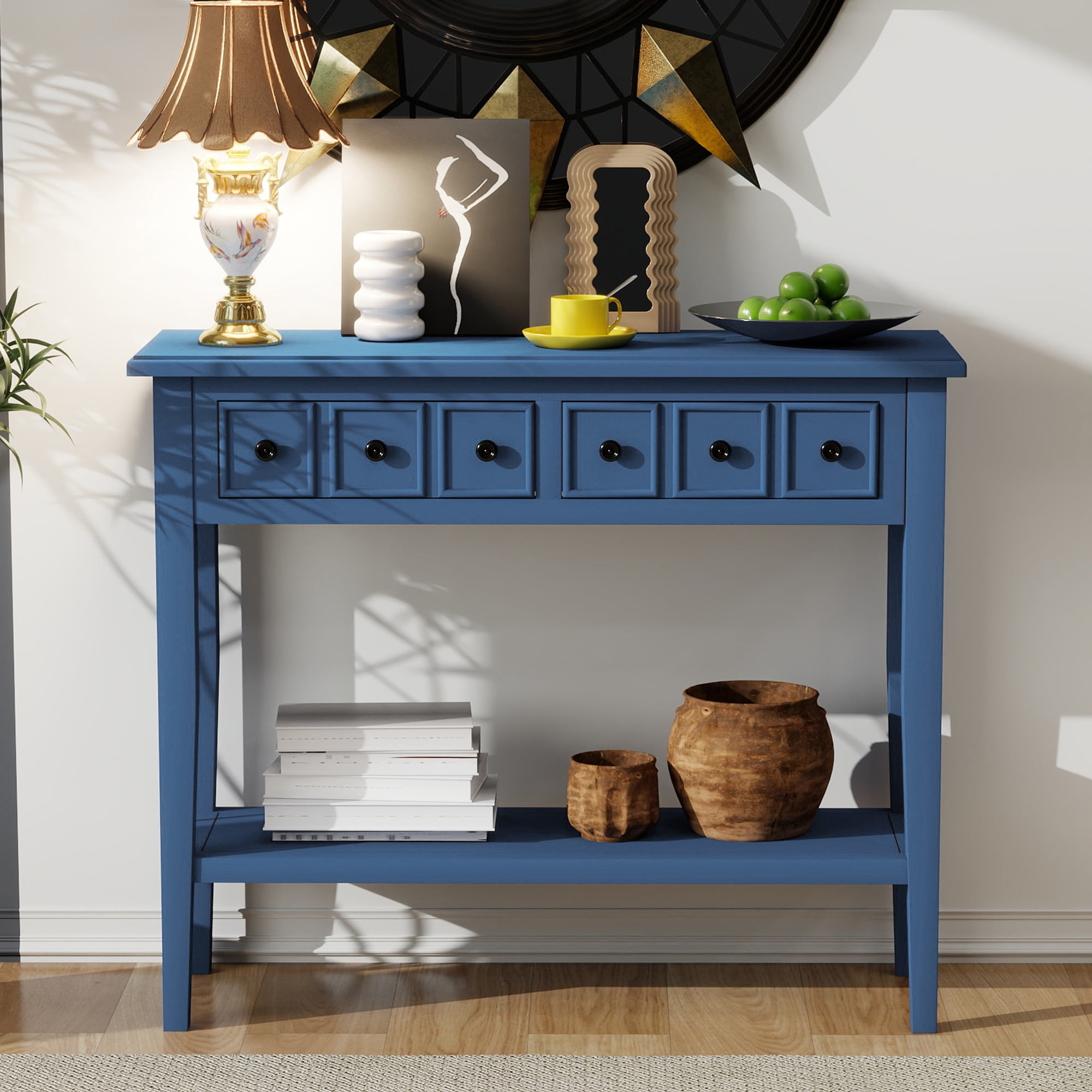【Rustic Design】This console table combines clean lines with a unique palette, bringing a fresh, stylish vibe to any home. Its design offers both practicality and aesthetic appeal, ideal for modern interiors. Available in five colors: teal, light tan, white, navy, espresso. 【High-Quality Materials】Made from superior MDF and rubber wood, with a birch veneer surface and polished finish, this table ensures sturdiness and durability. The painted surface is smooth and vibrant, making it an eye-catching addition to any room while being easy to clean. 【Storage and Display】The console table includes spacious drawers, perfect for storing keys, remotes, or small essentials. An open lower shelf offers extra space to display books, decor items, or personal treasures, keeping your space tidy yet stylish. 【Versatile Placement】This piece adapts seamlessly to various rooms, whether in an entryway, bedroom, or home office, which seamlessly complements modern and traditional decor. 【Partial assembly required】This console table comes with detailed instructions, and it can be installed step by step following the instructions, which can help you complete the assembly as soon as possible.