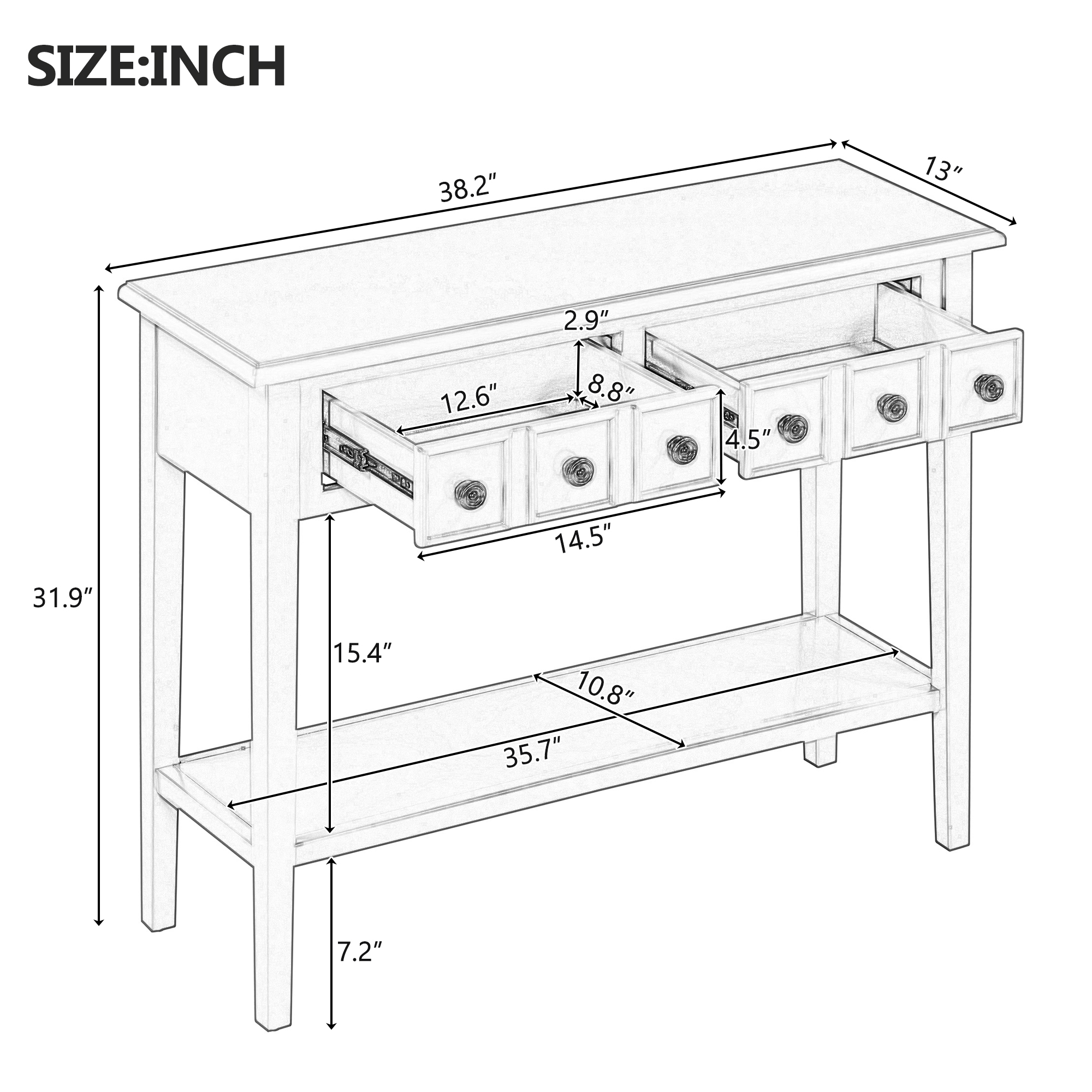 Clean lines, unique palette, and rubber wood base make up a contemporary theme, making this console table will fit most the modern interiors, which is perfect to be placed in your hallway, front door, living room, foyer, entrance.Two storage drawers provide ample storage space to store magazines, glasses, cosmetics or other personal items.The bottom shelf is perfectly suitable for placing storage baskets or higher display items as an additional storage space.Could put stylish mirror, desk lamp, vase or other commonly used items on the table top, decorate the desktop and make your living space more clean and tidy.The thick bottom board base further enhances the stability and sturdiness,which ensures long-time use.