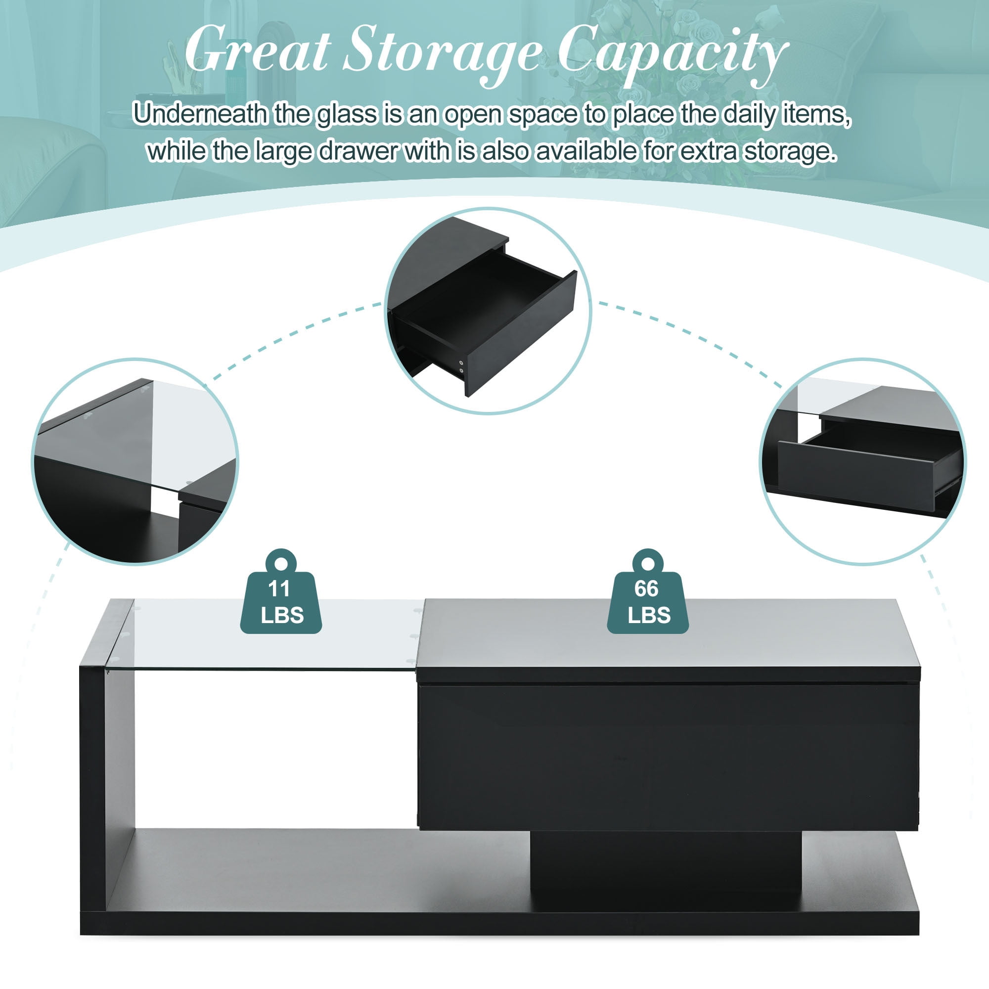 【Modern Style】A perfect combination of wooden structure with high-gloss surface and tempered glass brings the touch of warmth and stylish to any living space. 【High-quality Material】The glass top is made of 5mm tempered glass to prevent from breakage. The drawer uses metal glides to ensure smooth use. 【Great Storage Capacity】Underneath the glass is an open space to place the daily items, while the large drawer is also available for extra storage. 【Stable & Durable】To ensure the stability, the main body is manufactured of particle board. High-gloss UV surface ensure it’s waterproofing. 【Dimensions】Overall size: 39.3”Lx19.6”Dx12.7”H. Load-bearing: 198LBS. Notice:The plastic film for protecting UV from scratches should be teared off before put into use. If there is light dust on the edge, it can be wiped with a wet rag.