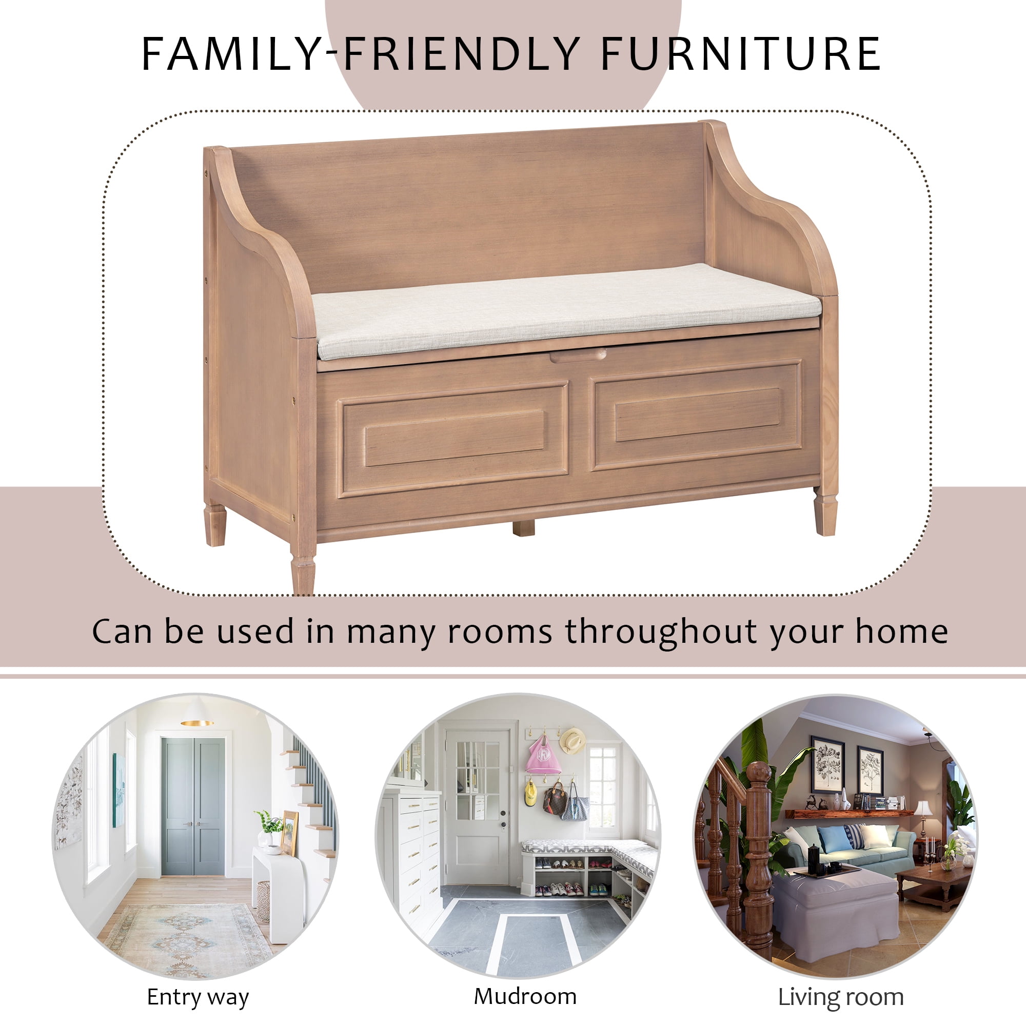 EUROCO 41.9″ Rustic Storage Bench, wood Entryway Multifunctional Storage Bench with Armrests, Safety Hinge, Lift Top Storage and Removable Upholstered Seats for Living Room, Hallway, Brown