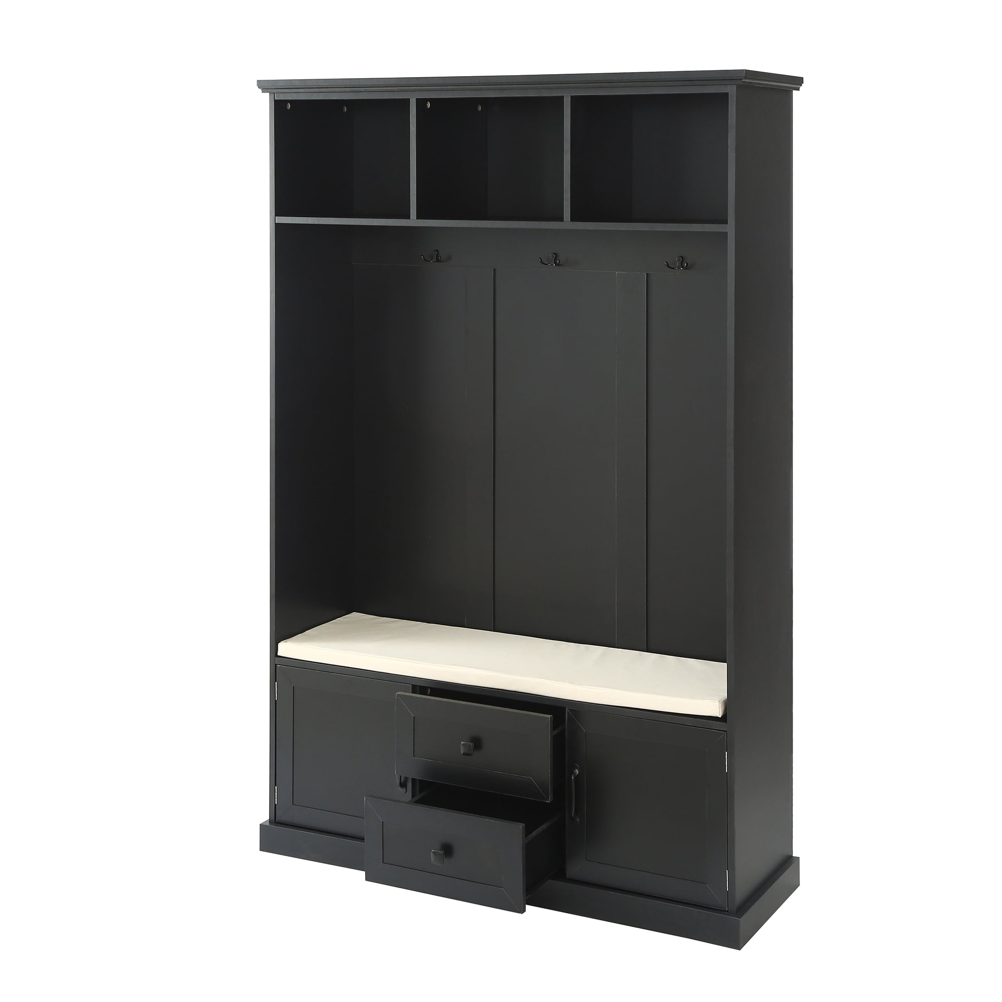 Euroco are committed to upgrading and updating hall tree products, using high-quality materials that are convenient and more reliable, and will leave your home decor more modern! Classic details give our Storage Locker a traditional look, but clean lines and a modern finish bring this hall tree into the now. Generous, sweeping crown molding accents the top of the case; 3-open cubbies lie below it, awaiting your display items, books, accessories and more. The open area beneath the cubbies features elegant beaded-board paneling, 3-double hooks for coats and bags, and a comfortable seat with cushion. The grand finale of this mudroom storage piece, 2-drawers and 2-doors that allow you to store away even more necessitie. 【Decorative】A hall tree which decorate your entryway and organize your coat, shoes and any other belongings, make your entryway tidy and become a good helper for your home life. 【Saving space】Three open storage shelves, 3 metal double hooks, with shoes bench and shoes storage space in the bottom, maximize storage function of your entryway,avoid clutter in the home,at the same time save your space of your home. 【Detailed instructons】Including assembly manual and all necessary hardware and fasteners. Components are pre drilled and pre cut for assembly. 【Sturdy】 For such a tall product,falling prevention is critical in order to prevent accidental injuries on a daily basis.That’s why we’re equipped with a sturdy anti-dumping device.You can refer to the manual for the specific operation method. 【More details】Hardware packs and instruction manual will be shipped with the product to users in one parcel. The instruction manual gives logical and clear illustrations for installation, and users can install this cabinet without any problem as long as they follow the steps rightly. Users need to get your own electric drill and take about 2 hours to install this coat rack completely if there are two adults.
