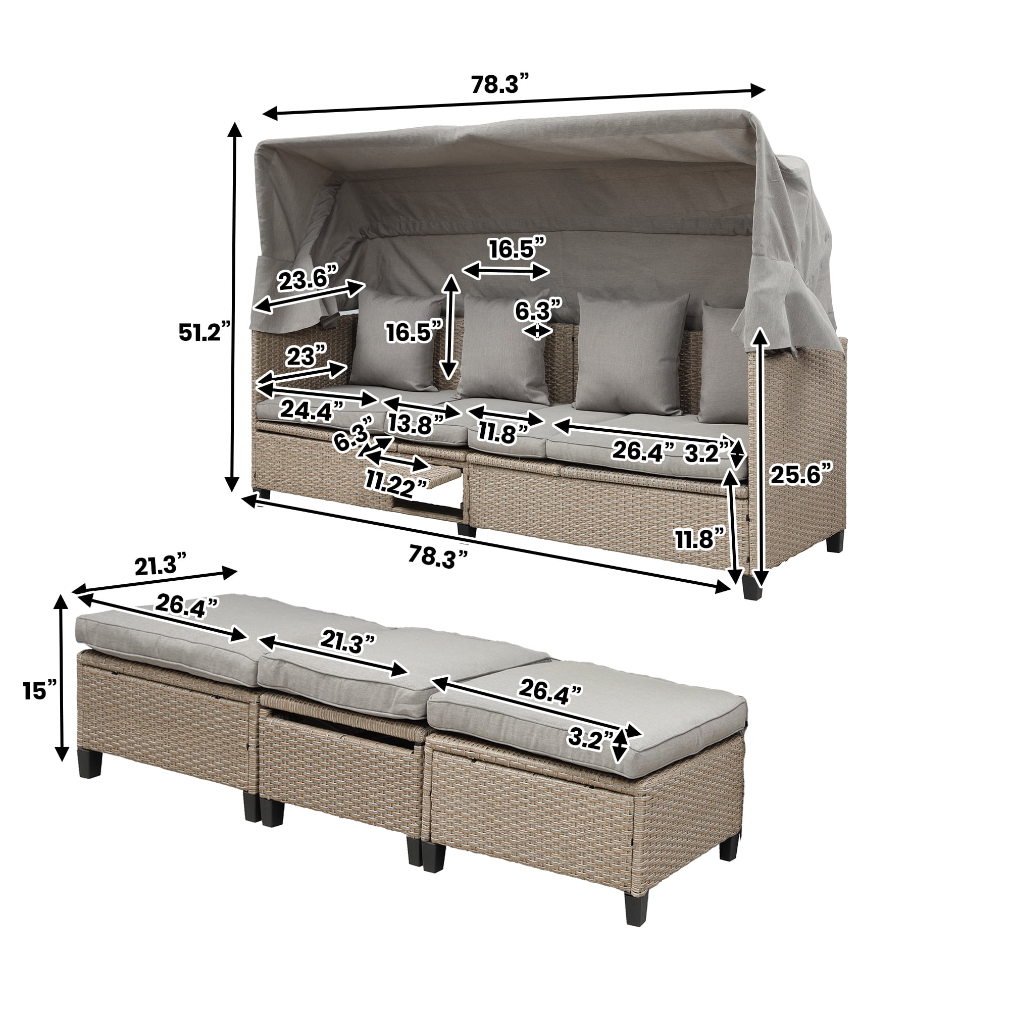 Euroco are committed to upgrading and updating patio furniture set products, using high-quality materials that are comfortable and more reliable, and will let you enjoy your life. 【Timeless & Compact】Update your outdoor space with this modern, yet classic patio set. This wicker sofa set features a natural woven pattern and a sleek silhouette which will never go out of style. Specially designed to fit in limited space, turn the matching tables upside down on the sofa to create a compact and convenient way to store the set away. 【Effective UV-Resistant】This sofa set is an ideal choice for summer days with strong sunlight, the retractable canopy helps to block out harmful UV rays and provide cool shade when you stay outdoors. The weather-resistant rattan is coated with UV-resistant material to protect sensitive skin and eliminate the risk of skin cancer. 【Highly Adjustable】The user-friendly vertically adjusting top ensures your needs are met no matter the situation, allowing you to place food, beverages or books close at hand. The sofa provides 3 reclining positions in 15 degree increments to choose from, adjust the sofa upwards or downwards to support your back and legs comfortably and enjoy a luxurious lounging experience. 【Quality Craftsmanship】This sofa set includes a 4-seat sofa and 3 identical matching ottomans(one can be a table), with all pieces constructed with a solid steel frame and high grade rattan to ensure long-lasting use and to preserve appearances. The gray cushions are upholstered in tough polyester fabric to resist spills and stains, and are jam-packed with thick sponge for the utmost seating comfort. 【Simple Assembly】With canopy:78.3×23.6×51.2inch(LXWXH). 2 boxes in total which may not come together. For more size, please refer to size image. Simple set up with clear instructions provided. If you have any questions or concerns, please feel free to contact us.