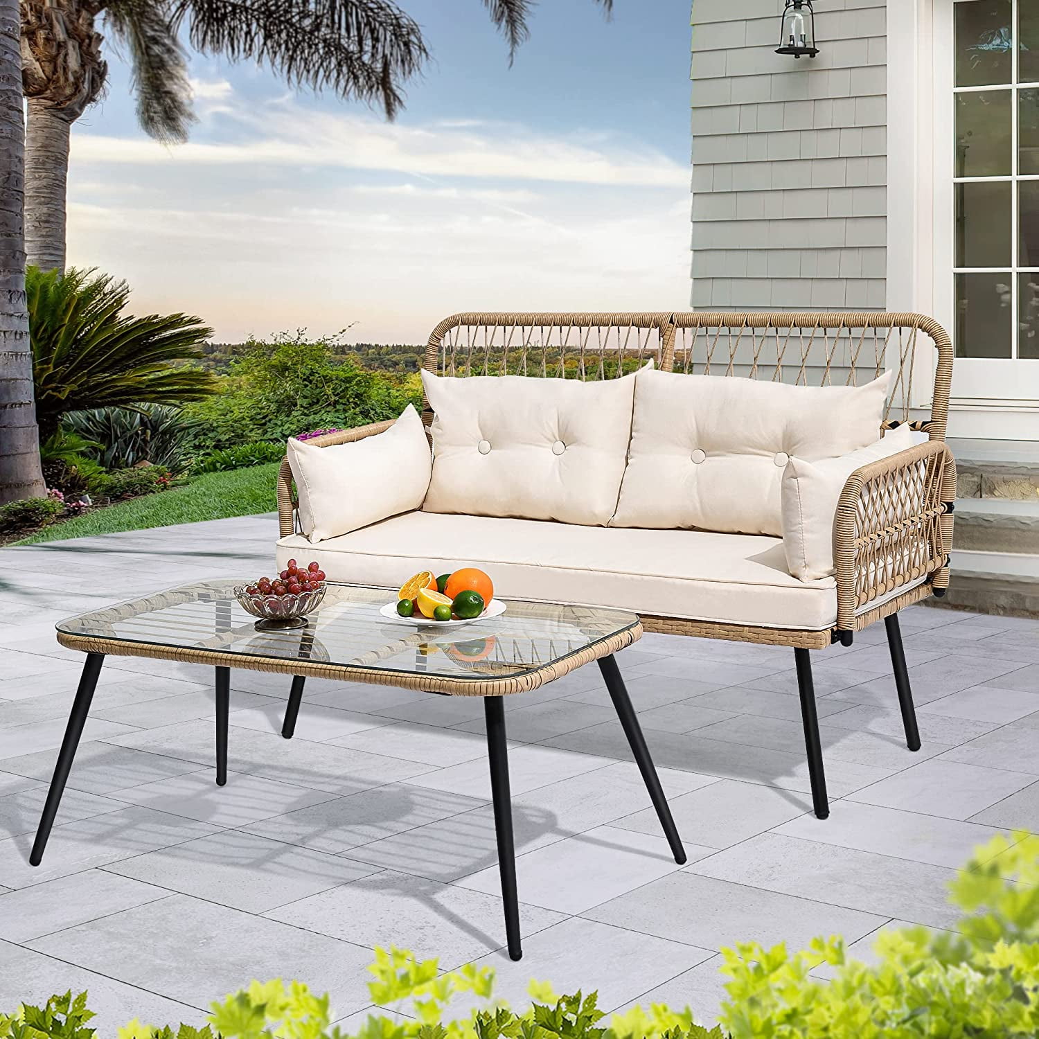 Weight CapacitSofa Weight Capacity: 500lbs (Each Seat) Table Weight Capacity: 176lbs Material:PE Rattan+Steel+polyester Cloth+foam(1.7lbs/cu.ft) To remove dirt and debris, vacuum with a dust- brush attachment or use a dry paintbrush. Clean with a mild soap solution, scrub with a sponge, rinse with cold water and dry completely. When outdoor furniture is not in use, we recommend covering all the furniture to protect it against the elements. Please read assemble manual in advance. Please do not over-tighten nuts, as this may cause distortion or breakage. Items may slightly differ from photo in terms of color due to the lighting or your monitor’s display. Manual measurement has been used, there may be some reasonable error.