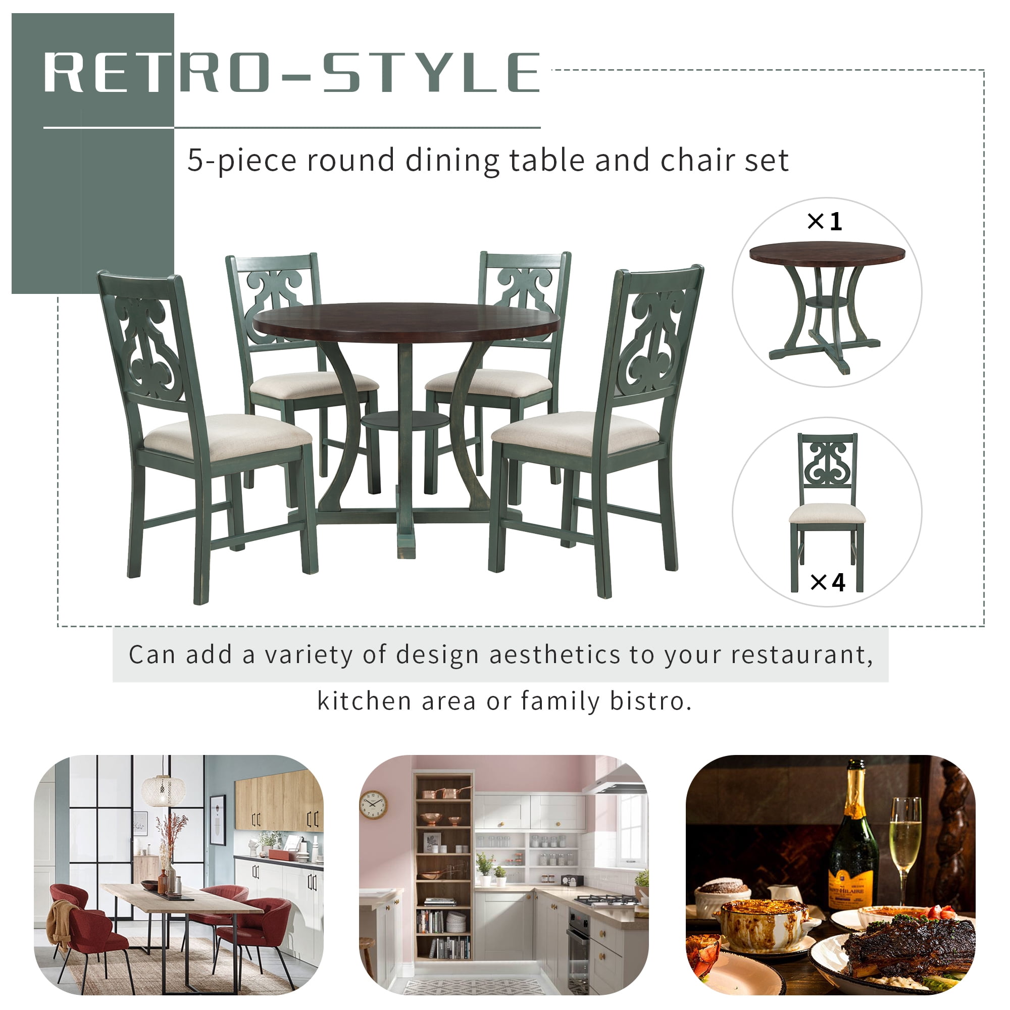 Euroco are committed to upgrading and updating dining table sets products, using high-quality materials that are comfortable and more reliable, and will let you enjoy dining time with your family and friends. 【Retro-style】 This is a set of dining table and chair furniture with hollowed-out carving patterns on the back of the chair. The fresh, simple and retro design is the crowning touch of your restaurant. The wood grain details of the table top and the soft cushion filled with high-density NEW FOAM perfectly combine this set of furniture, which can add a variety of design aesthetics to your restaurant, kitchen area or family bistro. 【Unique Design】Round table top with no sharp corners, which helps to protect your children and the elderly. The legs of the table are composed of four bent columns and two base rails, with a small shelf in the middle, measuring 12.4*12.4 inches. The unique design not only adds a beautiful table to your living room, but also saves space and creates an ideal living room for you. 【Comfortable Cushioned Seat】The seat cushion is made of high-quality high-density foam material, with higher comfort and a thickness of 60 mm, which provides you with a soft ride experience and allows you to enjoy delicious food in a relaxed state. Exquisite retro hollow chair back provides you with reliable support, and unique table foot design helps to protect your floor. 【Premium Quality】The tabletop is made of high-quality MDF, which is smooth and durable. The legs of the table and chairs are made of LVL, which are strong enough to support you and your family. Weight capacity of table: 300 pounds, Weight capacity of chair: 350 pounds. 【Full/Partial assembly required】This dining table set comes with detailed instructions, and it can be installed step by step following the instructions, which can help you complete the assembly as soon as possible.