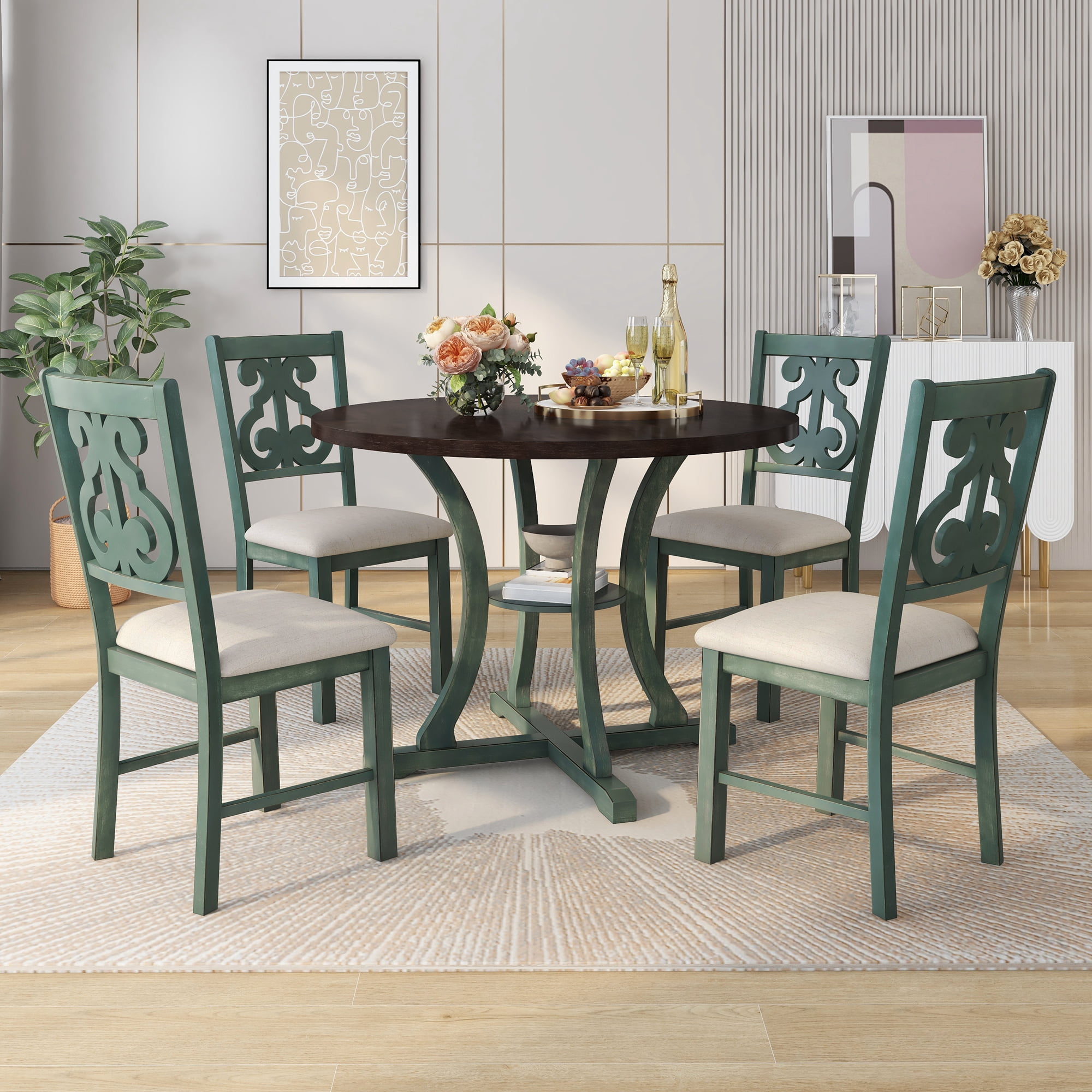 EUROCO 5-Piece Round Dining Table Set for 4, 42″ Retro Kitchen Table Set with 4 Upholstered Chairs, Storage Shelf and Unique Legs for Dining Room and Kitchen,Antique Blue