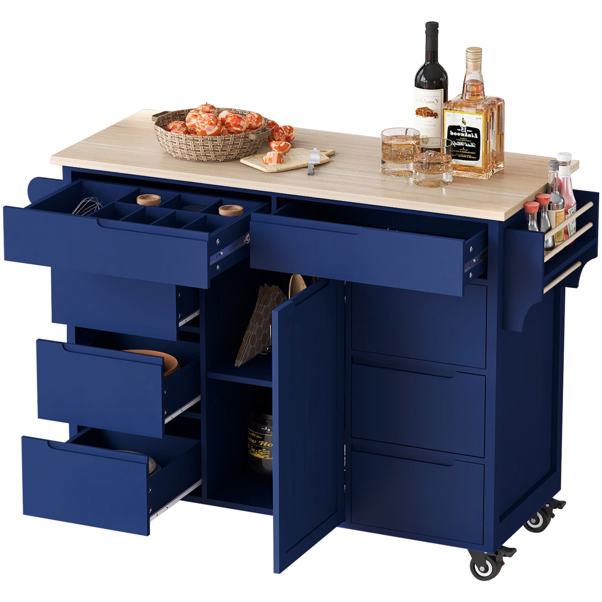 EUROCO 53.1″ Kitchen Islands Cart with 8 Drawers ,Rolling Kitchen Cart with Storage,Kitchen islands with Flatware Organizer &Towel Bar & Storage Rubber wood top
