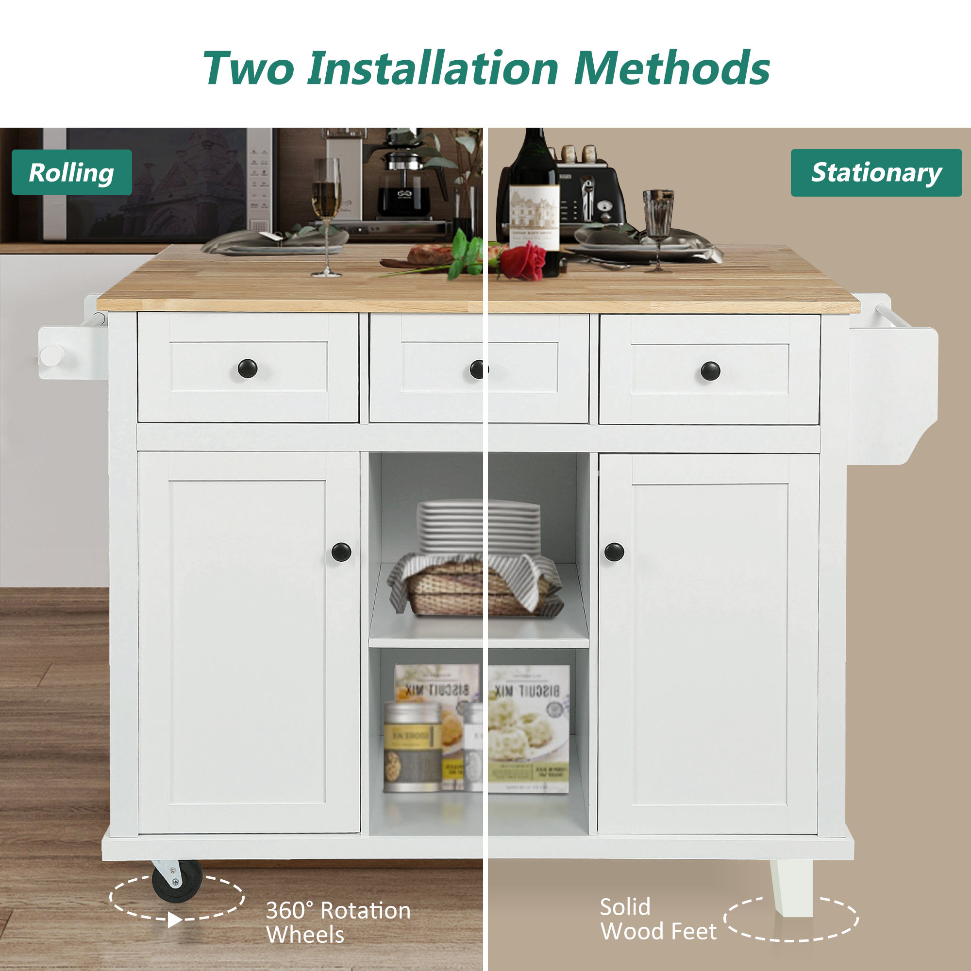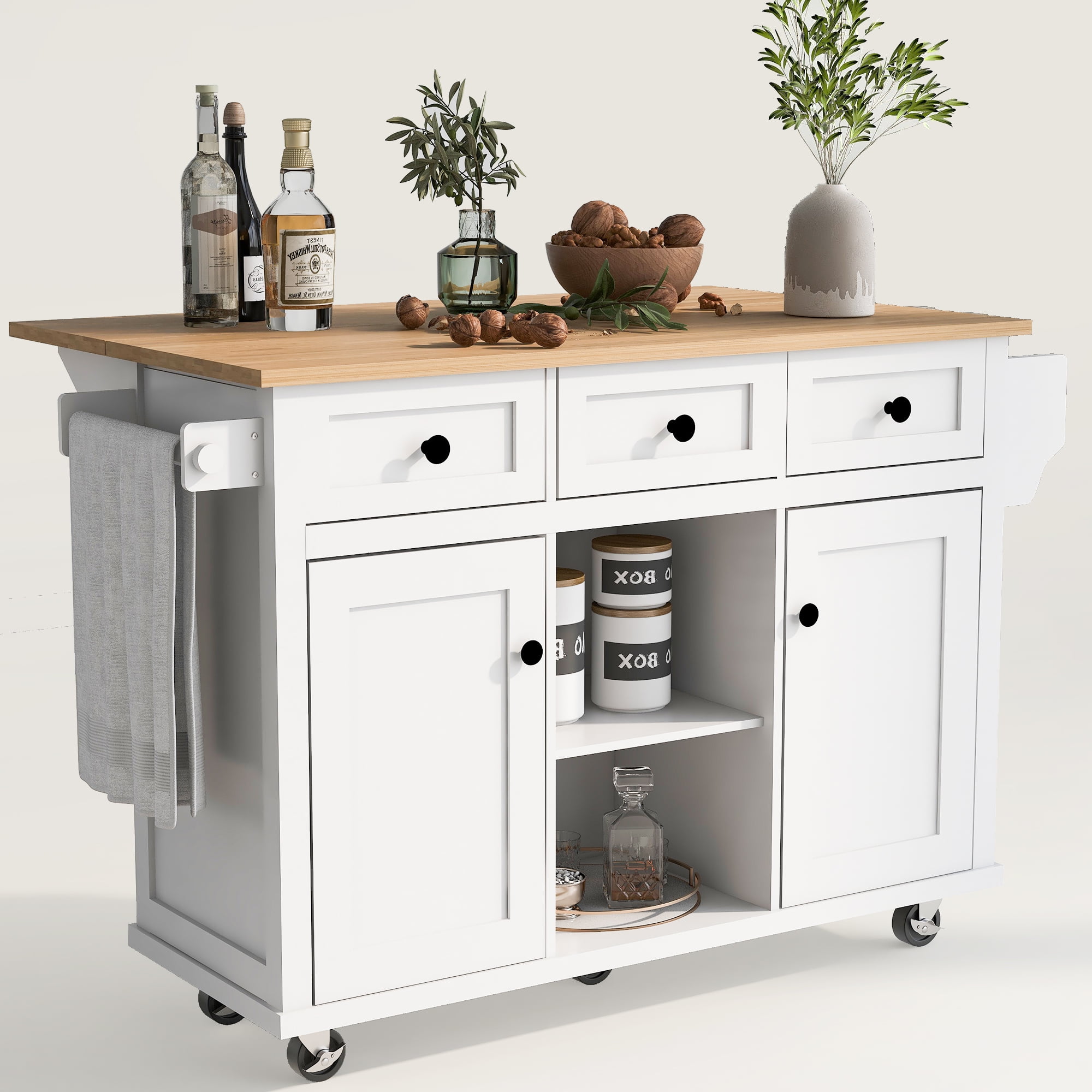 Euroco are committed to upgrading and updating kitchen islands products, using high-quality materials that are durable and more reliable, and will provide you with spacious storage space! This delicate kitchen island will bring convenience and more living space to your life.Put everything in its place with a beautiful combination of storage space. And it provides you with four solid wood cabinet feet, which can be replaced when you don’t want to use wheels.This piece offers a stunning contemporary style and functional design that gives you plenty of options to effortlessly and efficiently store your kitchen accessories. Crafted with sturdy wood and rolling casters, our kitchen cart brings a fresh yet timeless look for all to enjoy. 【Internal storage racks】Cabinet door internal storage racks inspired by refrigerator door,Space is adjustable to practical uses with removable shelves. the storage is greatly utilized, occupies a little space, making it perfect for kitchen,dorms, offices, bedrooms, dining room. 【Drop-leaf】It has a large table top, the island can be used for meal prep or it can be used as a dining table on two tables,Moreover, putting down the drop-leaf will save you more space.Desktop and falling leaf are metal support frames, which are more solid and durable. 【Rolling Smoothly】Kitchen island with five smooth rolling wheels make it easy to move freely. 2 wheels have emergency lock brakes. Brake design allows the wheels to be locked in a stable position at will. 【Stationary Storage Islands】This kitchen island also has four solid wood cabinet feet and a middle support plate. If you don’t need to move this cabinet, you can change the wheels into cabinet feet. 【Large storage space】Three storage drawers and adjustable shelve accommodate a variety of kitchen items.You can put small kitchen appliances and tableware into the cabinet and drawers to make your kitchen more neat and organized. Includes a towel rack and a spice rack to keep your desk tidy. 【Simple assembly required and dimensions】This kitchen island cart comes with step-by-step assembly instruction and numbered parts and hardware to make sure you can set up it without difficulties. An Allen Key is also included for your convenience. Overall Product Dimensions:L53.1xW29.5xH37.2 inches Package included: 1.Internal storage racks 2.Drop Leaf 3.Solid Wood Desktop 4.Adjustable Shelves 5.Three Drawers 6.Lockable Rollers 7.Spice Rack 8.Towel Holder