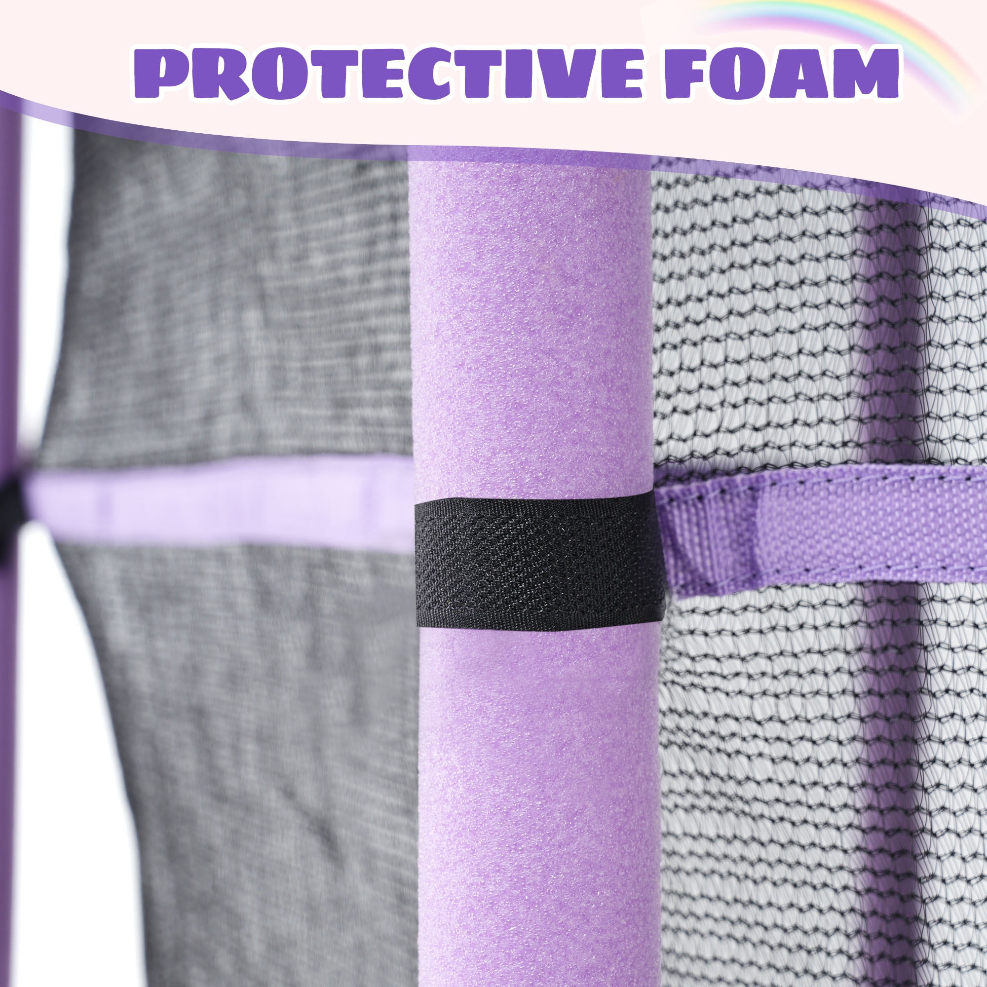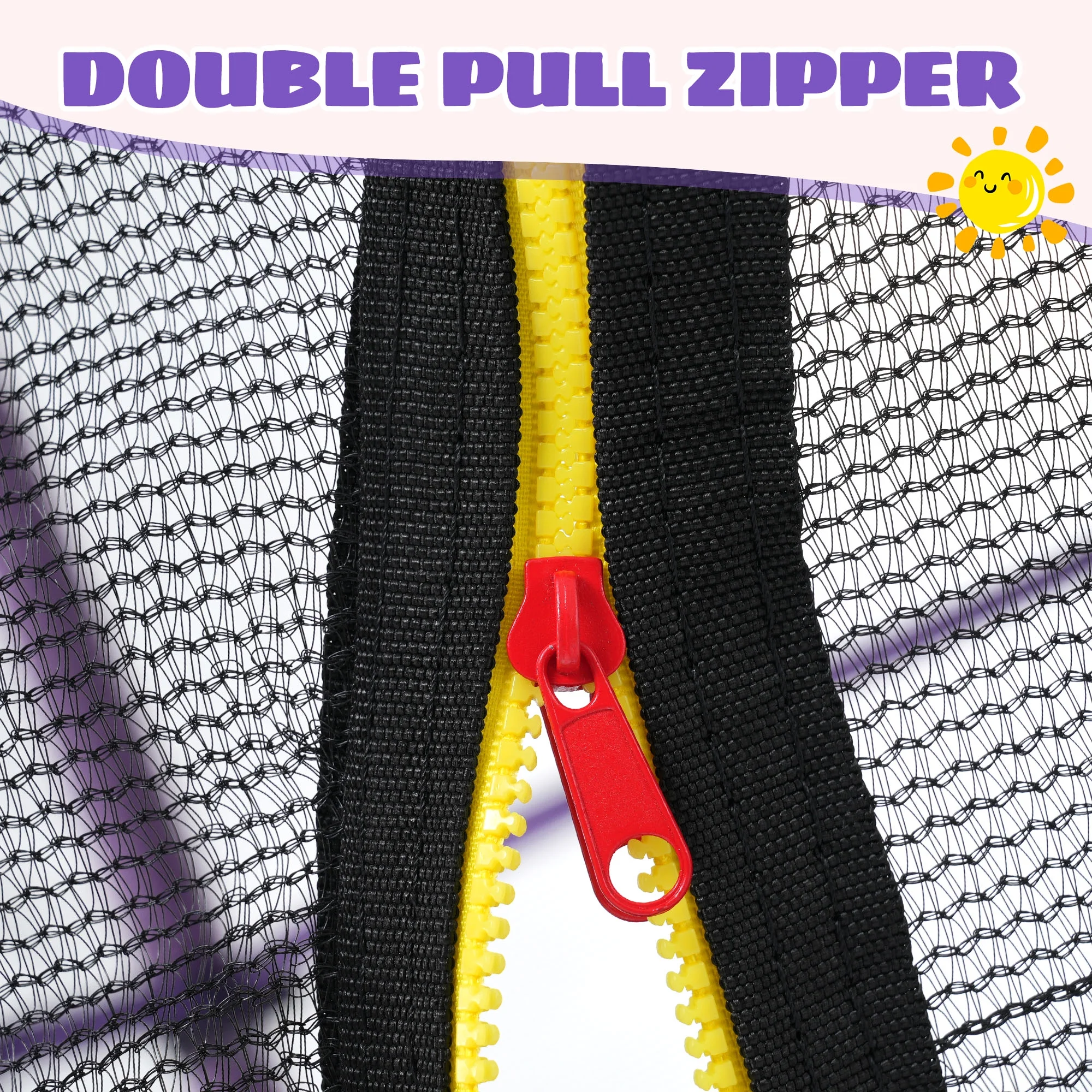 This 55″ kids trampoline is complete with safety details, including the 360 degree enclosure net and safety pad around the frame that creates a safe roomy space for fun activities, while the double pull zippers allow for easy access in and out of the trampoline. Foam padded poles buffer unexpected collision while jumping, and the mesh net bottom is sewn to the jumping mat to eliminate gaps between.