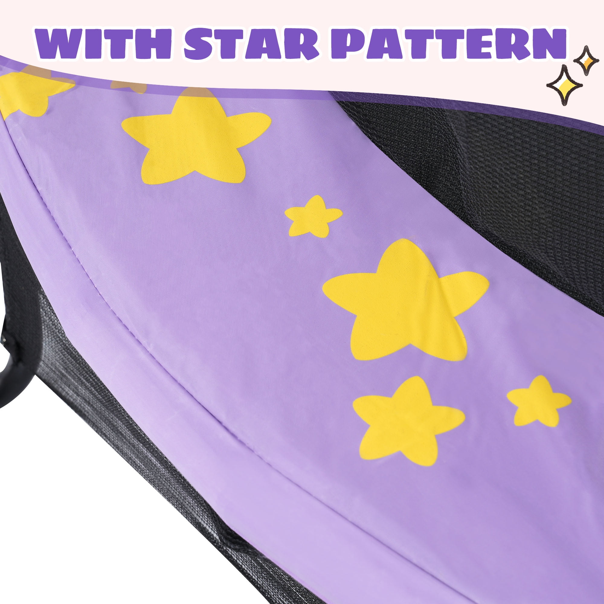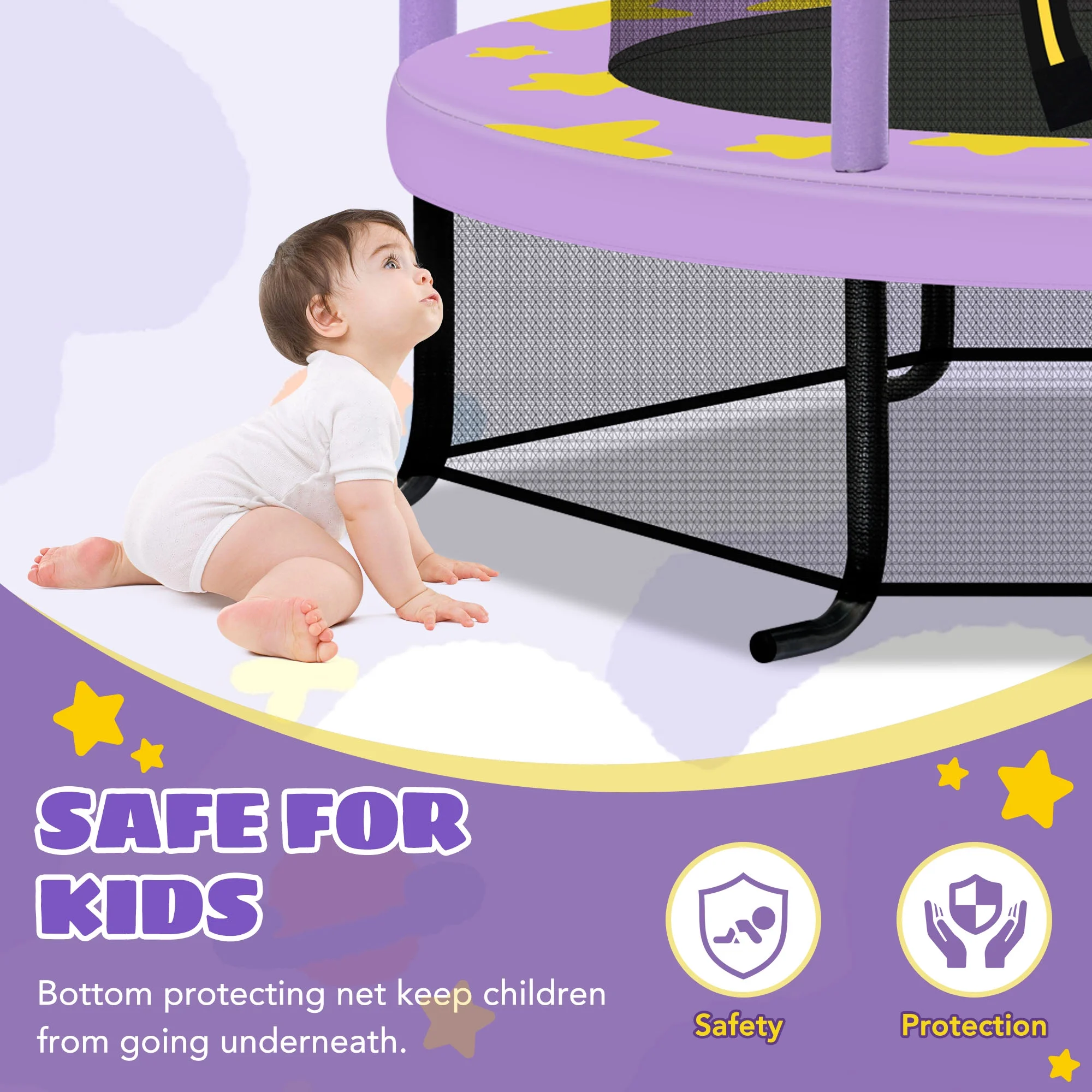 [Durable & Stable Structure]Featured in a steel frame with reinforced L-shaped legs, this 55 kids trampoline holds up to 100 lbs and effectively prevents tipping over even stepping on the edge of the trampoline. With its see-through design, you can keep an eye on your kids while occupied by other things. What’s more, the lower net can stop your kids from crawling underneath the trampoline. [Superior Bouncing Experience] Equipped with 30 tension ropes of premium elasticity and non-deformation, our kids trampoline promises a long-time use. Crafted with high-density and wear-resistant PP material, the jumping mat creates a safe and ensuring world for kids to have endless fun. [Always the Best Gift for Kids] Decorated with adorable star pattern in 2 colors, this 55 trampoline will be an eye-catching play set for your room or backyard, which also serves as a great addition to your indoor and outdoor activity space for the family fun time. [Easy Assembly & Relocation] The package includes all the tools and detailed instructions needed for easy assembly. With a net weight of just 22 lbs, this trampoline can be easily moved indoor or outdoor, any place your kids like.