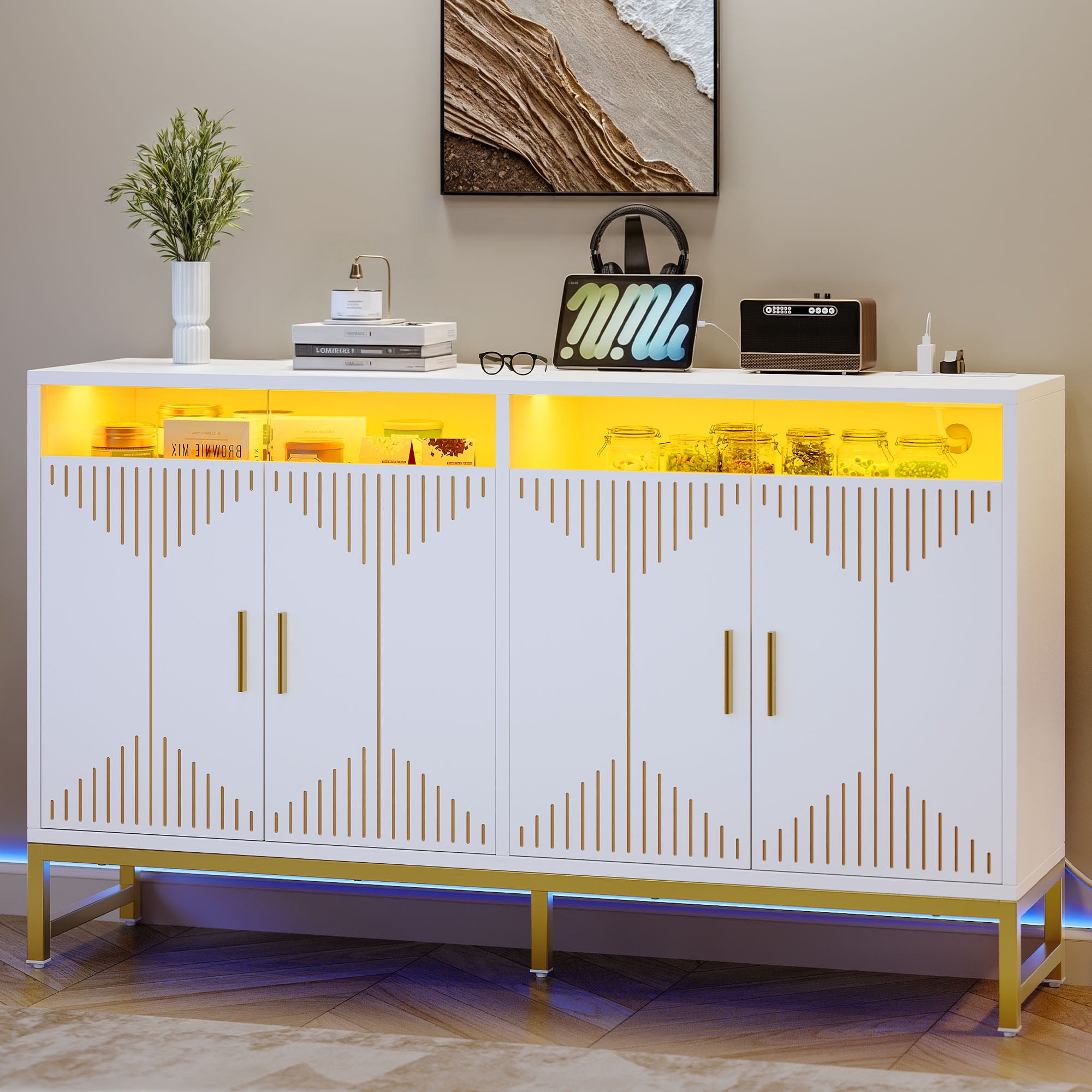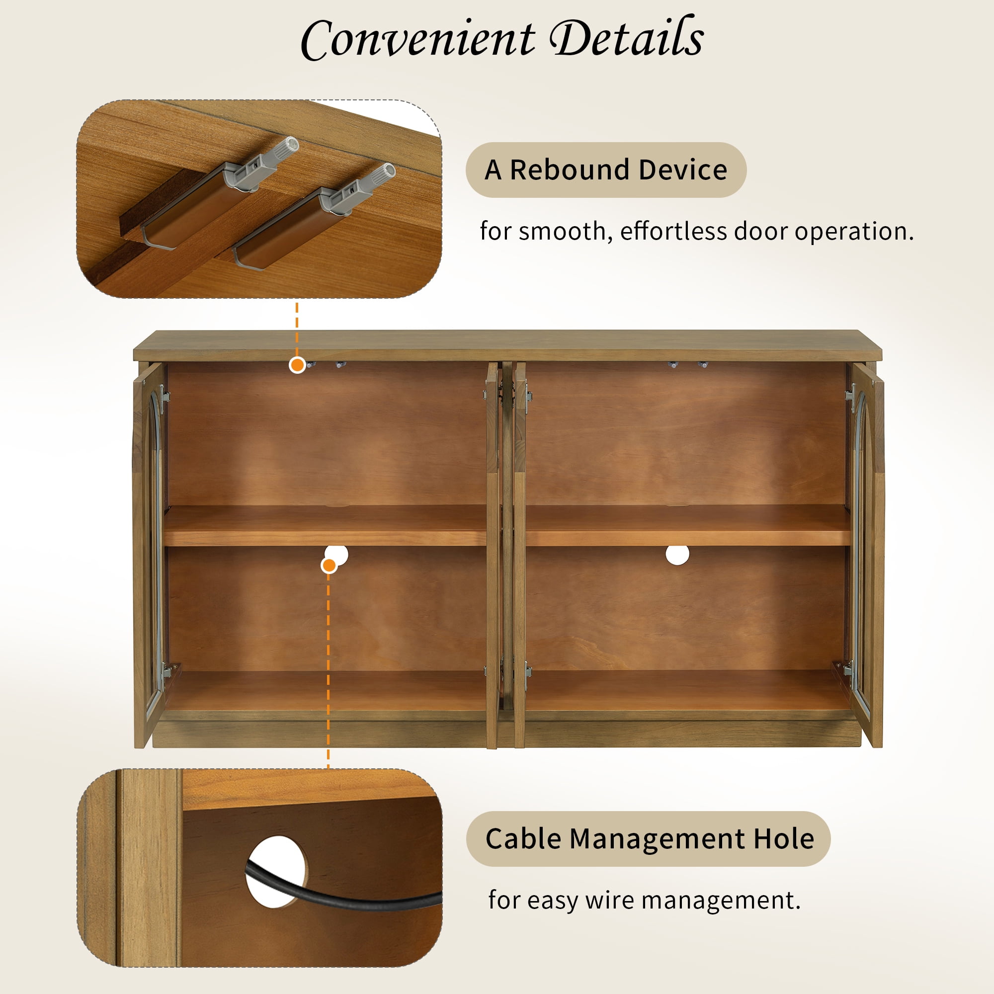 【Elegant Design】This stylish buffet cabinet features arched glass doors and a smooth surface that is sleek and easy to clean, adding a touch of sophistication to any room. 【Ample Storage Space】The sideboard cabinet’s shelves can be adjusted to three different heights, allowing for customized storage solutions. The shelves are also removable to suit larger items or rearranging, making this buffet cabinet with storage a functional addition to any room. 【Convenient Details】The storage cabinet features a cable hole at the back for easy wire management, helping to keep your space neat and organized. Its handleless design adds to the sleek, minimalist aesthetic. Additionally, the interior includes a rebound device for smooth, effortless door operation. 【Sturdy Construction】Crafted with a focus on quality, this buffet cabinet features a sturdy frame for exceptional strength and durability. The robust design ensures resistance to warping over time. The top supports up to 200 LBS while each shelf holds 52LBS and the bottom shelf supports up to 250LBS. 【Full Assembly Required】 This product comes with detailed instructions, and it can be installed step by step following the instructions, which can help you complete the assembly as soon as possible.