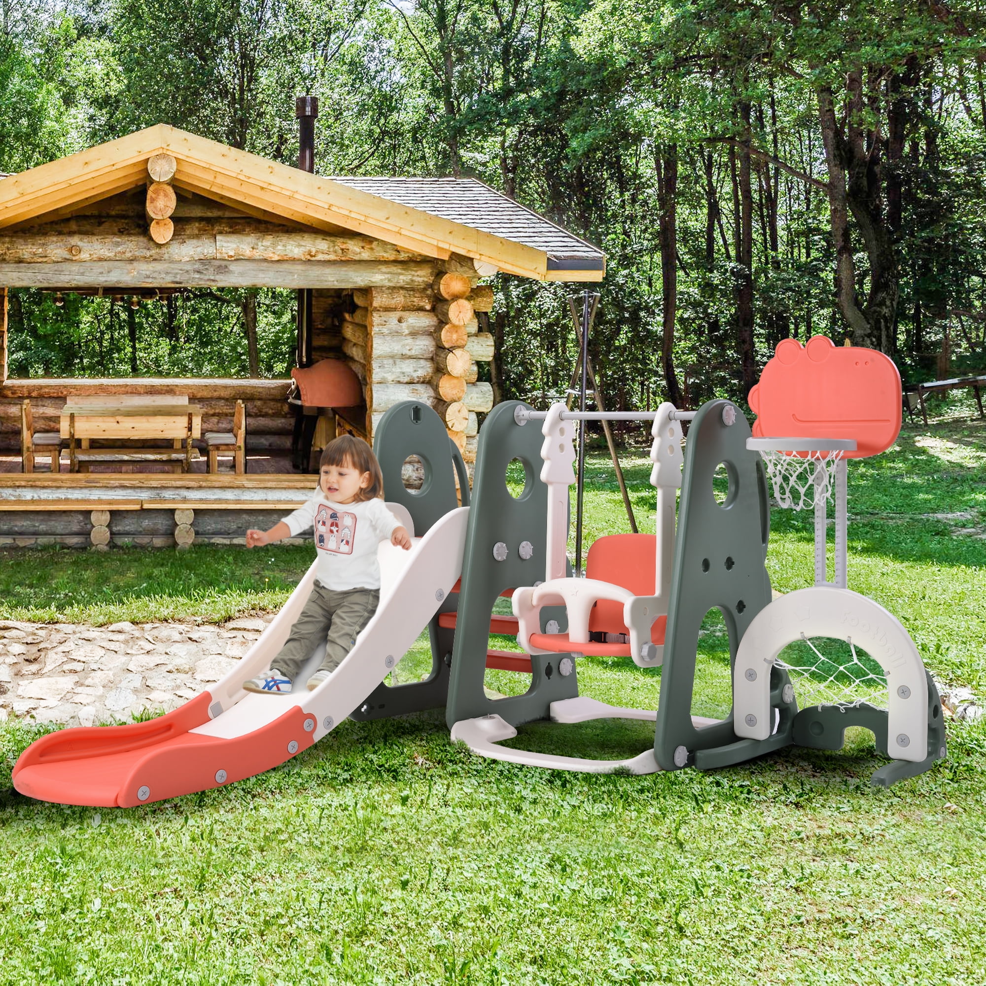 Features : Swing Set is ASTM and CPSIA compliant so there’s no need to worry about safety issues. The slide is equipped with 2 level height adjustment and the swing is equipped with 3 height adjustment. Recommended for 1-8 years old kids with weight less than 110 lbs. With everything labeled and clear instruction included, you wouldn’t have any confuse while assembling. Specifications: Dimensions: 67.7″ x 75.5″ x 47.5″ Weight Capacity: Less than 110 lbs Swing rope length:30.3″ Basketball stand height adjustment: 21.8″-36.2″