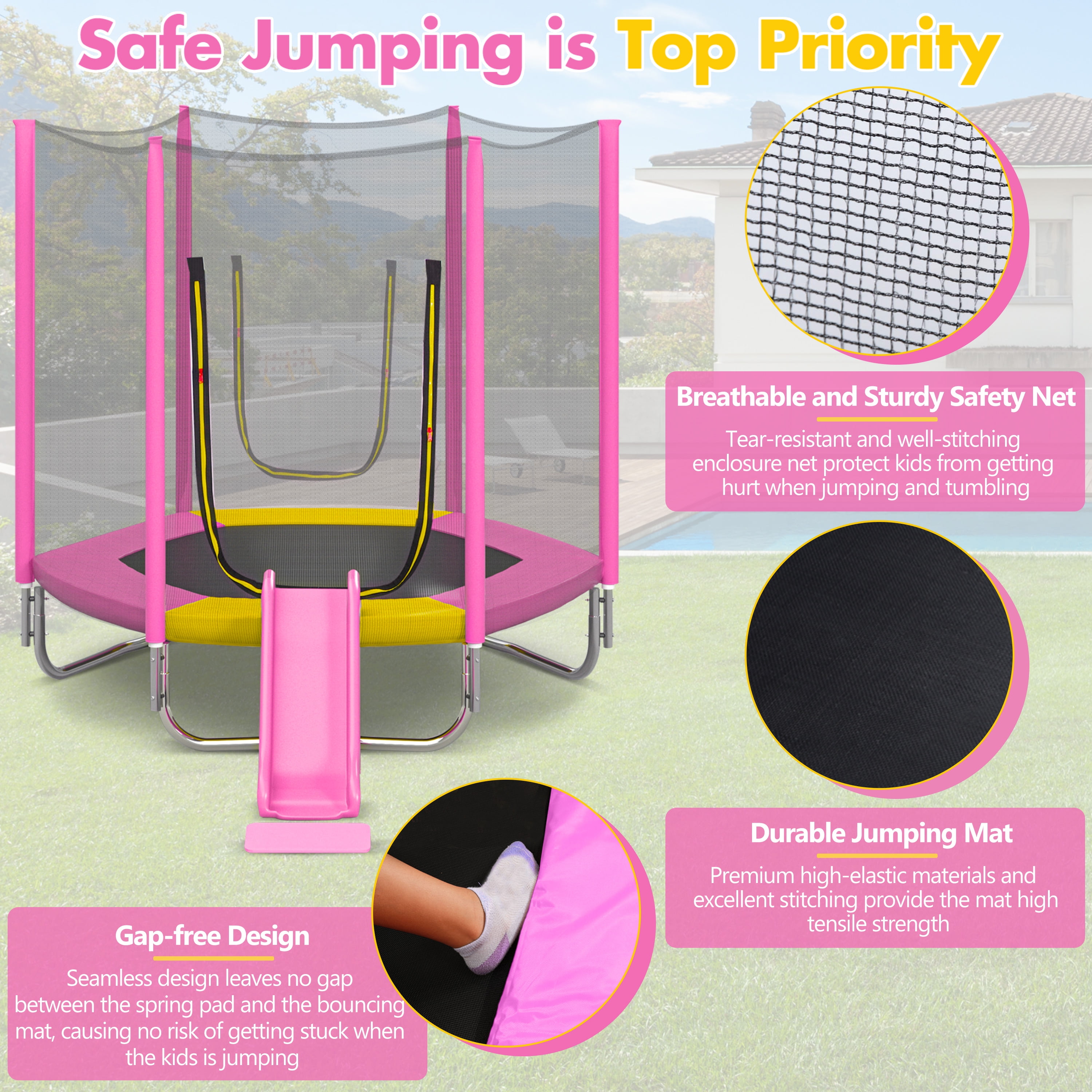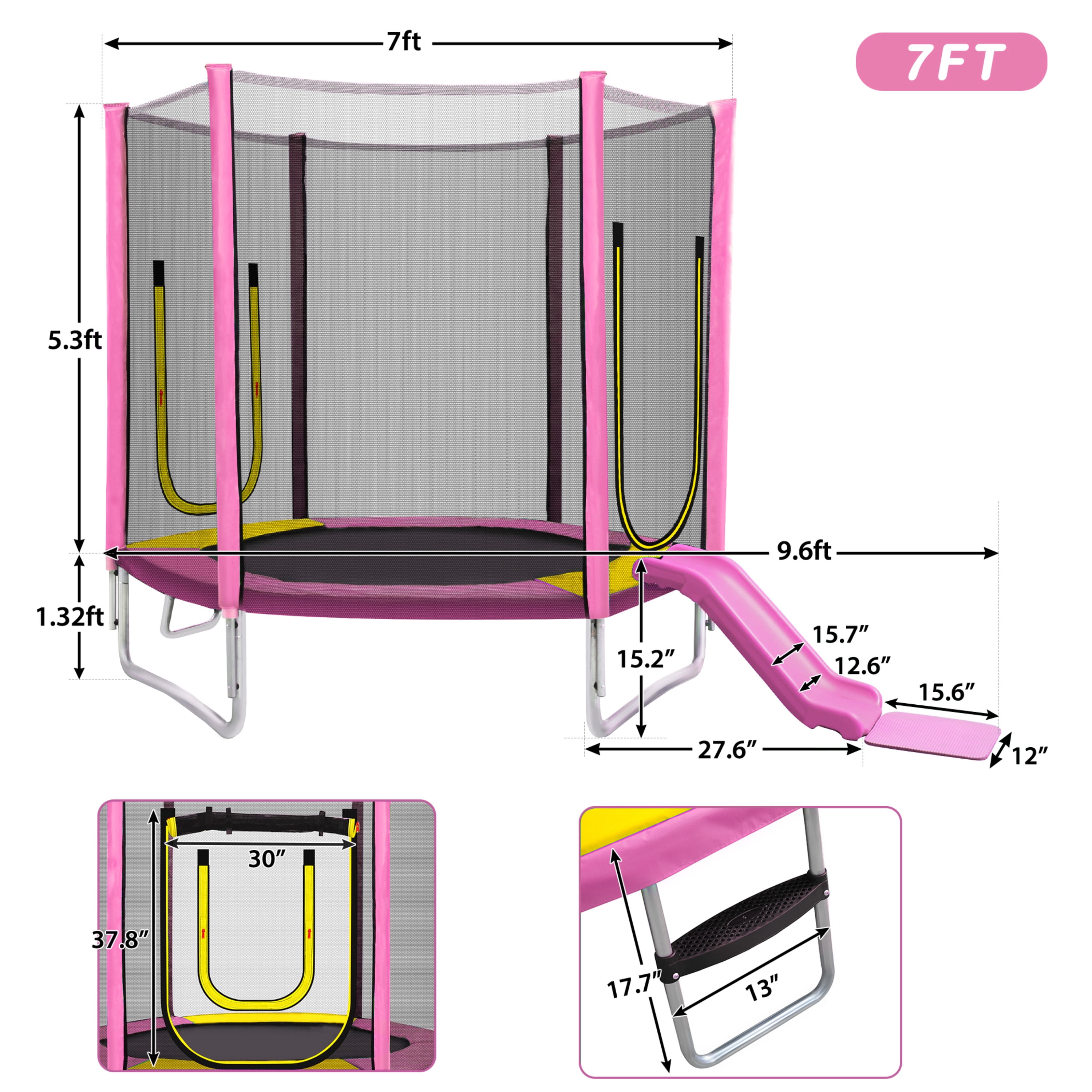 EUROCO 7FT Trampoline with Removable Slide, Kids Indoor Outdoor Trampoline with Enclosure Net and Ladder, Pink