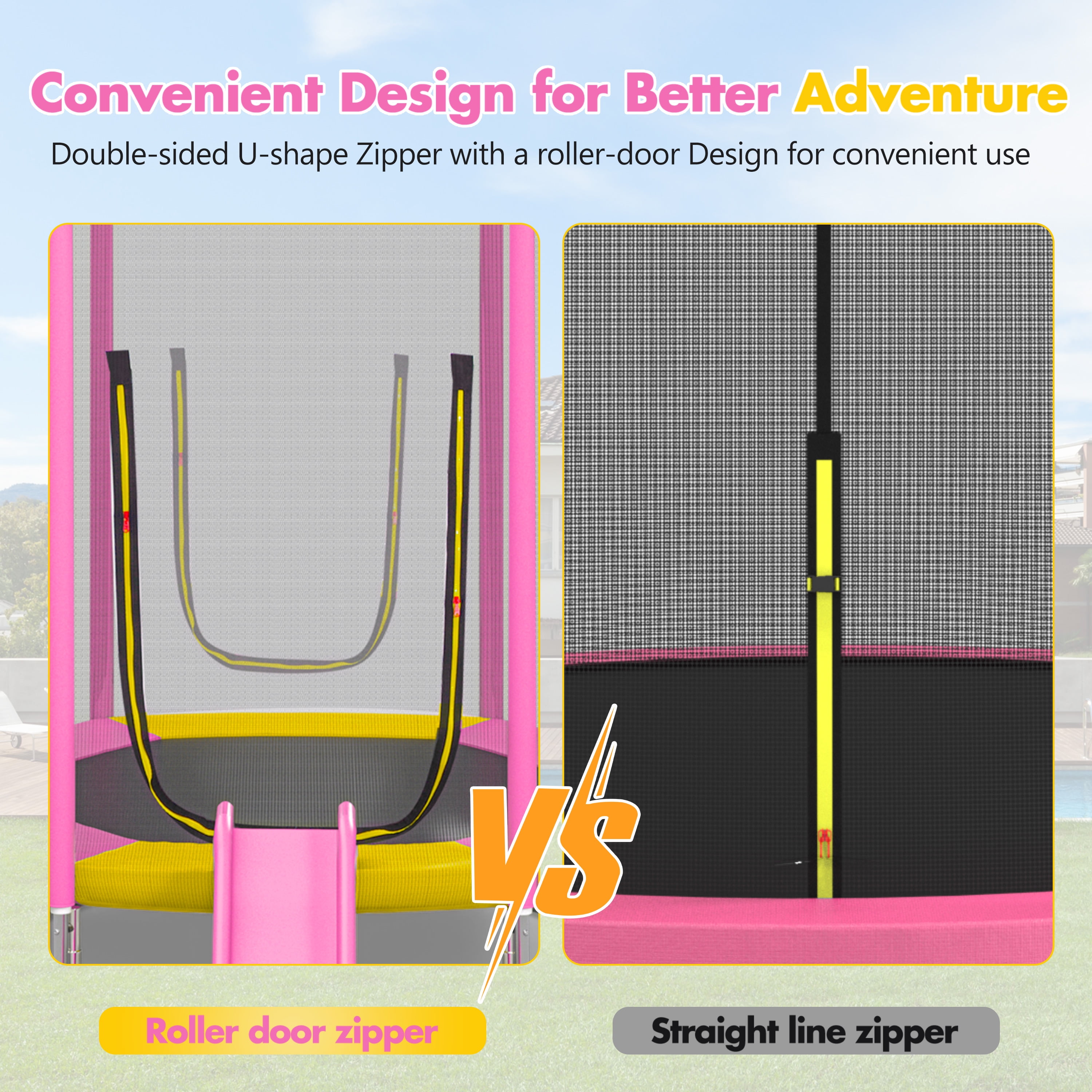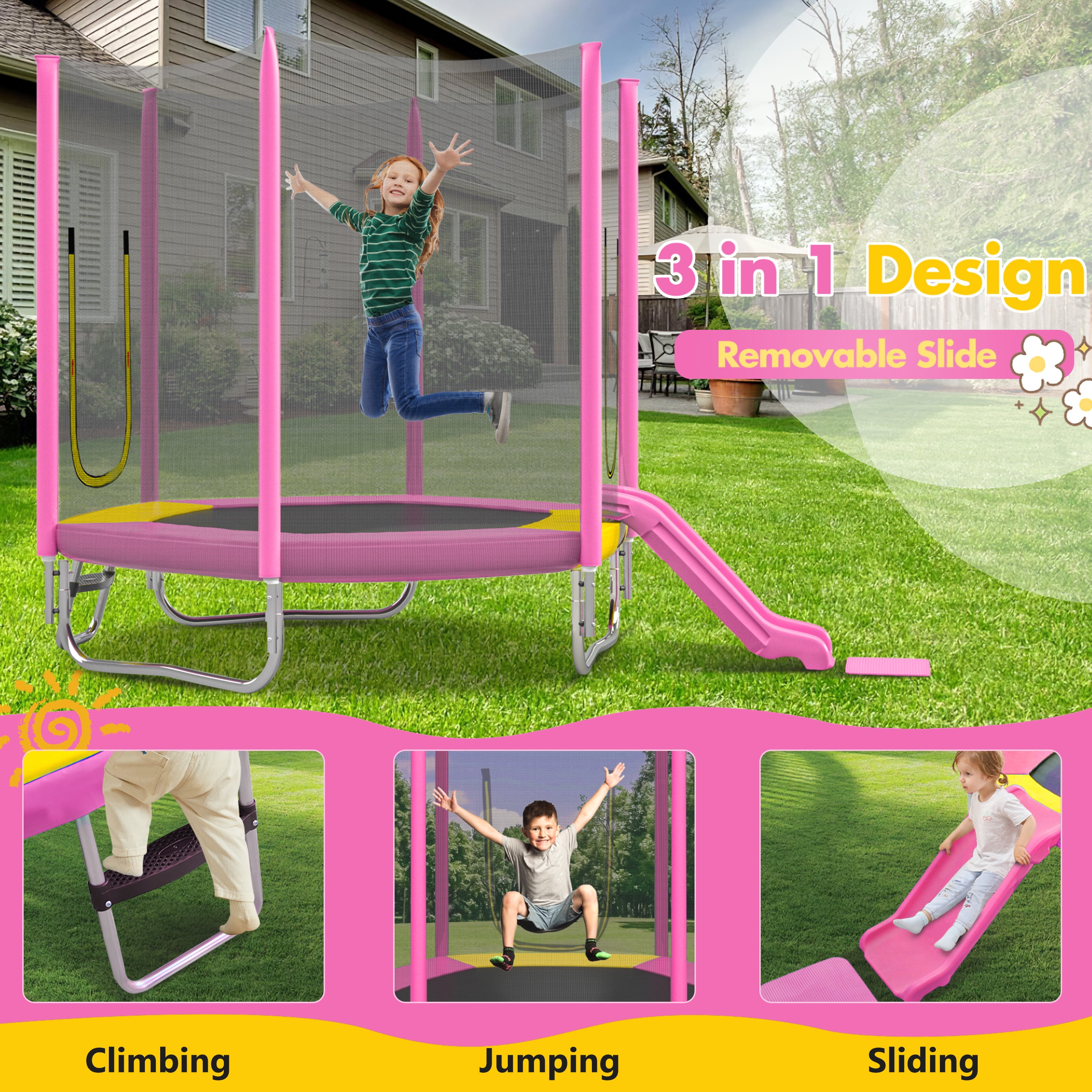 ★ Unlimited Fun for Kids: Our 7-foot trampoline with slide is designed to provide endless entertainment for your kids. Our 7-foot trampoline with slide provides double the excitement! Kids can jump freely on the trampoline and enjoy sliding down the smooth slide, perfect for endless outdoor fun. ★ Build to Last: Designed for long-term use, this 7-foot trampoline features a high-density, UV-resistant safety net, tightly woven jumping mats, and 36 high-quality springs. The rust-resistant coating on the exposed metal parts enhances durability, allowing children to play freely in all weather conditions. ★ Versatile Size for Any Space: This outdoor trampoline is perfect for indoor and outdoor use with its compact 7-foot design. It is perfect for backyards, playgrounds, and kindergartens, providing children with a safe way to burn off energy and engage in active play. ★ Smart Design, Safety First: The trampoline uses U-shaped legs for stability, ensuring a solid base. The slide has a smooth surface and a soft pad on the bottom to cushion the landing, prioritizing the safety of playful toddlers. ★ Ideal Gift for Kids: This unique trampoline with slide combo is the perfect gift for any occasion. Unlike standard trampolines, this model features a molded plastic slide that is durable and safe for children, making it a great choice for birthdays, Christmas, and Children’s Day.