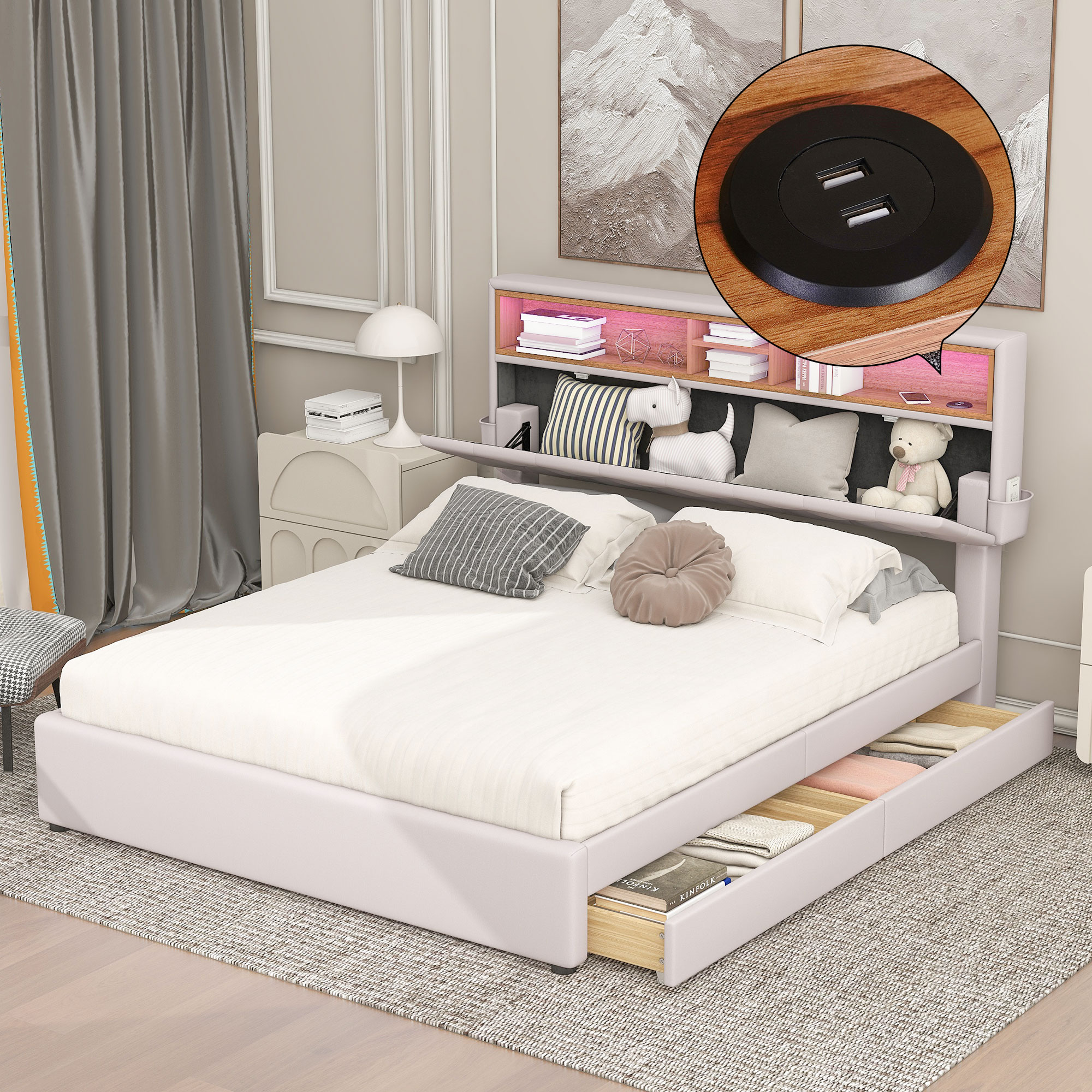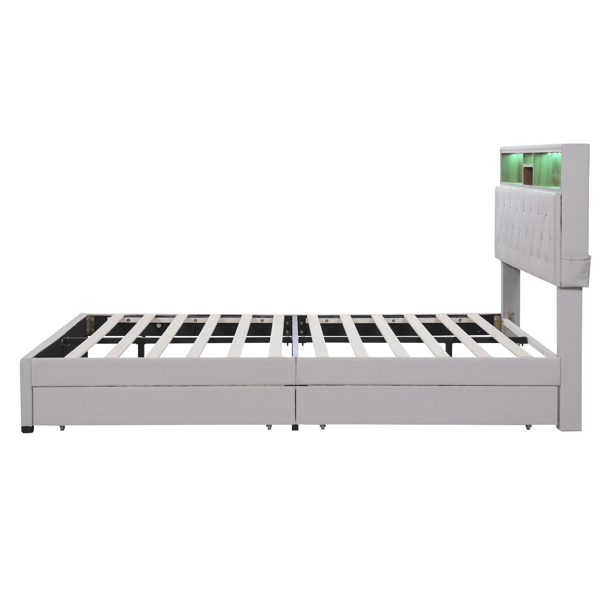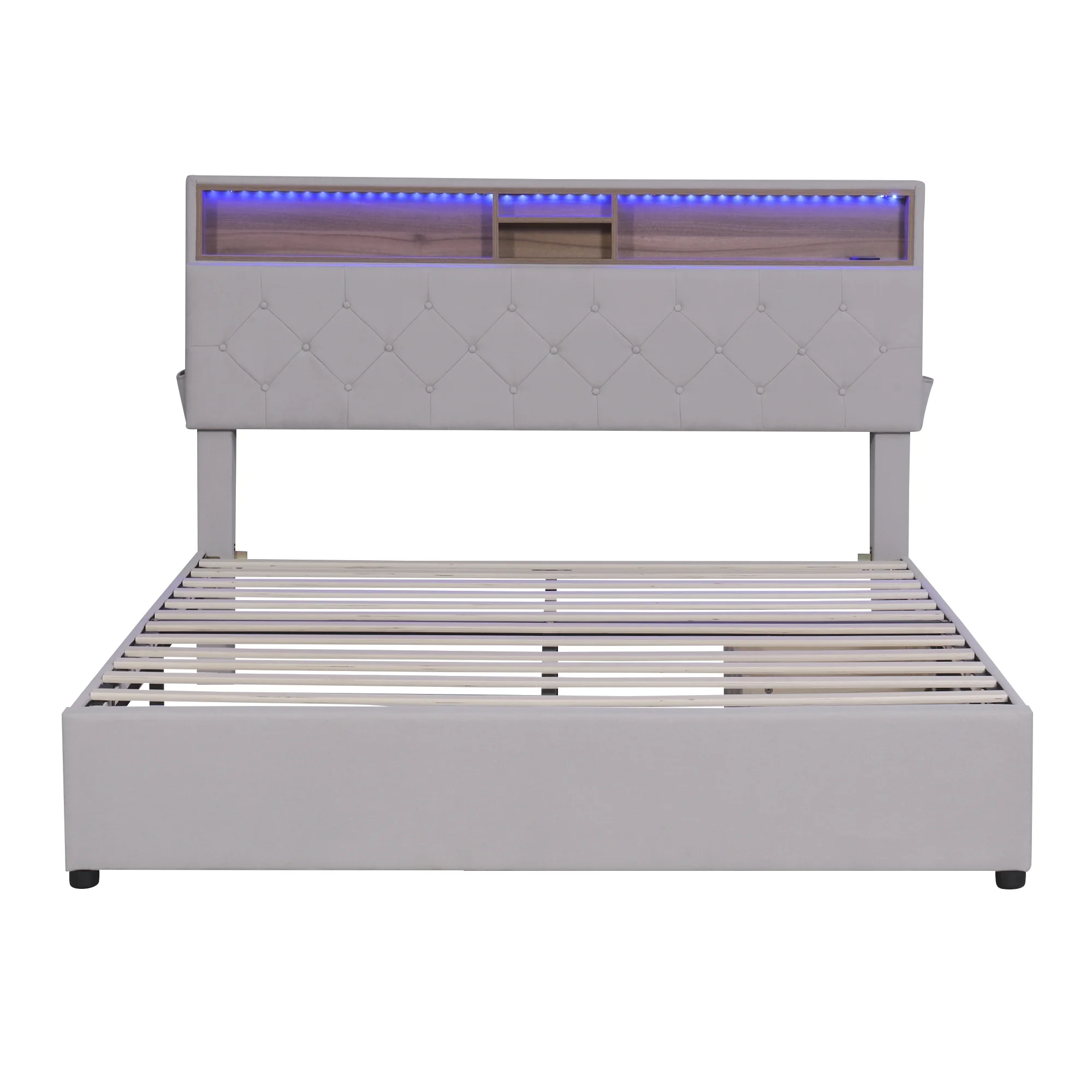 Euroco Adult Queen Modern Upholstered Standard Bed with Charging Port and Drawers, Beige