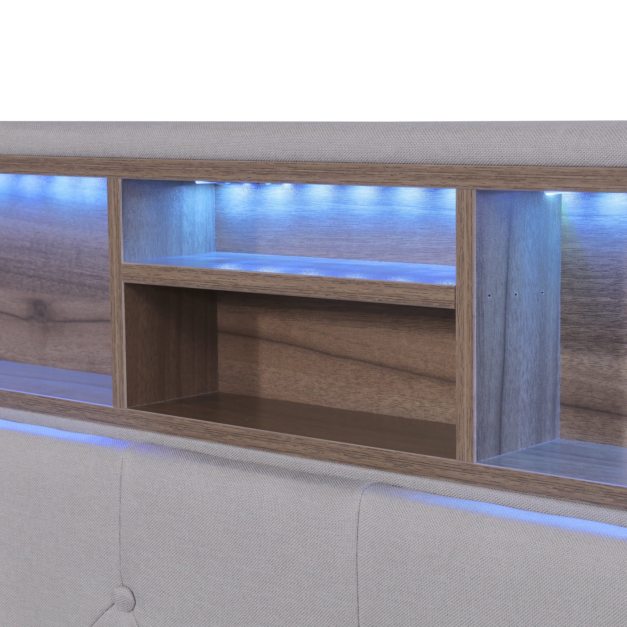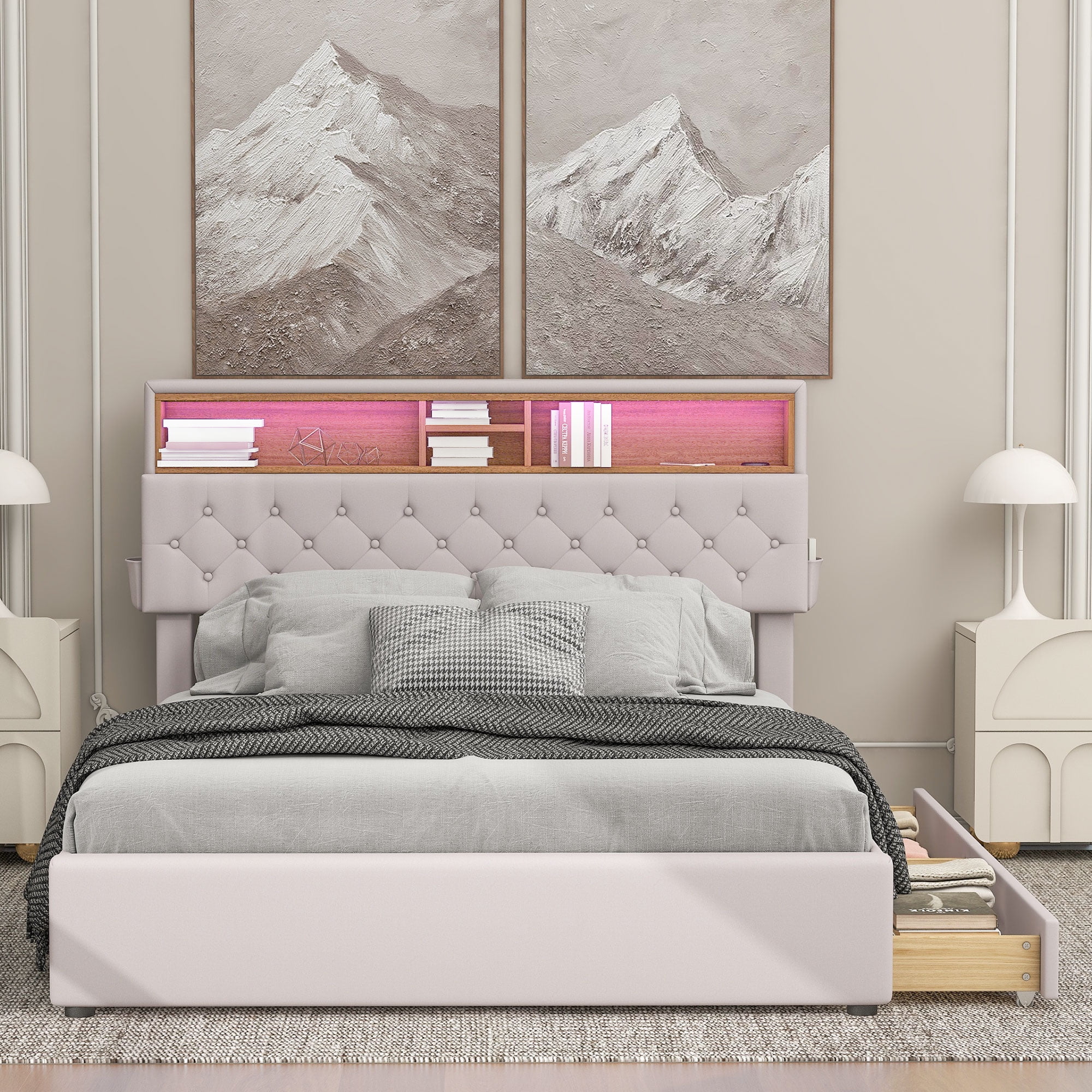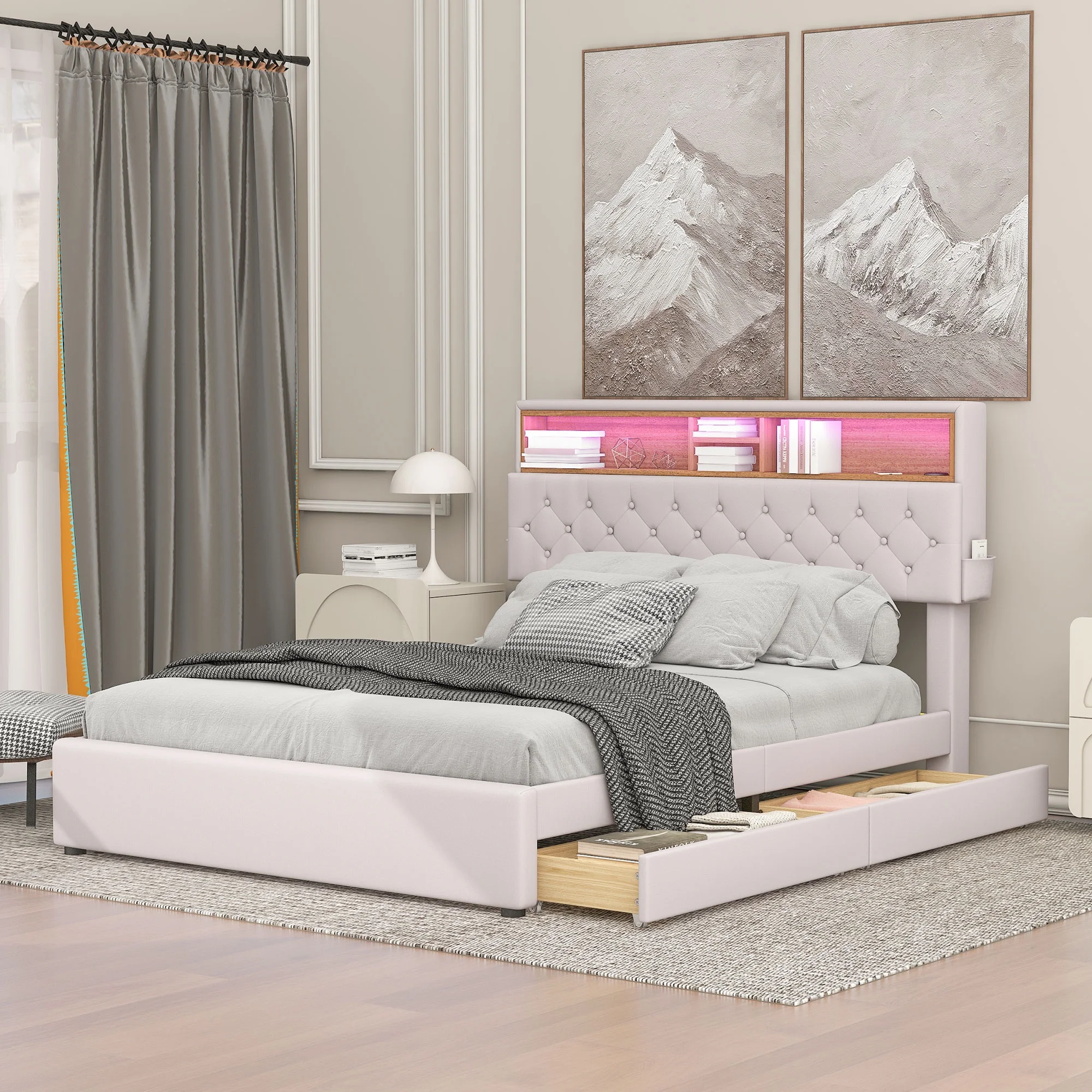 Euroco Adult Queen Modern Upholstered Standard Bed with Charging Port and Drawers, Beige