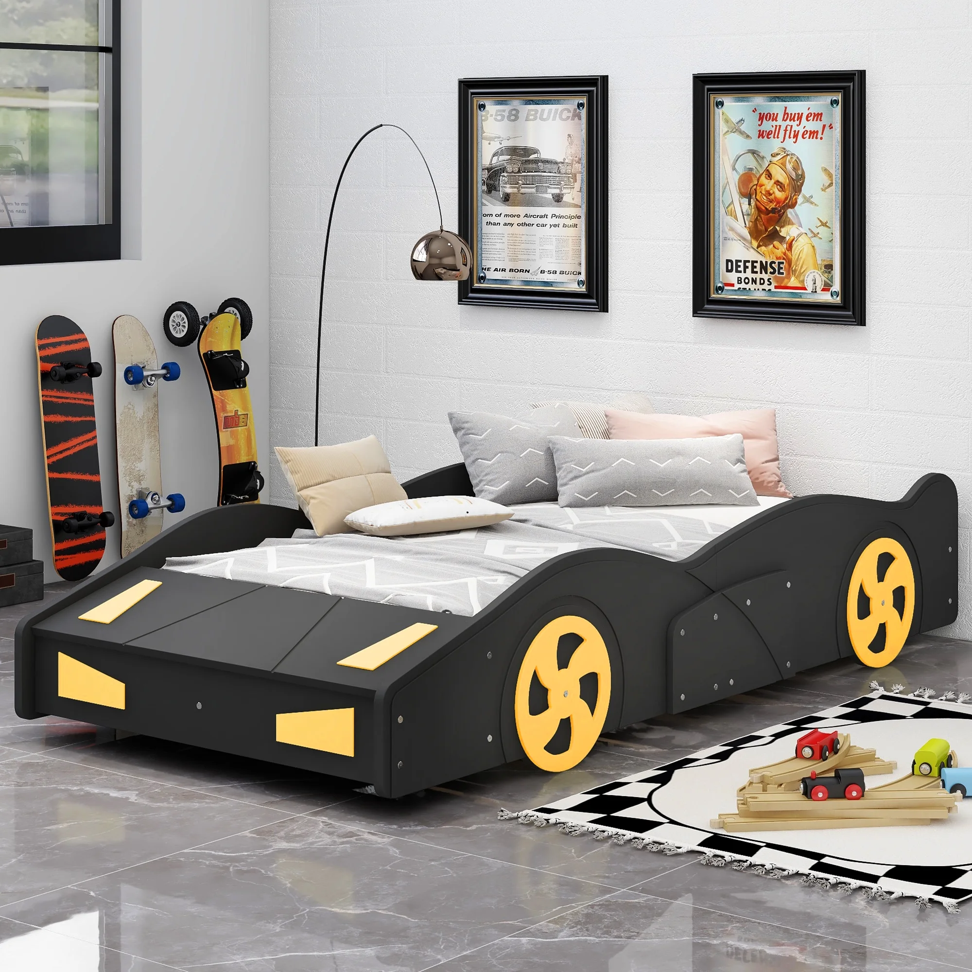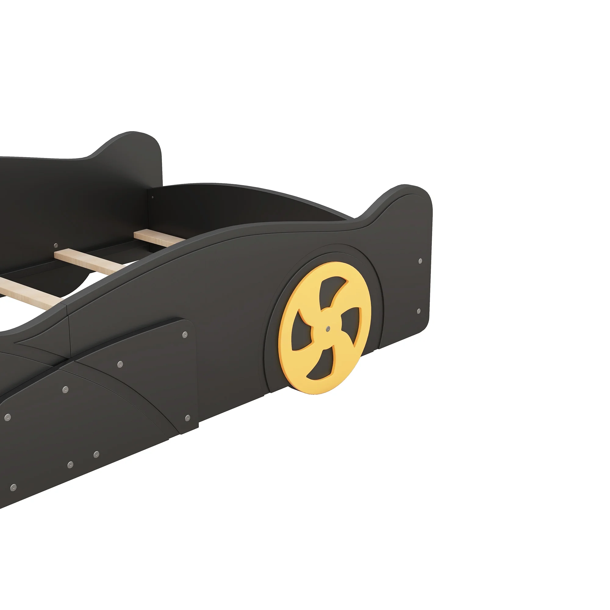 Features: [Car-Shaped]: This car shaped platform bed features tires, rims and front storage cabinet to make your kids feel like in a real car. For kids in different ages, the car frame bed will always catch their eyes. It will also turn to be a playground for your little one. [Platform Bed]: This low platform bed will be a safe choice for your little one. The full length guardrail around the platform will not only keep the mattress in place, but protect kids while sleeping. [Blue and Yellow]: The combination of the yellow and black will add to any bedroom design. Suit for any room decorations. [Solid Construction]: Constructed from solid pine wood, this car bed will stand the test of time and last for years. High-quality MDF and the design of the bed will be stable, without any wobbling when sleeping on it. [Easy to Assemble]: All the parts and tools needed will be packed in the package. The instruction and the accessories are also included in the package. Just follow the instruction, and then you will get your own car bed. Specification: Size: Twin Overall Product Dimension: 90.6”L x 40.3”W x 17.5”H Inner Size:75.4” x 39” Overall Product Weight: 107.5lb Bed Weight Capacity: 250lb Mattress Included: No Total Height: 17.5″ Assembly Required: Yes Recommend Bed Mattress Thickness: 6”