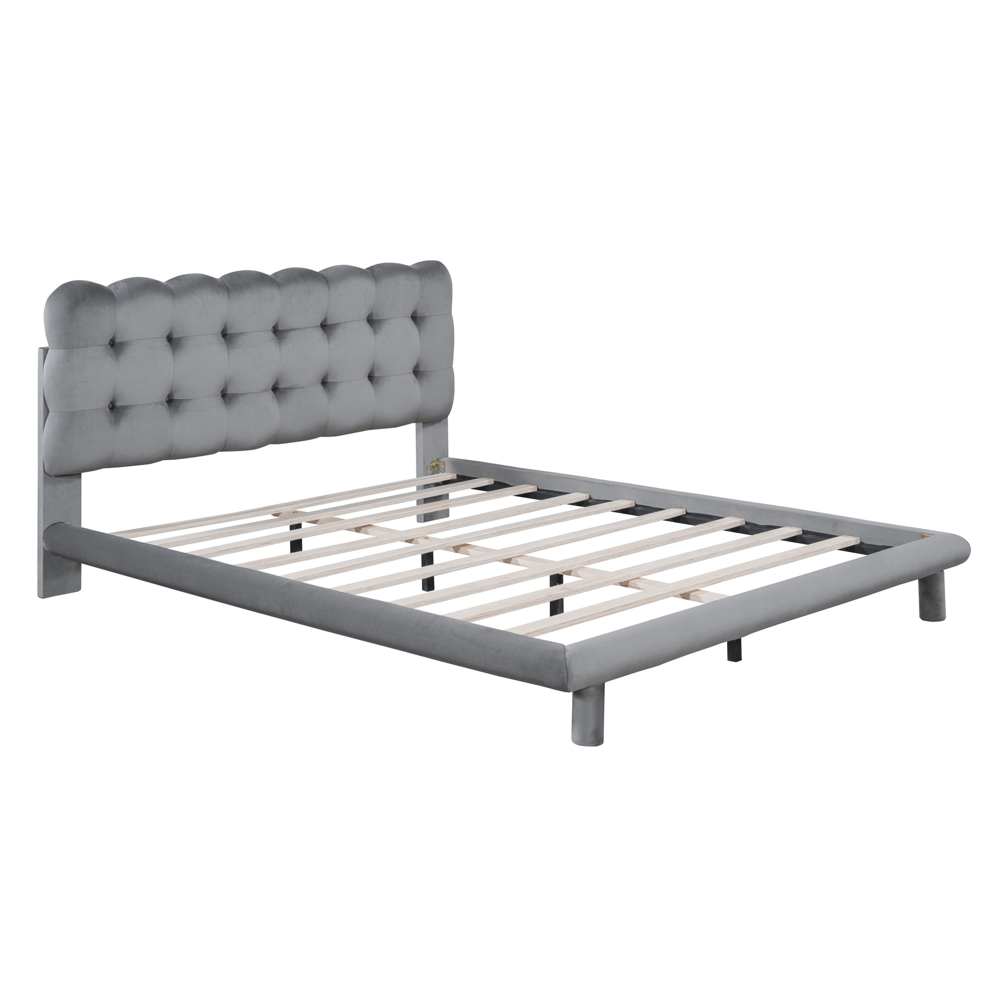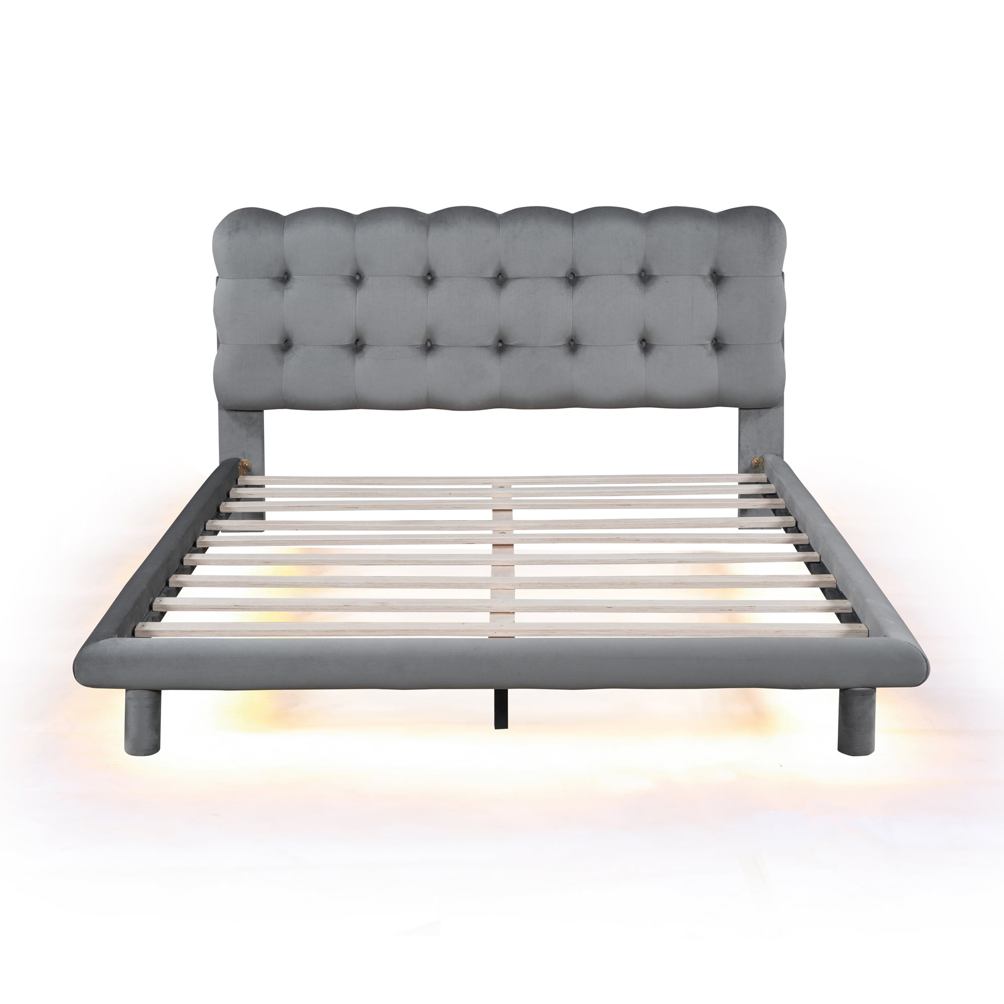Euroco Floating Queen Size Bed with LED Light, Velvet Upholstered Platform Bed Frame with Tufted Headboard, Gray