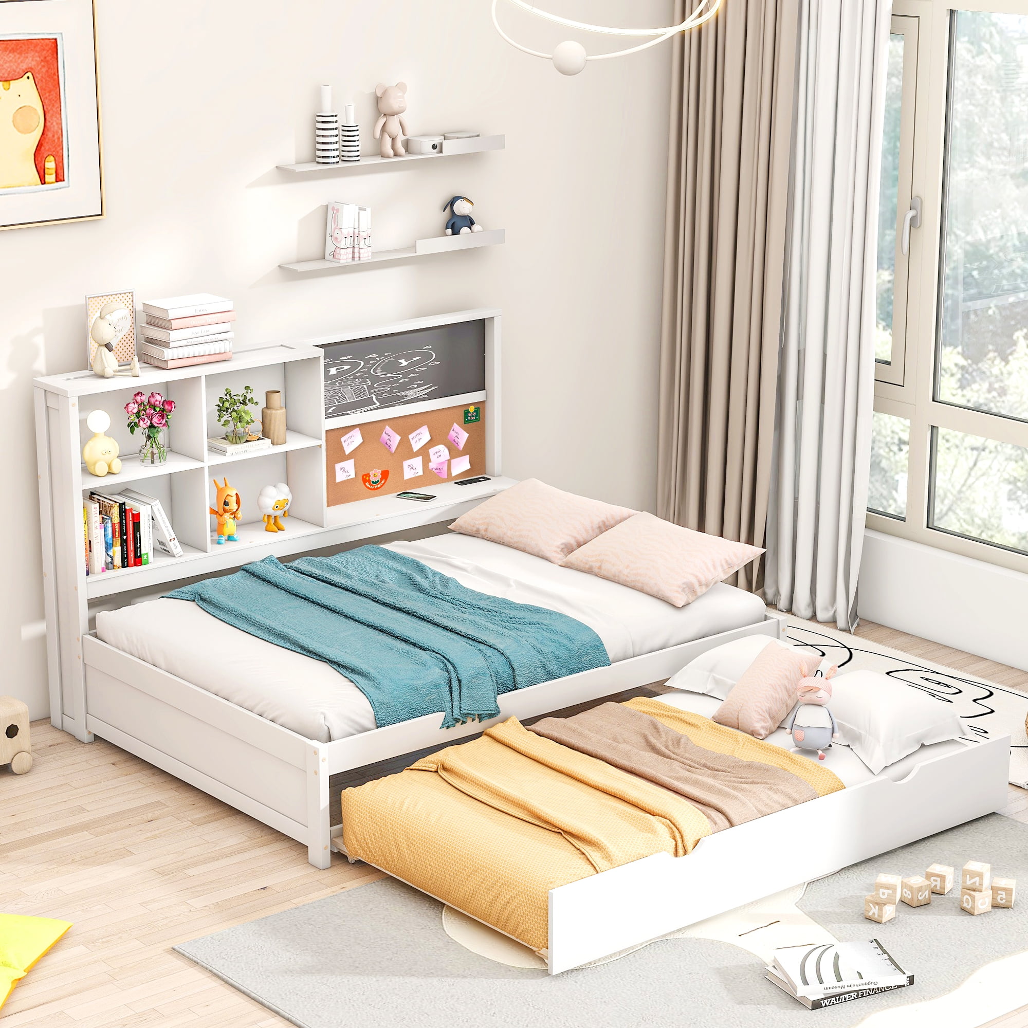 Features: [Special Shelf]: This daybed is equipped with a two tier shelf for your books and little stuff. It has been divided into small cabinets for you to place different things. The design will be easy for your to make it a display case. [Functional Board]: There is a blackboard for writing or drawing, and a cork board for you to display photos. Your kids can decorate their own bed with these two boards. The attached USB charging station will be easy access when you sleeping. [Pull out Trundle]: Besides the functional headboard, this daybed also has a twin size trundle for your extra guests. Or you can pull it in for an extra storage to save more space for your bedroom. The trundle bed also has the wheels. [Solid Construction]: This captain bed is made from solid pine wood and MDF, which will stand the test of time to serve your family for many years. The whole bed frame will be low and safe for your little one to enter. [Easy to Assemble]: This expertly crafted piece comes with everything you need to put it together, including all hardware and simple tools to get you from box to bedroom in less time than you’d think. Specification: Size: Full Overall Product Dimension: 104.4”L x 75.6”W x 47.2”H Bed Inner Size: 76.4” x 54.5” Overall Product Weight: 133lb Bed Weight Capacity: 600lb Mattress Included: No Total Height: 47.2″ Assembly Required: Yes Recommend Bed Mattress Thickness: 6” Material: Pine Wood+MDF Spring Box: No need