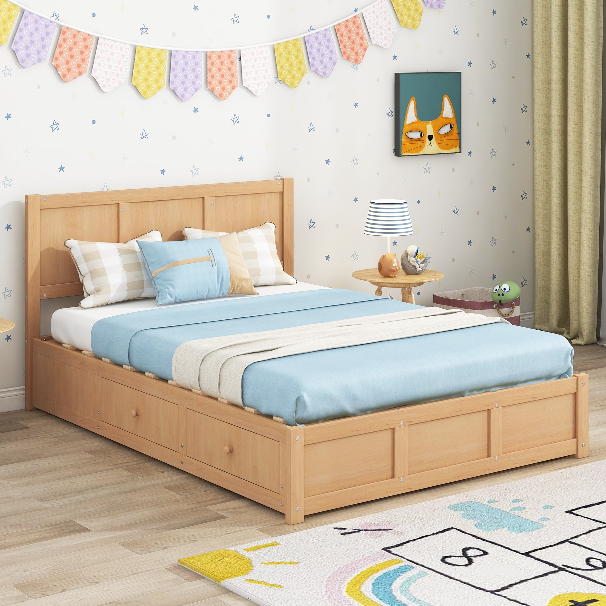 Features: [Underneath Storage]: This platform bed made full use of the floor bed, so you can get the full room under the bed to store your books, clothes and bedding. The two drawers are also ready for your necessities. [Easy to Lift]: This wood platform features an ingenious hydraulic lifting mechanism that lifts the platform, essentially doing the work for you. You can access your belongings beneath the bed without breaking a sweat or moving the mattress. [[Safe and Comfortable]: This low profile platform bed will be safe and easy for your little one to enter. The high headboard will be a good place to lean on when you are watching or reading. [Easy to Assemble]: All the parts and tools needed for the assembly will be in the packages. It will be useful for you to assembly this bed. You just need to follow the instructions to assemble your own bed. Specification: Size: Full Overall Product Dimension: 78″L*57.7″W*37.4″H Inner Size: 73.4″x 54″ Overall Product Weight: 157lb Upper/Lower Bed Weight Capacity: 600lb Mattress Included: No Total Height: 37.4″ Assembly Required: Yes Recommend Bed Mattress Thickness: 8-10”