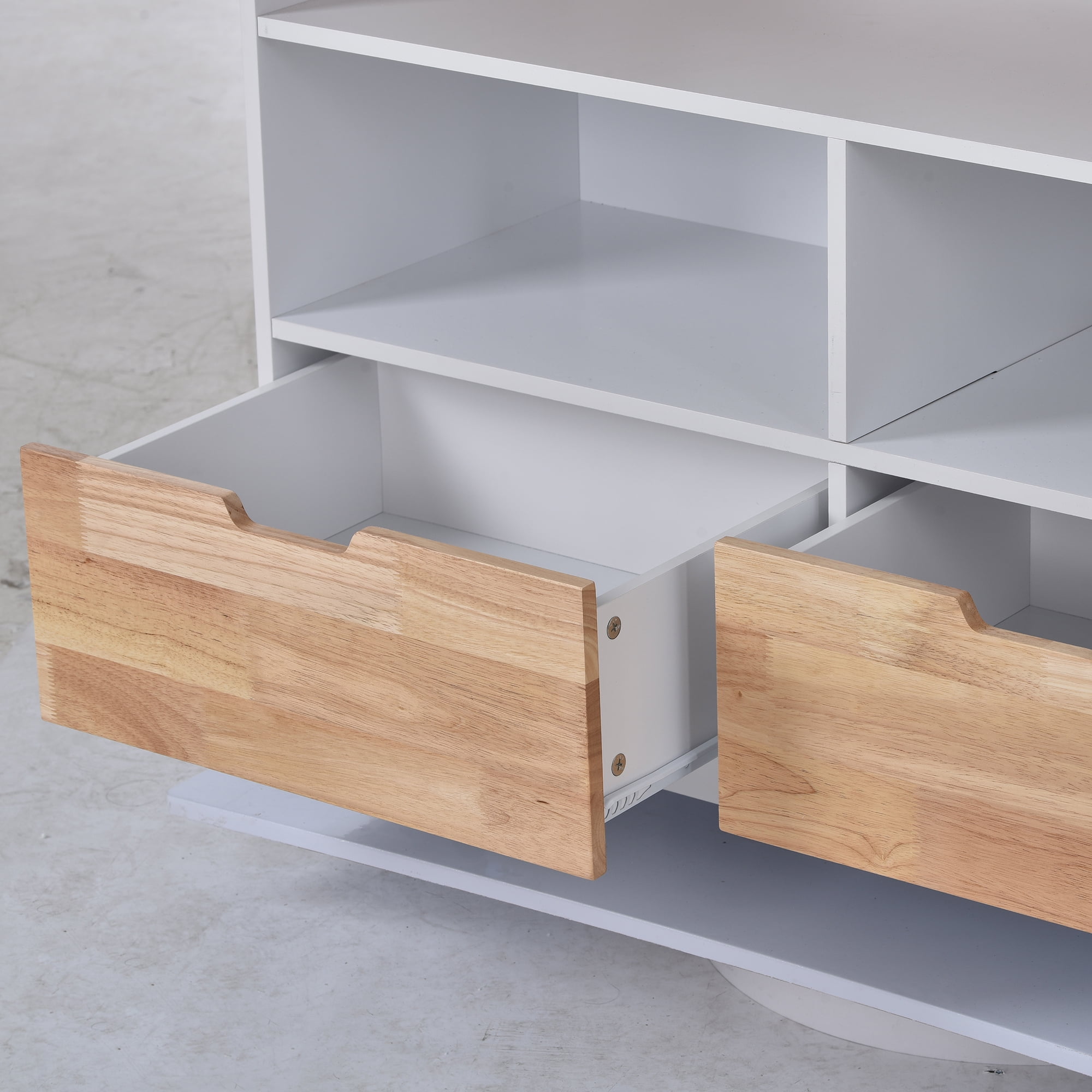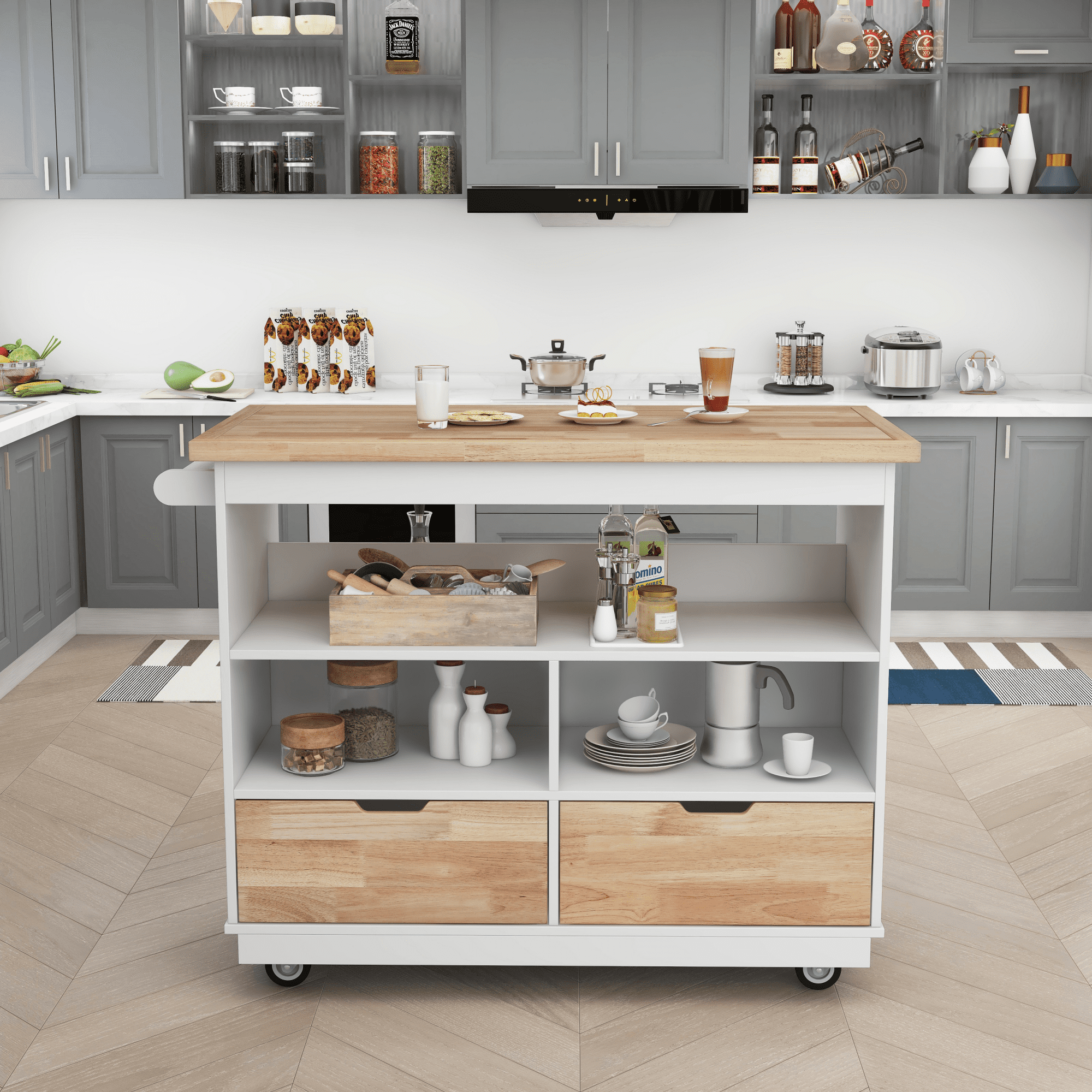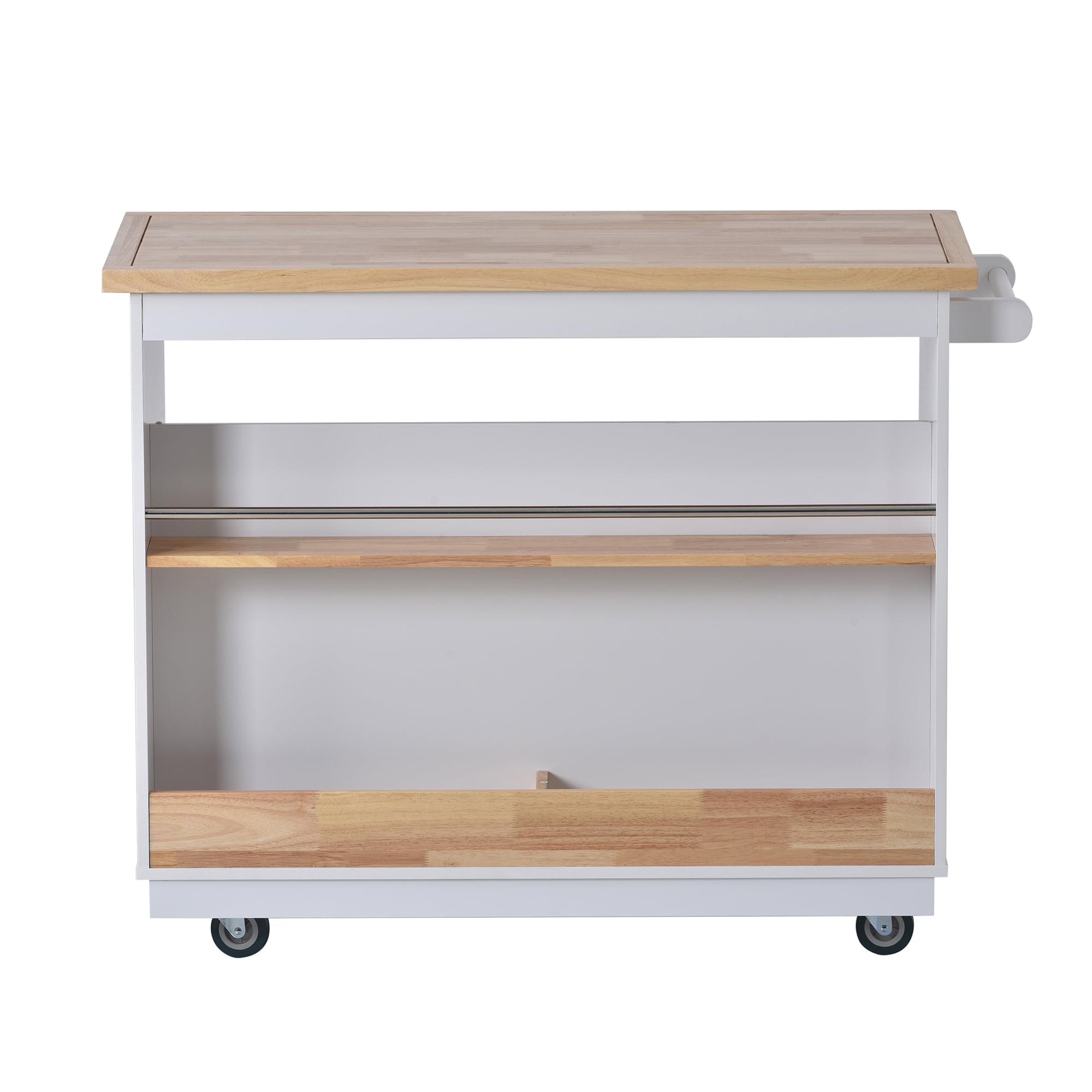 Features: [Multiple Storage Space]: The large countertop of the dining cart gives you more room to maneuver while preparing meals and eating. 2 easy-glide drawers, a large kitchen cabinet, and two open shelves for extra storage for your kitchen items. The pusher can also be used as a towel rack. [High Quality]: High-quality MDF and metal frames. The metal construction adds durability and stability, allowing it to withstand heavy loads for a long time without breaking, and the MDF wood-grain top is easy to clean with a damp cloth. [Multifunctional and Practical]: The front of the kitchen cart is divided into three layers. The sturdy top shelf can hold a microwave oven and other kitchen appliances, and the three storage compartments make it easy to find everything you need. [Safe and Comfortable]: The kitchen cart is equipped with 5 smooth-rolling and 2 wheels have brakes for the emergency lock. In addition, an additional wheel in the middle can not only increase the load-bearing capacity but also make it easier to move around. [Easy to Assemble]: This kitchen island cart comes with step-by-step installation instructions and numbered parts to make sure you can assemble it easily. Two packages will come with all parts you need to assemble this bar. Specification: Overall Product Dimension: 46″ L x 21.7″ W x 35.64″ H Overall Product Weight: 103.4 lb. Tabletop Weight Capacity: 160 lb. Shelf Weight Capacity: 50 lb.