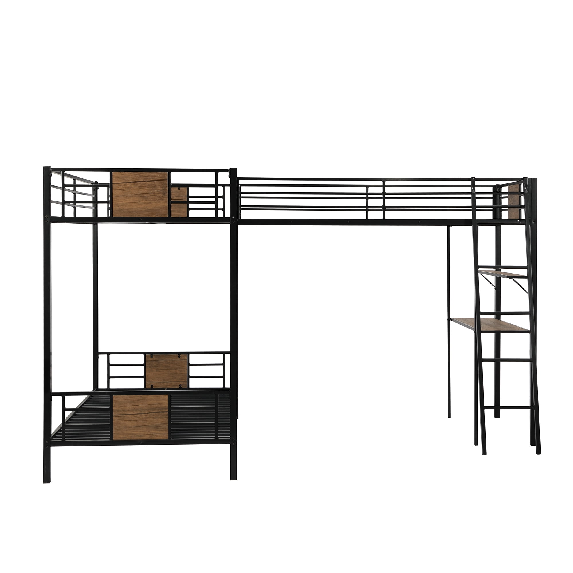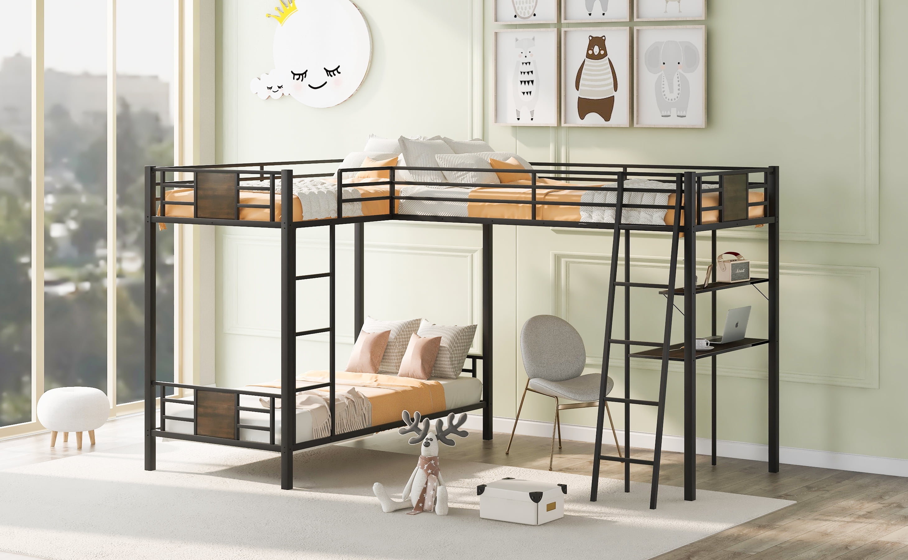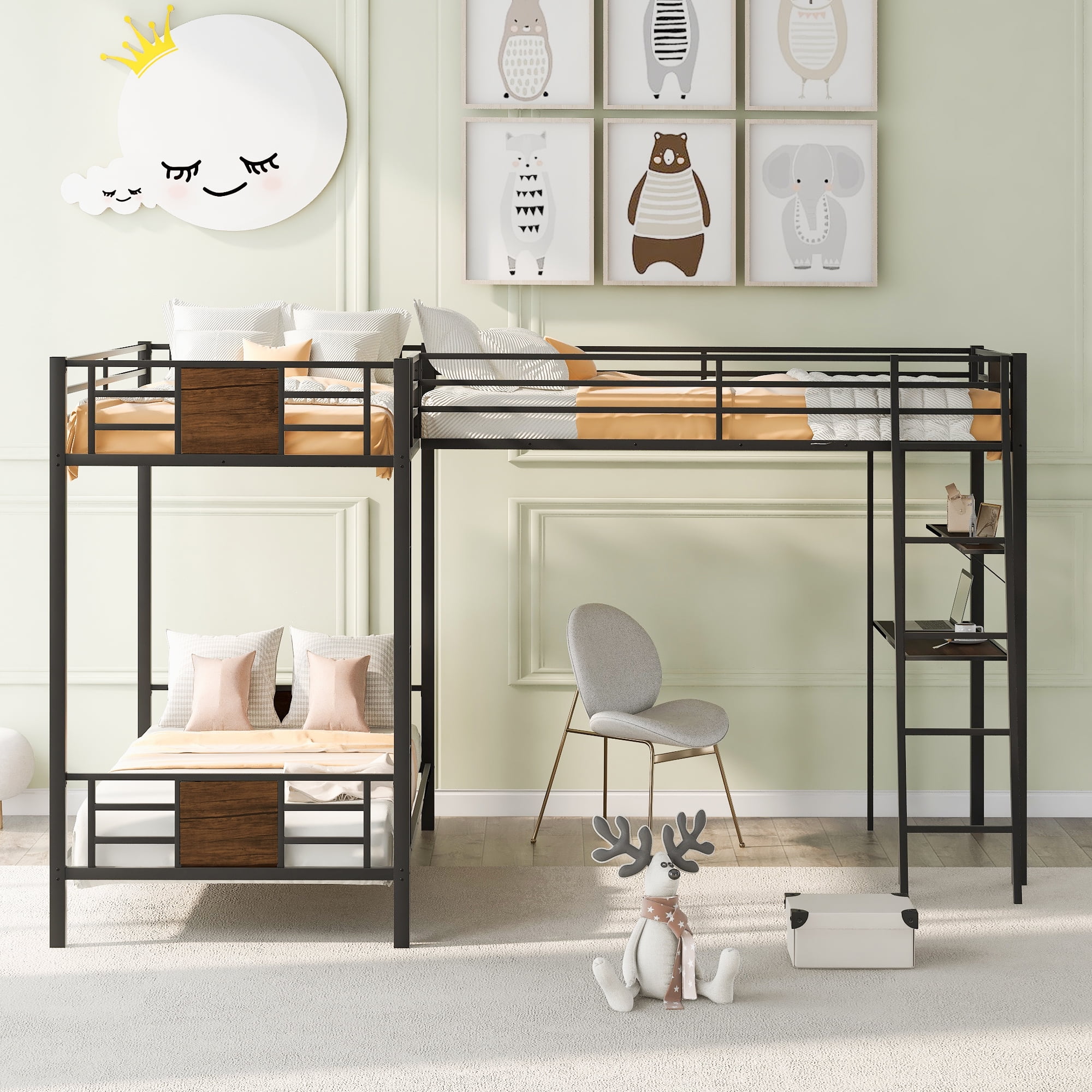 Euroco L-Shaped Twin Bunk Bed and Twin Loft Bed, Three Beds with Shelf for Kids Teens Bedroom, Black+Brown