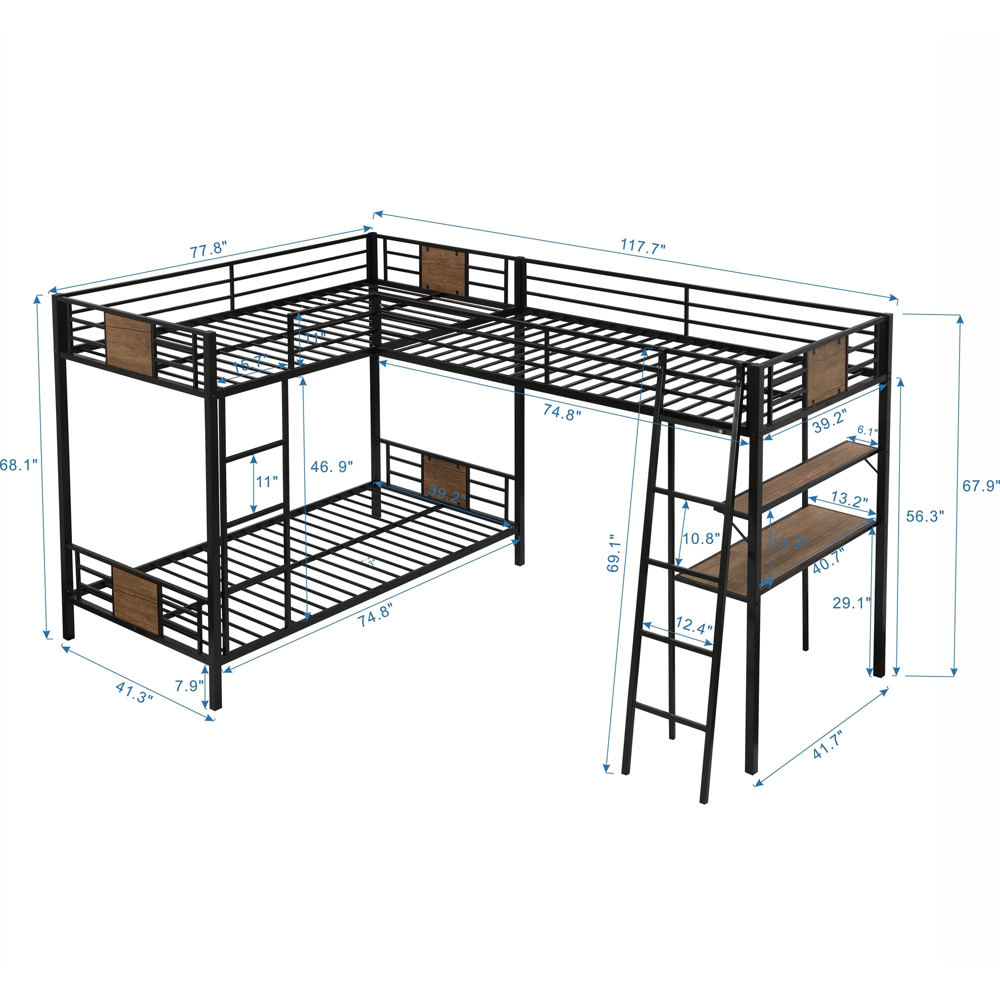 Features: [Triple Bunk Bed]: This twin size l-shaped bunk bed features two upper beds and one bottom bed for accommodating your kids or any overnight sleepers. What’s more, a loft bed with an under-bed desk and shelf offers a study room for your kid’s reading and writing. The kid’s bunk bed is suitable for children’s room, dormitory, and apartment. [Loft Bed with Desk and Shelf]: This functional bunk bed is equipped with a built-in desk and shelf under the loft bed. Your kids will have their own room to study and place their toys, books, or other accessories. [Sturdy Bed Frame]: Strong metal frame that includes an integrated ladder, full-length guardrails, secured metal slats to ensure security and stability. A solid wooden desk and shelf are beneficial and comfortable. No additional box spring or foundation is required. [Safe for Child]: Both the upper beds and lower bed have metal guardrails and the bed has two built-in ladders for your child to enter the upper bed. This bed will be very sturdy and safe for your children. [Easy to Assemble]: All the accessories and hardware needed for the bed are included, which makes it easy and quick for you to assemble the loft bed. You just need to follow the assembly instructions and then you can complete the bed in a short time. Specification: Size: Twin over Twin Overall Product Dimension: 117.7″ L * 77.8″ W * 68.1″ H Overall Product Weight: 156 Lb Weight Capacity: 250 Lb Mattress Included: No Total Height: 68.1″ Assembly Required: Yes Recommend Bed Mattress Thickness: 6″ – 8″