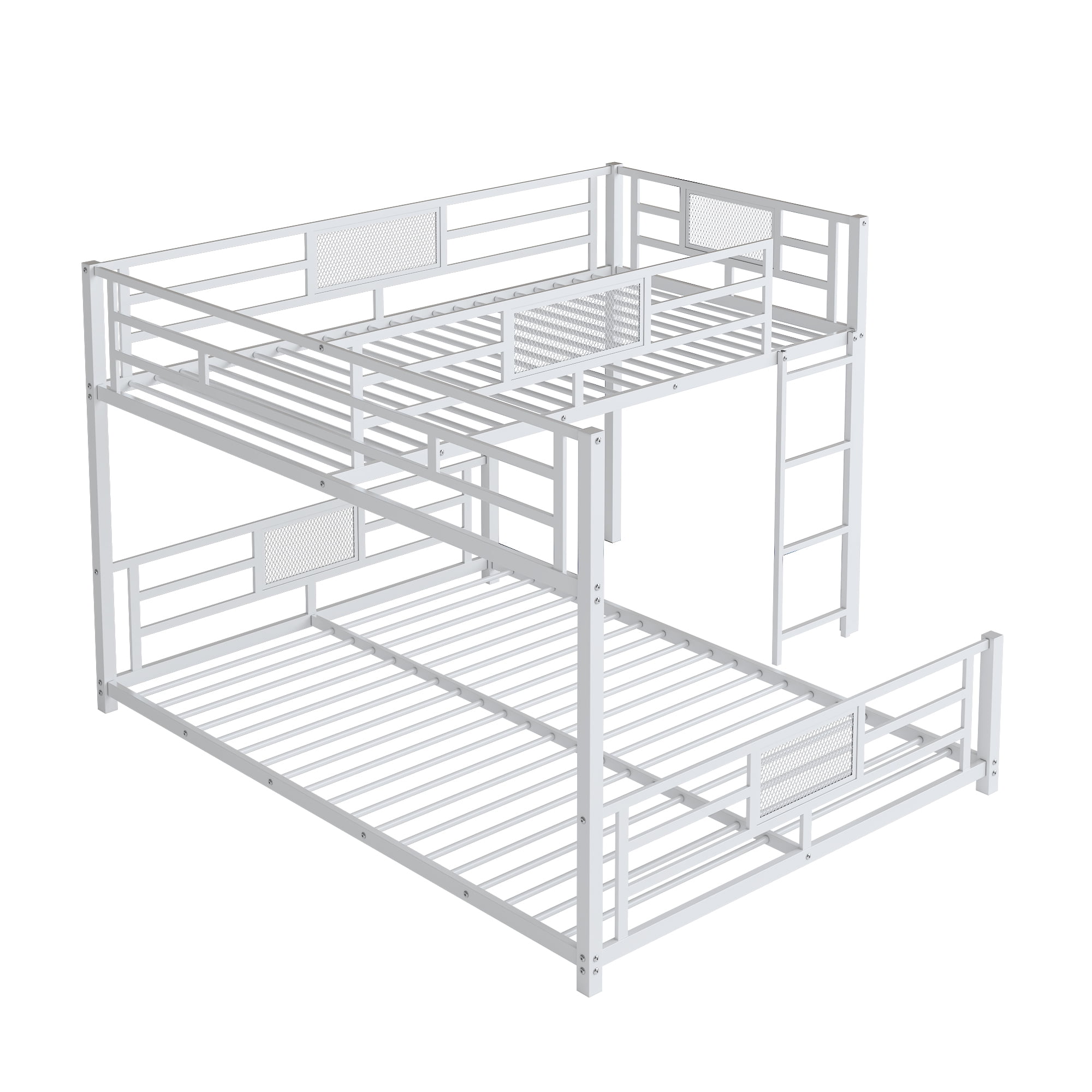Features: [Sturdy Structure]: Euroco sturdy metal bunk bed frame has metal slats and side rails for guaranteed stability and durability. The color and design of the bed add a touch of elegance to the bedroom. [Safety Guardrails]: The top bed has a full-length reinforced guardrails to prevent your kid from falling off. This bunk bed is suitable for families with two children. Save space and increase children’s fun. You can easily move the location and change the home decoration regularly with this bed. [Built-in Ladder]: No need to worry about round narrow step hurt your feet anymore. Our upgraded ladder features wide flat steps and anti-slip rubber covering for maximum comfort. A built-in ladder can save many space and it is more stable for your kid to climb. [Easy to Assemble]: It may needs only a few time to assemble the bed. It is very easy to assemble with the step-by-step instructions included. All the necessary tools needed for assembly will be prepared in the package. Ideal for space-saving needs, maximizing space in a room. Specification: Size: Twin over Full Overall Product Dimension: 76.96”L x 77.36”W x 49.6”H Inner Size: 75″x 39″ Overall Product Weight: 115lb Weight Capacity: 250lb/350lb Mattress Included: No Total Height: 49.6″ Assembly Required: Yes Material: Metal Spring Box: No need
