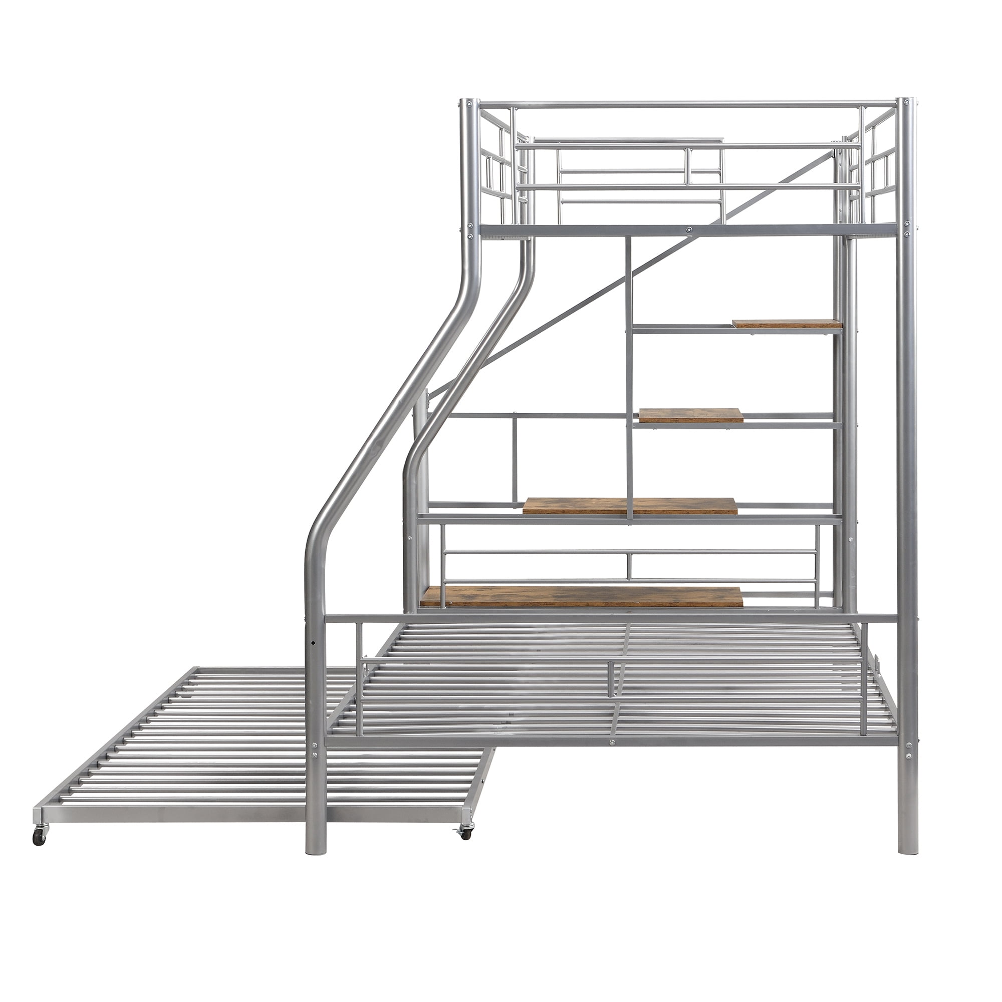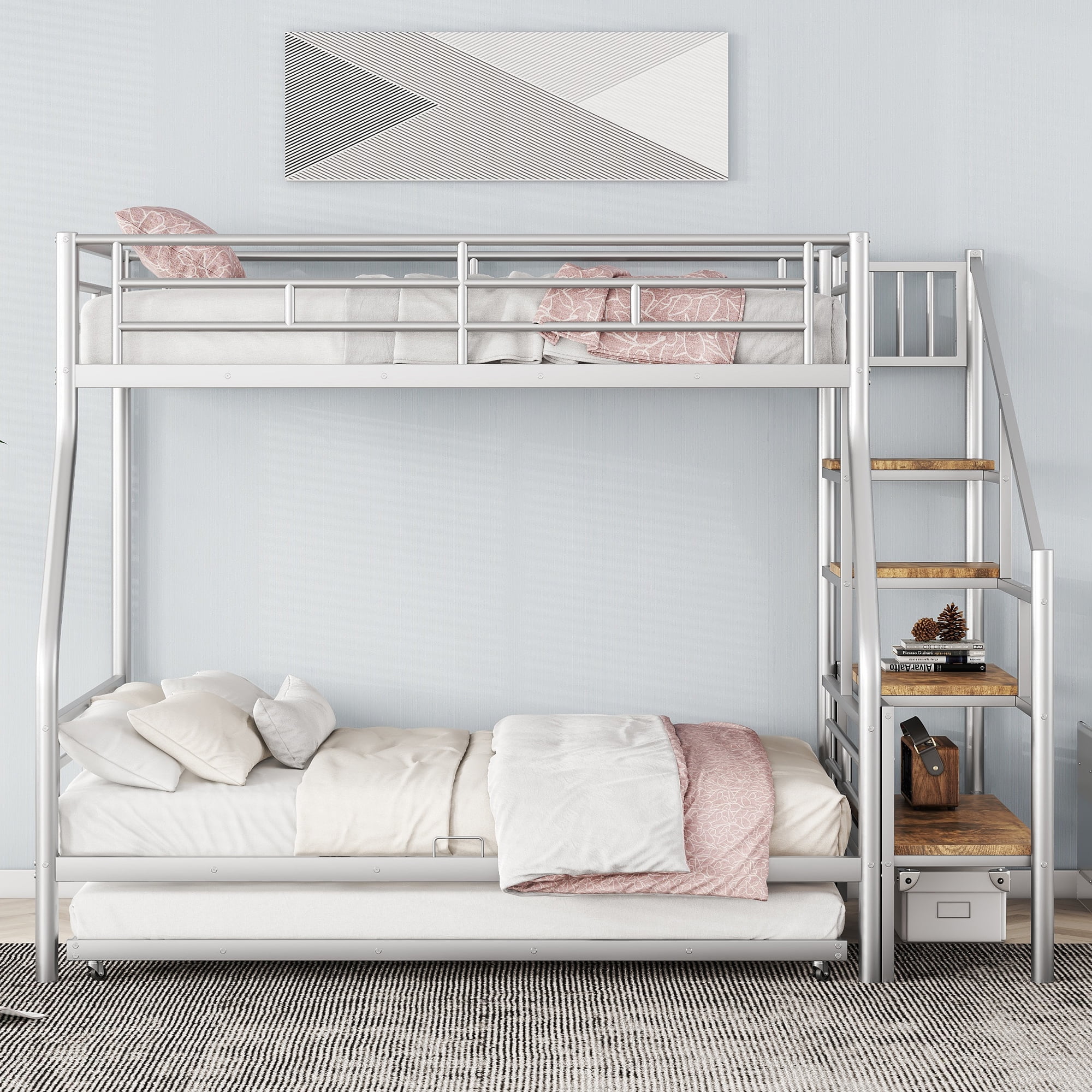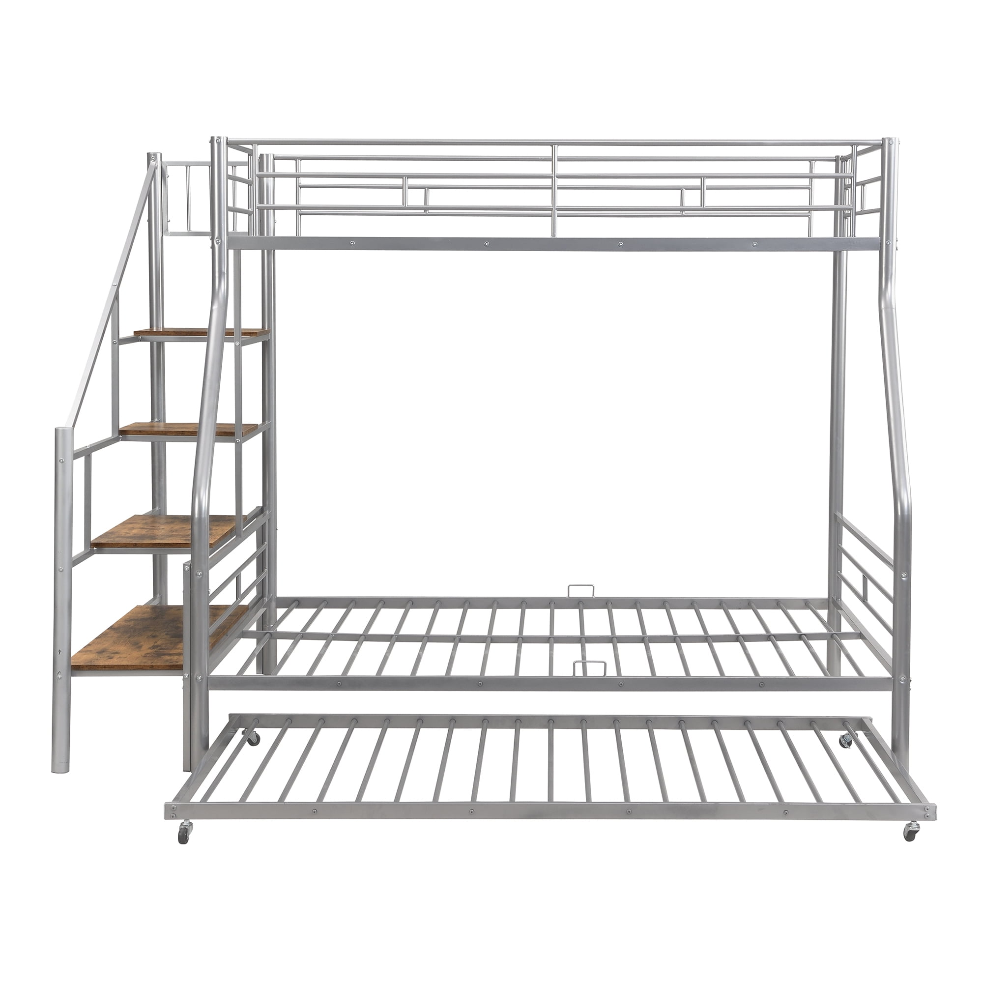 Euroco Metal Twin over Full Bunk Bed with Storage Staircase and Trundle Bed for Kids Teens Bedroom, Silver