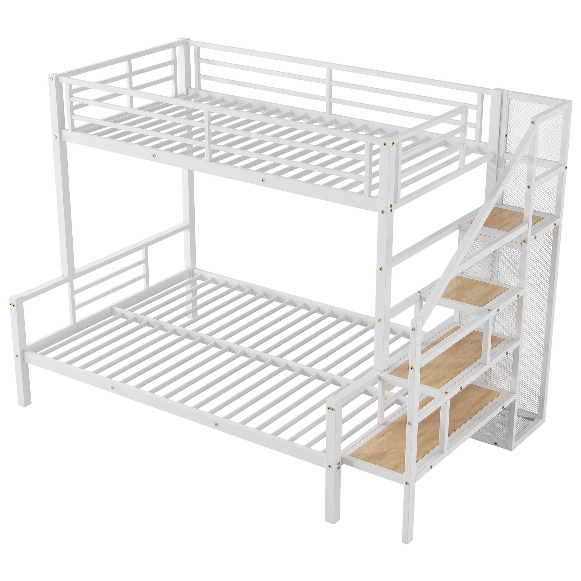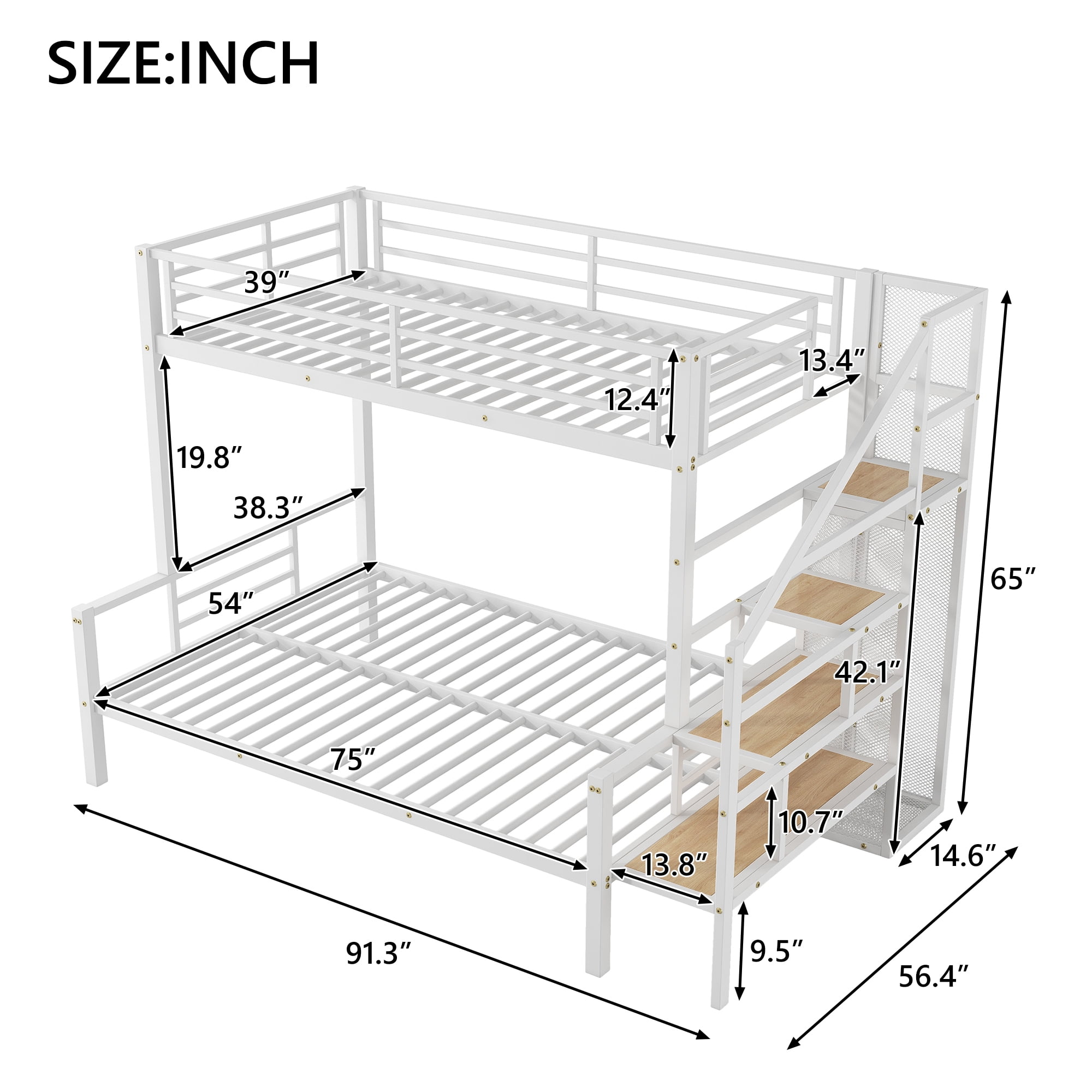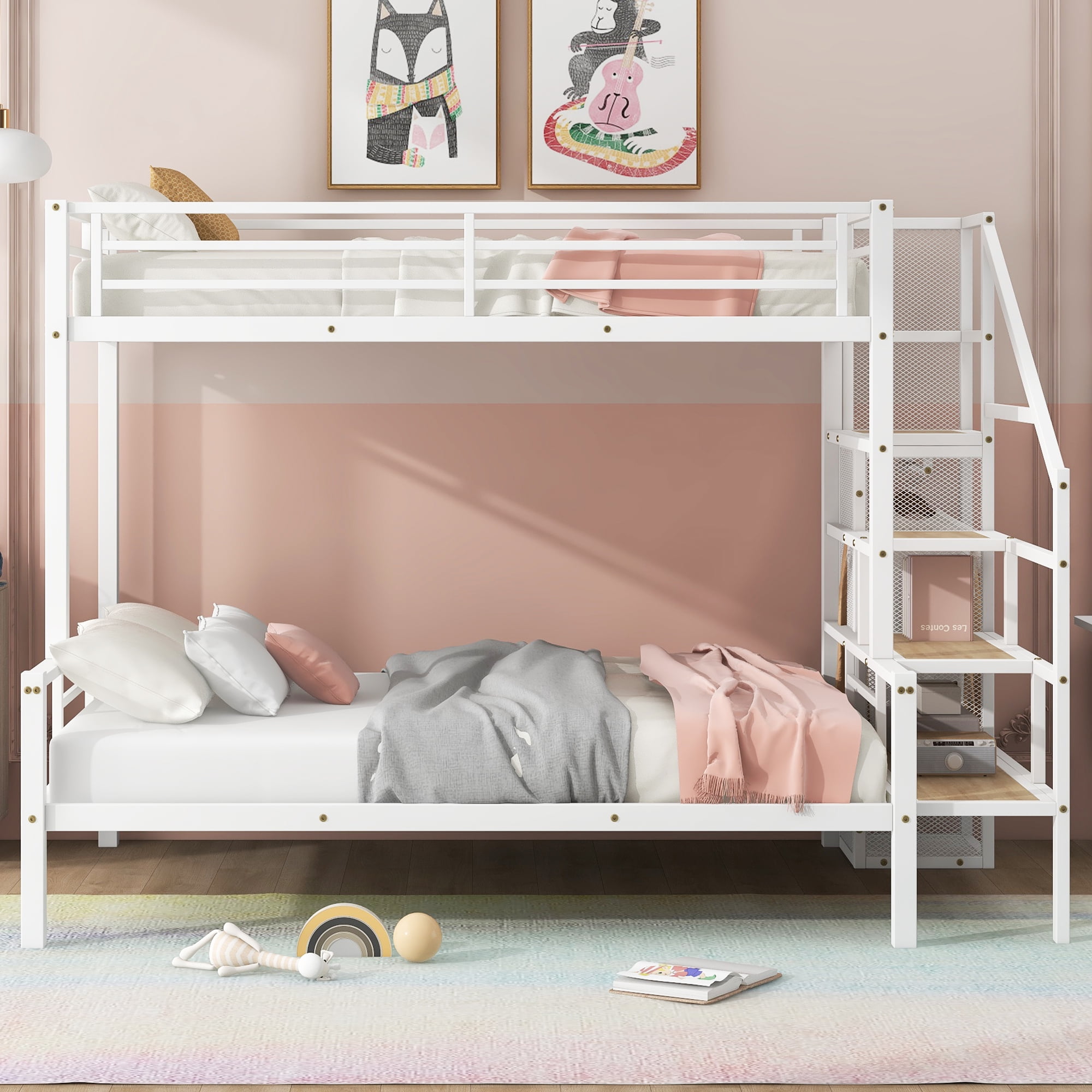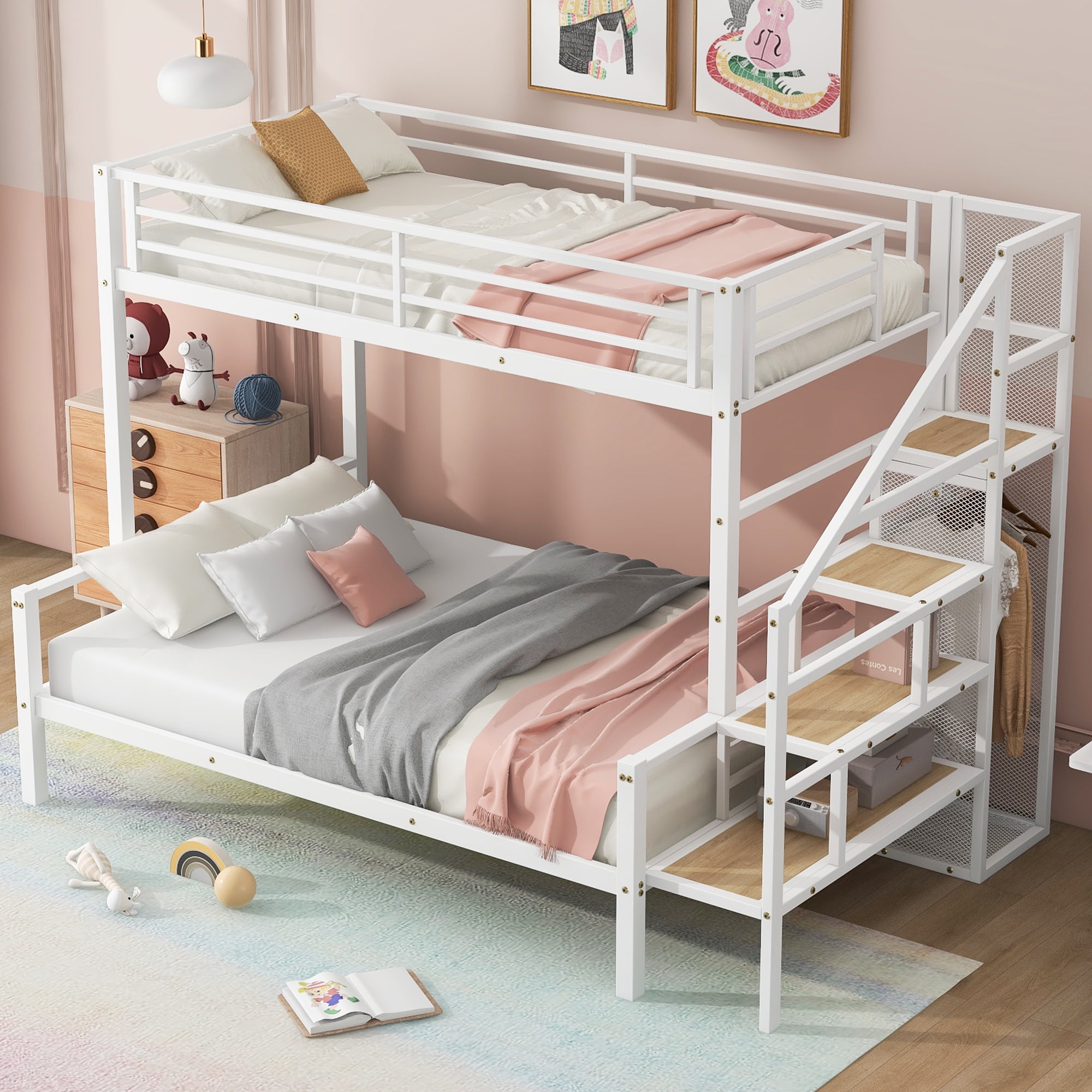 [Versatile Bed Configuration] This metal bunk bed features a smart design with a twin bed on top and a spacious full-size bed on the bottom, making it ideal for families or guest accommodations and providing an excellent space-saving solution. [Storage Staircase] The side of the bed is equipped with a step-style ladder that not only facilitates access to the top bunk but also offers additional storage space.Each step can be used to store books, toys, or other small items, enhancing the functionality of the space. [Built-in Wardrobe] A practical small wardrobe with a hanging rod is integrated beneath the ladder, helping you organize clothes and keep the bedroom tidy, while saving additional closet space. [Sturdy Construction] Built with a robust metal frame, this bunk bed twin over full ensures durability. With a top bunk supporting up to 200lbs and the bottom bed up to 400lbs, it provides reliable stability and strength for everyday use. [Easy to Assemble] All parts included in your package are indicated clearly. With step-by-step installation manual and per-drilled holes, you can easily assemble this product individually.Manual installation is recommended.