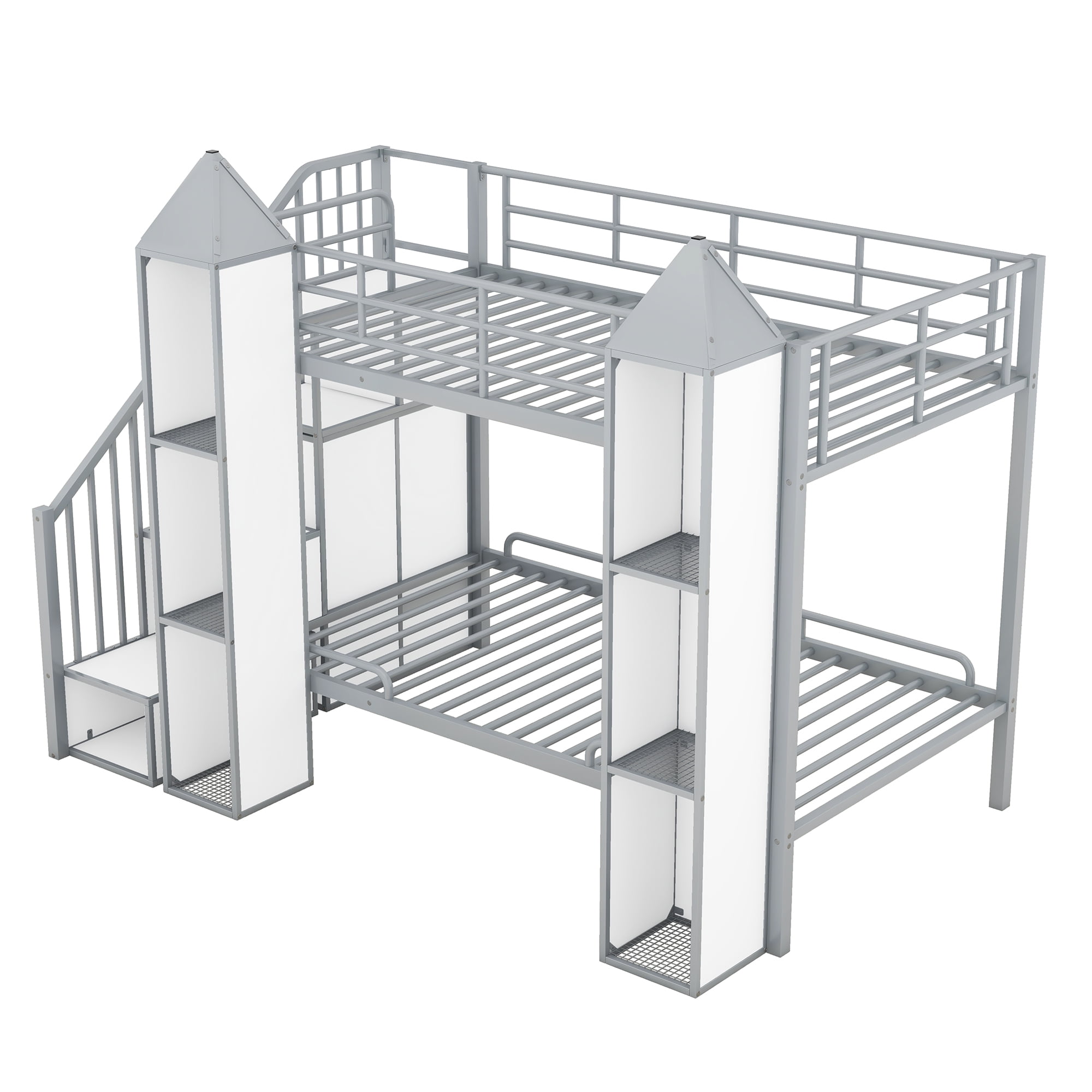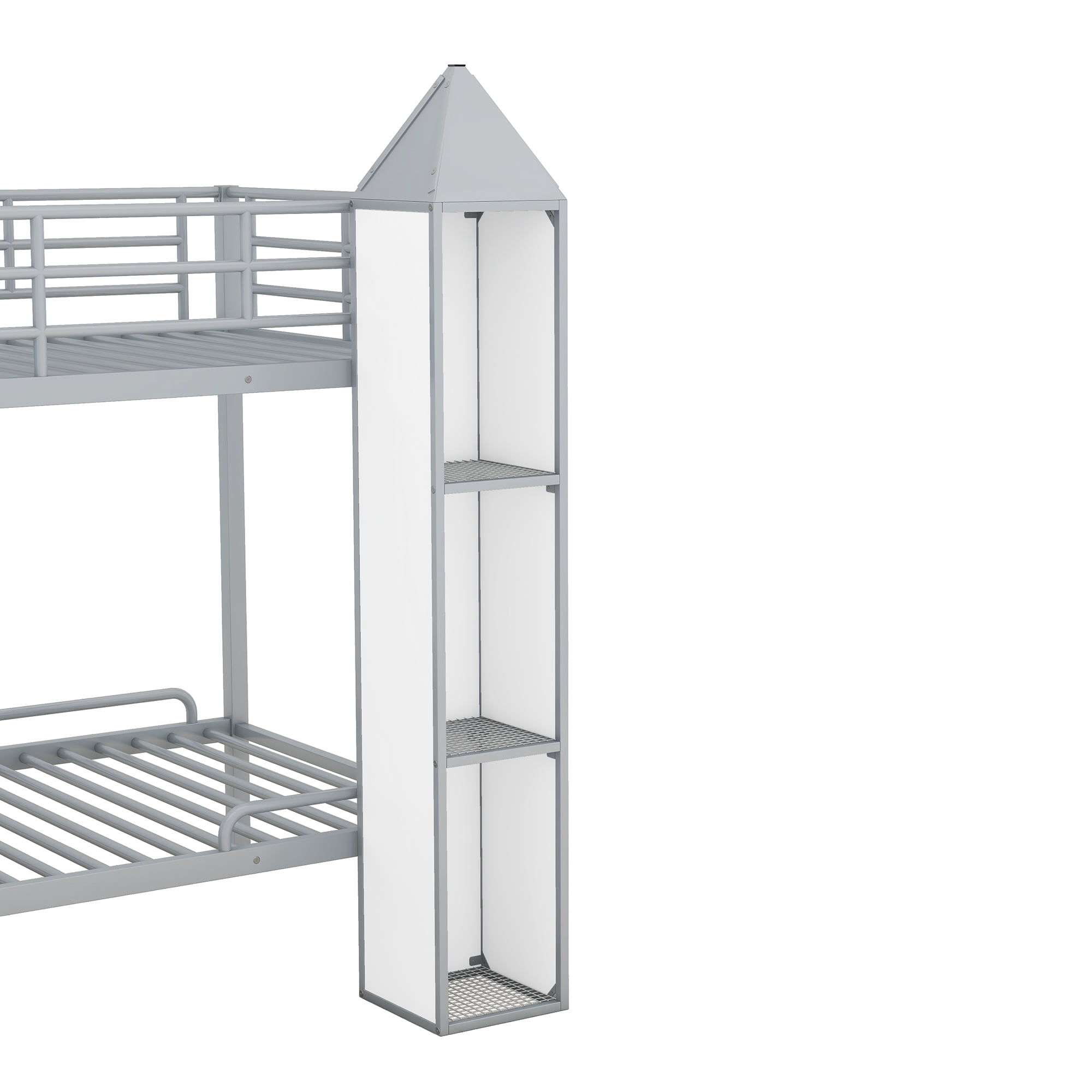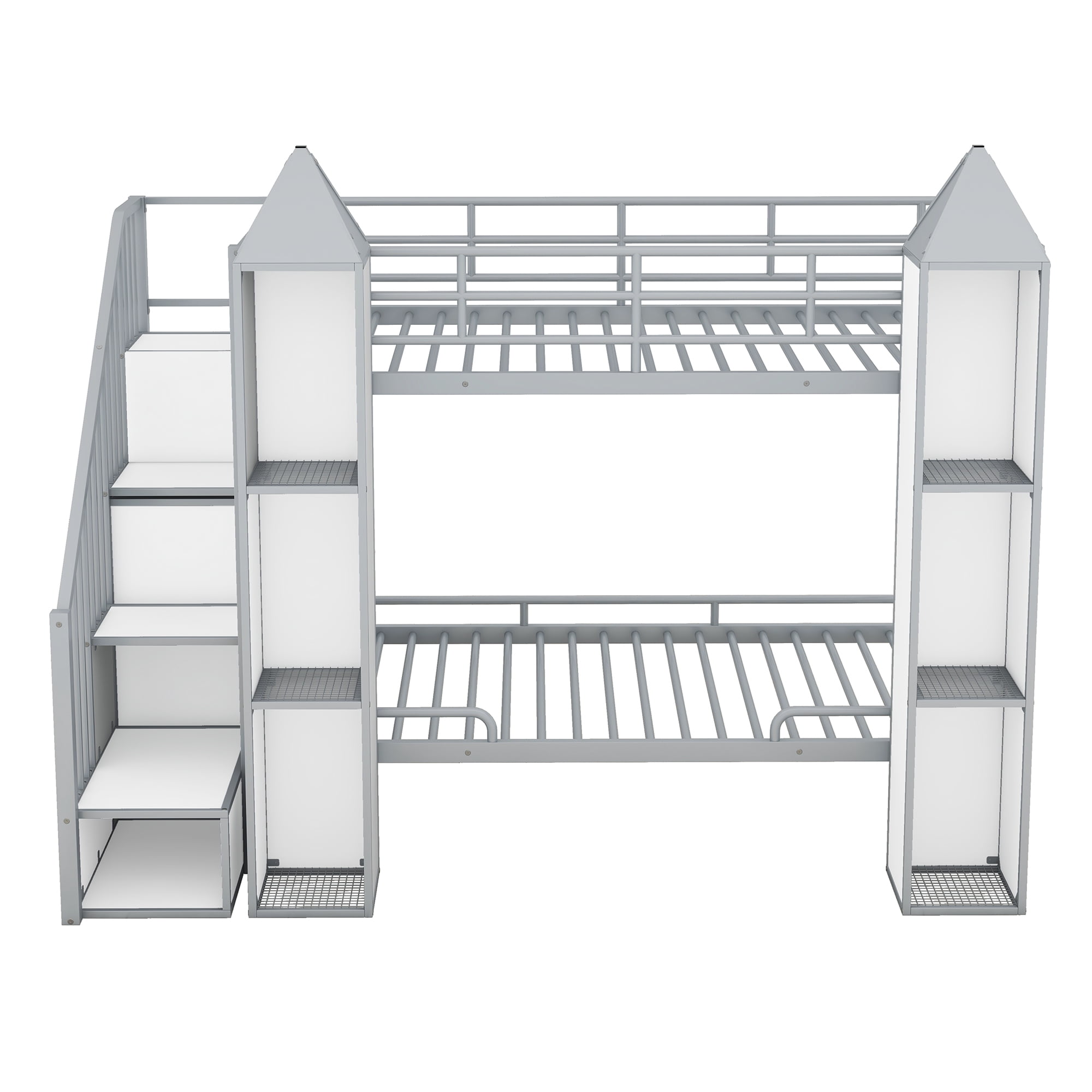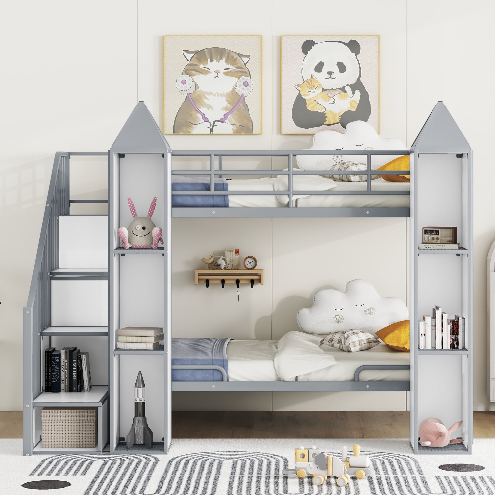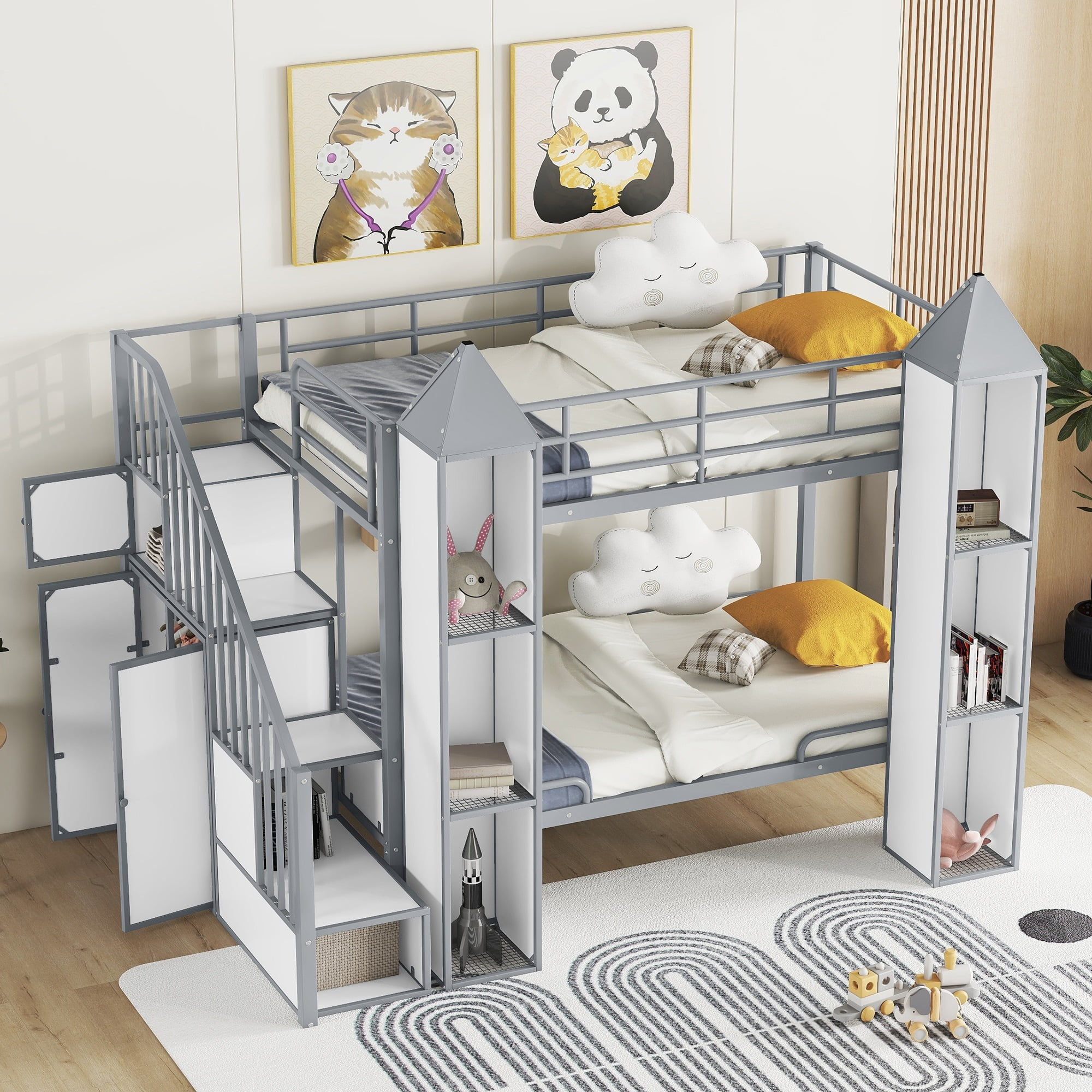 Features: [Castle Bunk Bed]: Castle shaped bunk bed make your kids room eye-catching. Bunk bed design will suit more kids and enough storage room can make room tidy and organized. [Compact Design]: Give your little ones, growing kids and those young teens the freedom and space to host friends or a sleeping solution for an older child and younger sibling with this twin over twin bunk bed. [Bookcase and Wardrobe]: The space under the staircase is a big wardrobe with clothes hanger, which is good for your daily clothes or beddings. The staircase can also use for storage and the 2 three tier shelf can use of display or a bookcase. [Wear-Resistant Finish]: Metal bunk bed frame features a stunning black and white power coated finish formulated for wear-resistance to protect the surface from scratches. Solid design will serve your family for many years. [Safe for Child]: This bunk bed has built-in staircase attached to the bed which provide easy access to top bed. Full length guardrails make it safer for your kids on the upper and lower beds to sleep. [Easy to Assemble]: This metal bunk bed will come in 2 packages with clear instructions and hardware. All necessary tools you need for the bed will come along with the package. Following the instruction and you will get your bunk bed! Specification: Size: Twin over Twin Overall Product Dimension: 92.9”L x 53.2”W x 63”H Inner Size: 75.2″x 39″ Overall Product Weight: 232lb Bed Weight Capacity: 250 lb Mattress Included: No Total Height: 63” Assembly Required: Yes Recommend Bed Mattress Thickness: 6”/8-10”