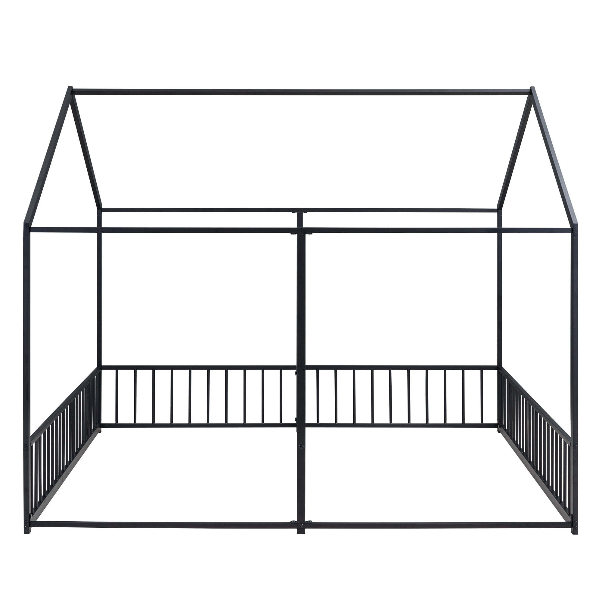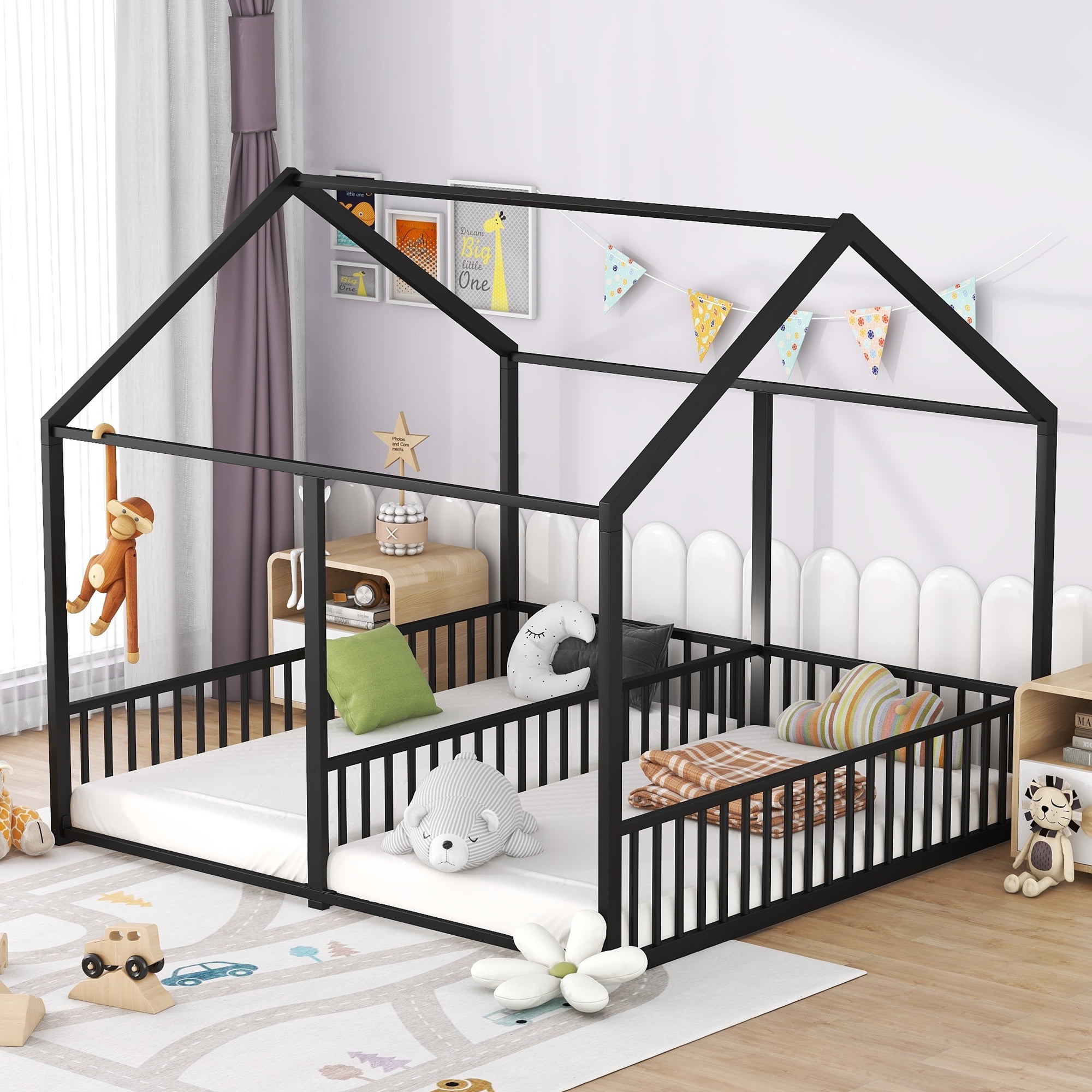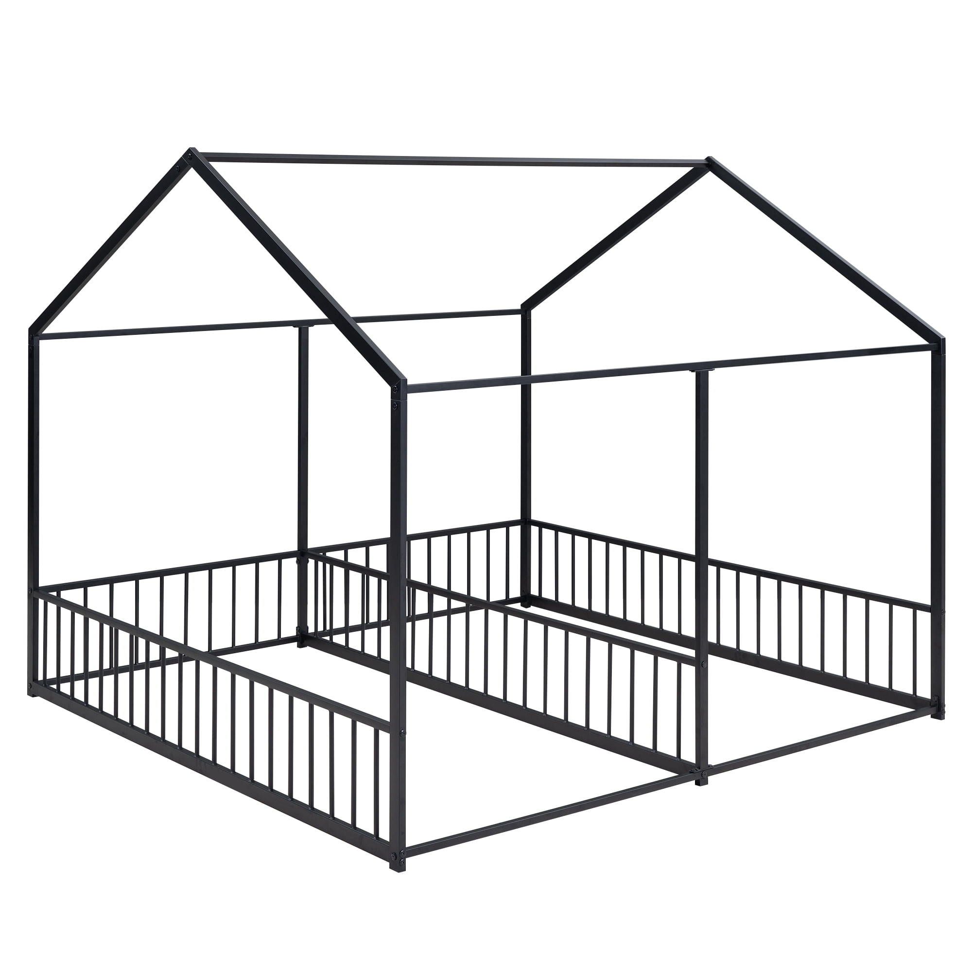 Features: [House Shaped Design]: This twin size double platform bed is designed with a roof and full mental frame, creating a comfortable space not only for sleeping, but also for family to play and have fun. [Side by Side Beds]: This two twin size beds are side by side, so that your two kids will not need to climb to the upper bed. It will be convenient and safe for both kids. The guardrails between two beds will protect child in the one hand and will not obstruct their communication in the other hand. [Solid Construction]: This house platform bed is made from metal, which will stand the test of time to serve your family for many years. Sturdy metal slat kits are included and box spring are not needed. [Easy to Assemble]: All the parts and tools needed for the assembly will be in the packages. It will be useful for you to assembly this bed. You just need to follow the instructions to assemble your own bed. Specification: Size: Twin Overall Product Dimension: 80.3″L*77.5″W*67.1″H Each Bed Inner Size: 75.2″x 39″ Overall Product Weight: 57.5lb Each Bed Weight Capacity: 250lb Mattress Included: No Total Height: 67.1″ Assembly Required: Yes twin beds in one metal frame