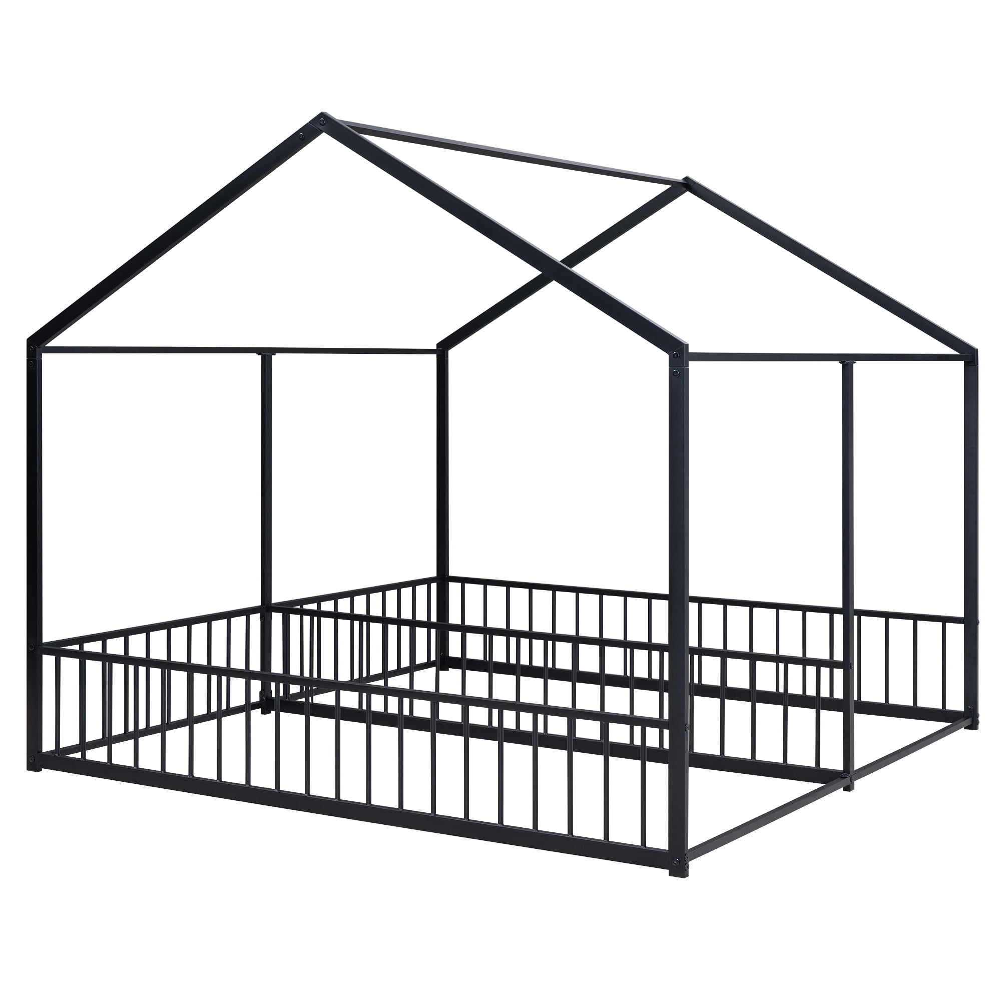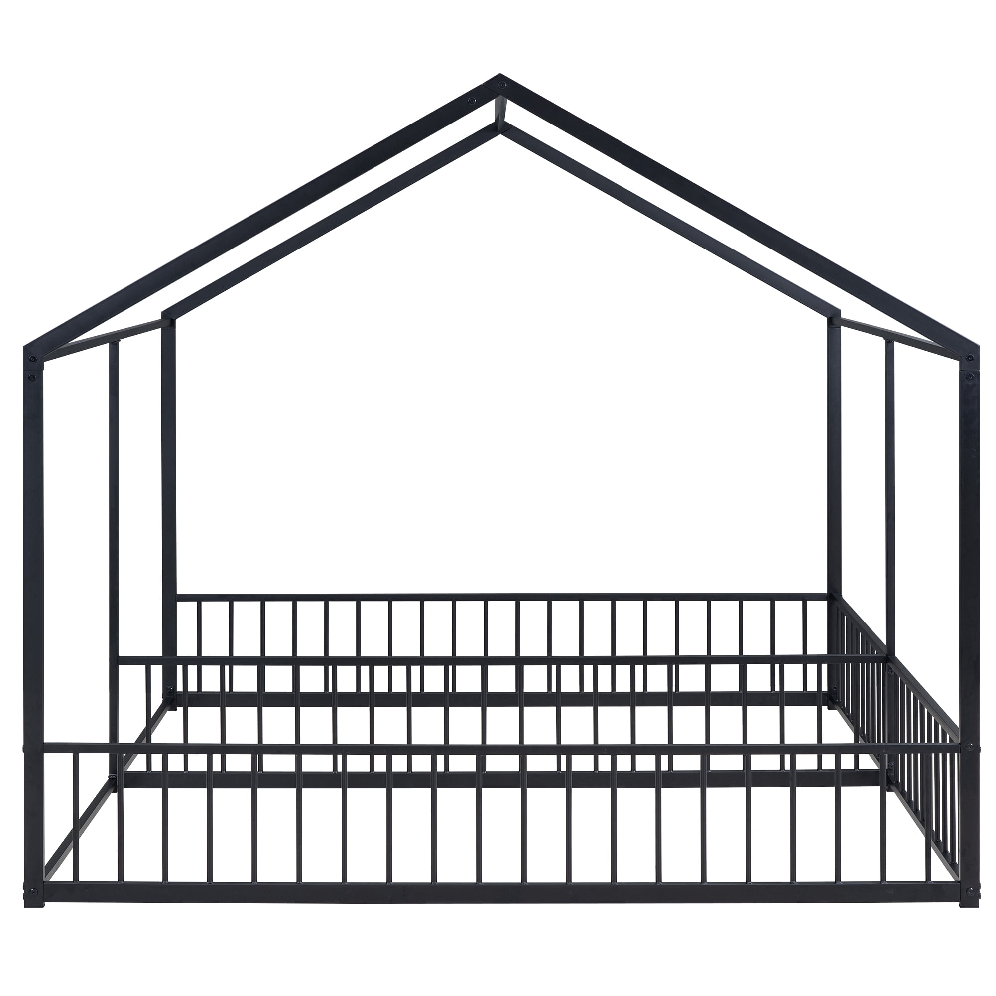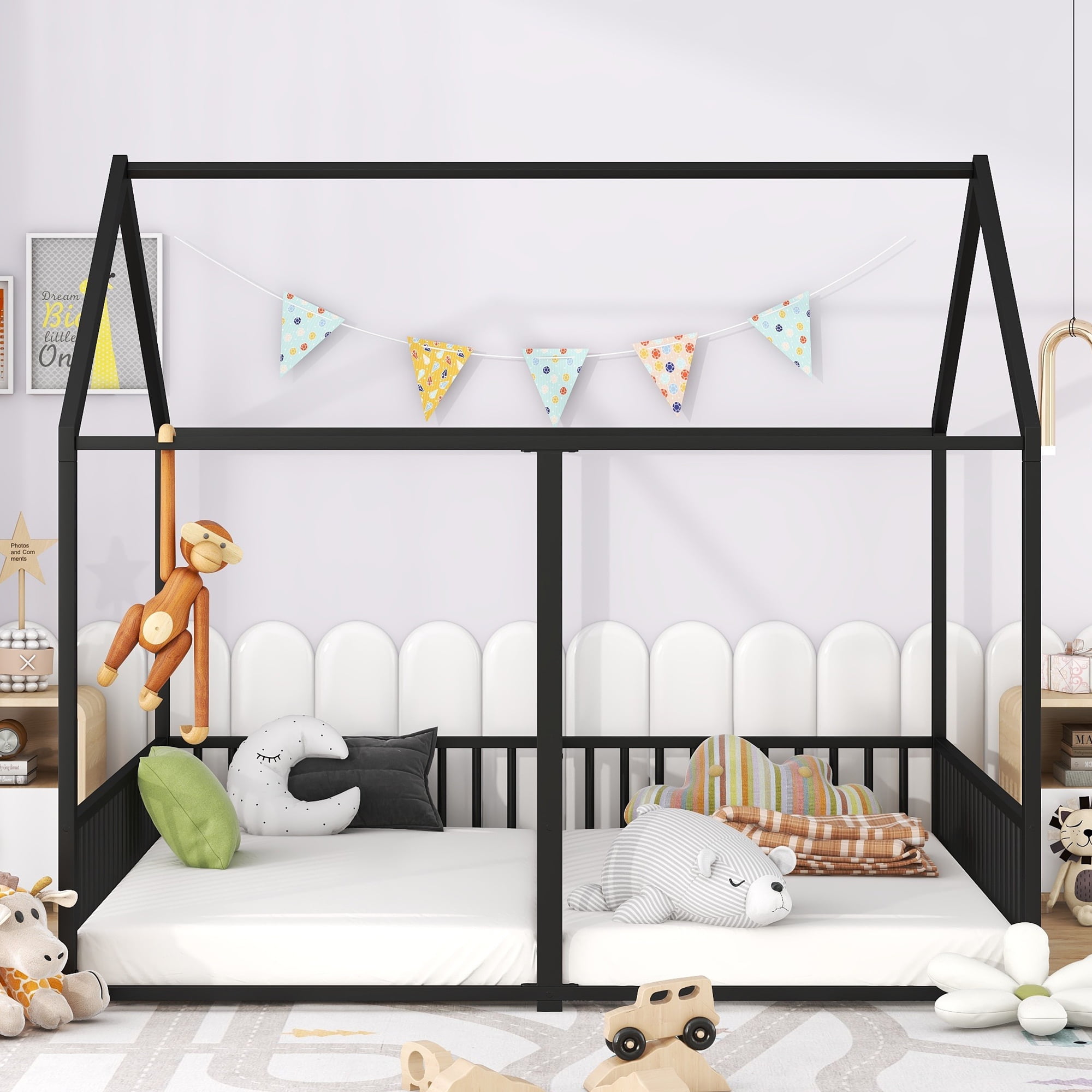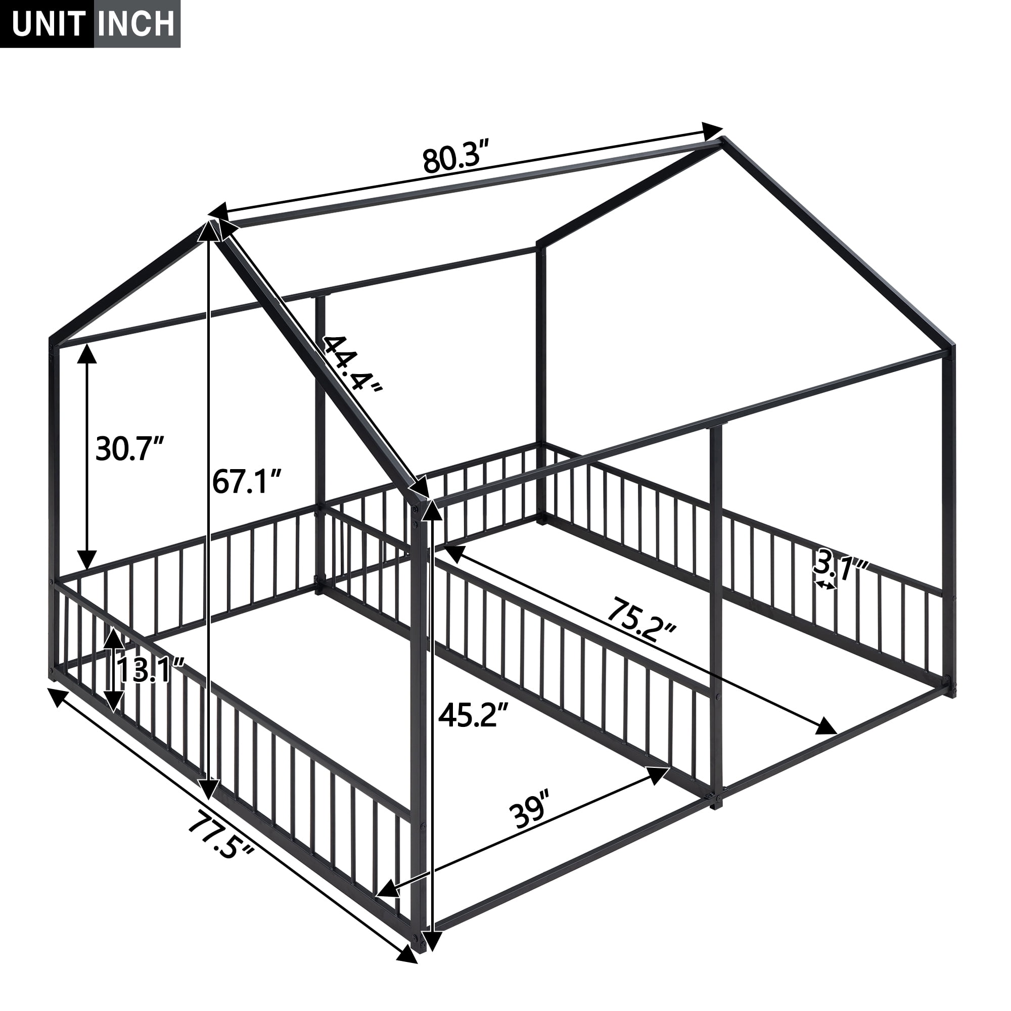 Features: [House Shaped Design]: This twin size double platform bed is designed with a roof and full mental frame, creating a comfortable space not only for sleeping, but also for family to play and have fun. [Side by Side Beds]: This two twin size beds are side by side, so that your two kids will not need to climb to the upper bed. It will be convenient and safe for both kids. The guardrails between two beds will protect child in the one hand and will not obstruct their communication in the other hand. [Solid Construction]: This house platform bed is made from metal, which will stand the test of time to serve your family for many years. Sturdy metal slat kits are included and box spring are not needed. [Easy to Assemble]: All the parts and tools needed for the assembly will be in the packages. It will be useful for you to assembly this bed. You just need to follow the instructions to assemble your own bed. Specification: Size: Twin Overall Product Dimension: 80.3″L*77.5″W*67.1″H Each Bed Inner Size: 75.2″x 39″ Overall Product Weight: 57.5lb Each Bed Weight Capacity: 250lb Mattress Included: No Total Height: 67.1″ Assembly Required: Yes twin beds in one metal frame