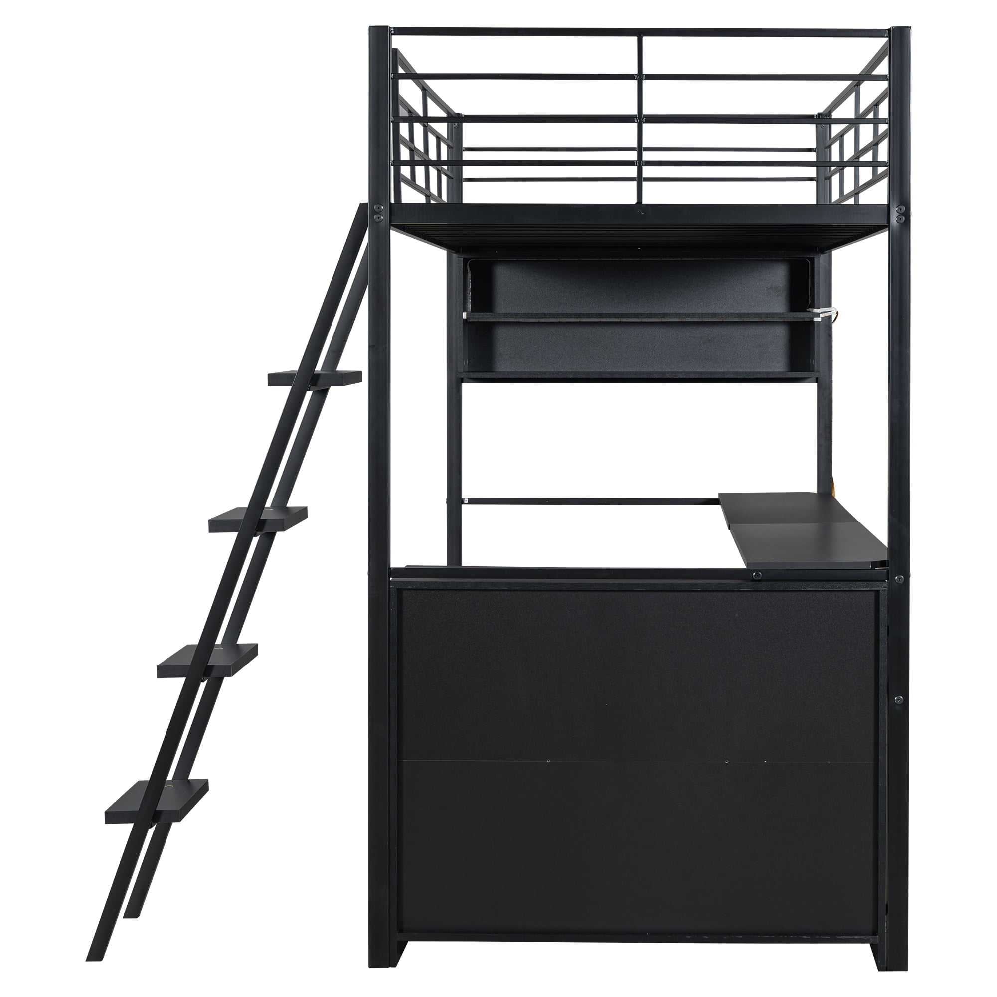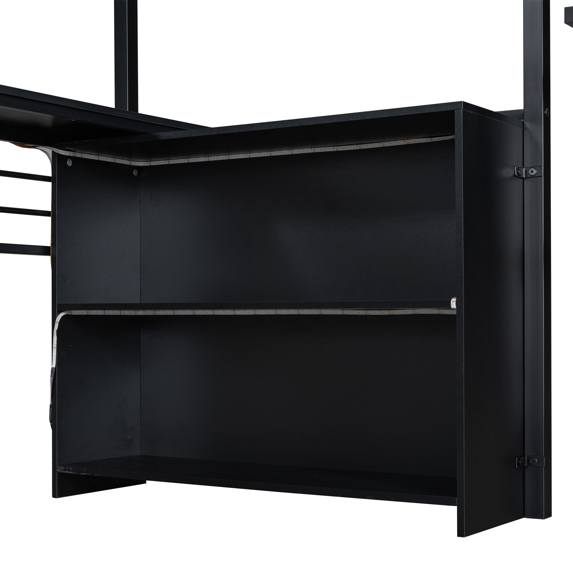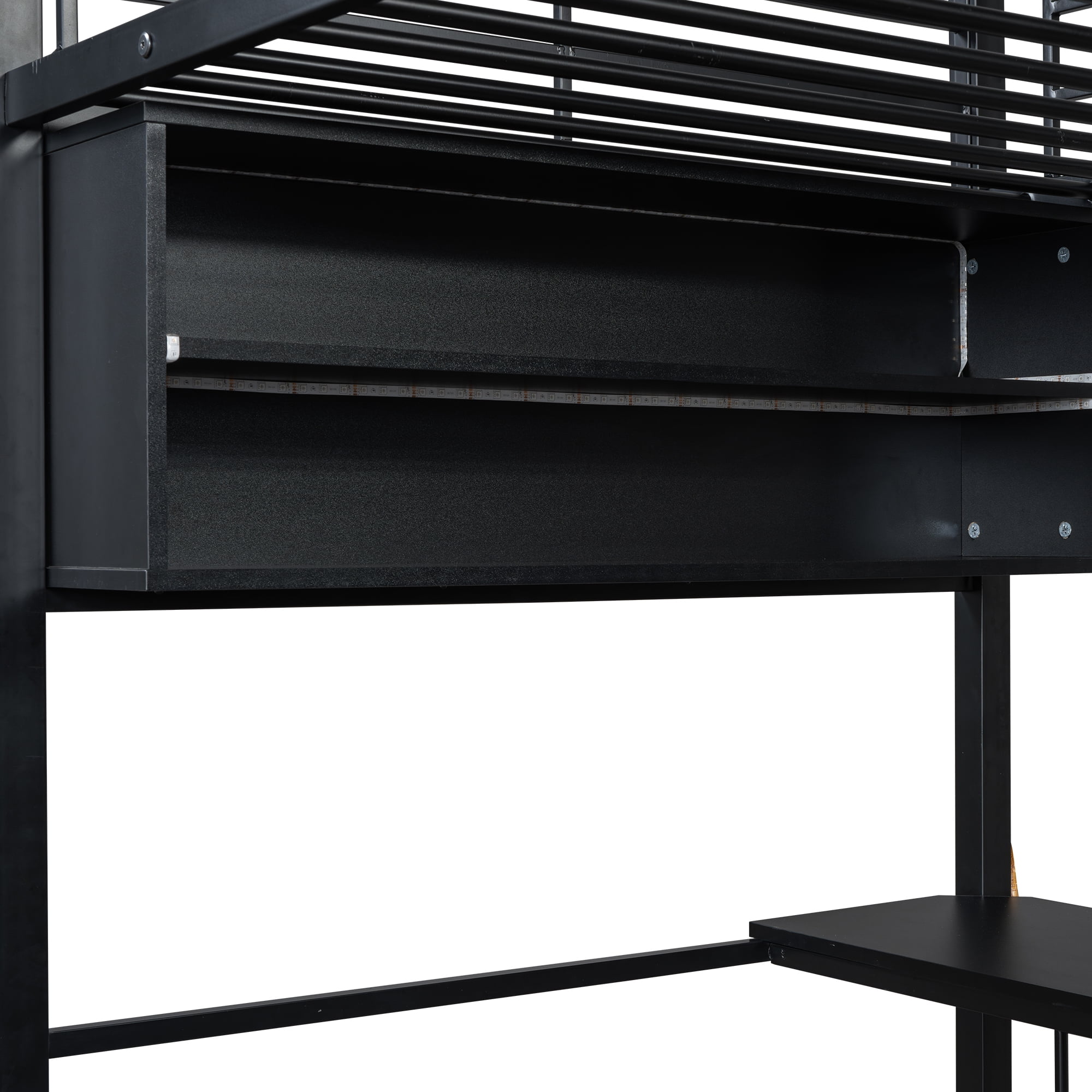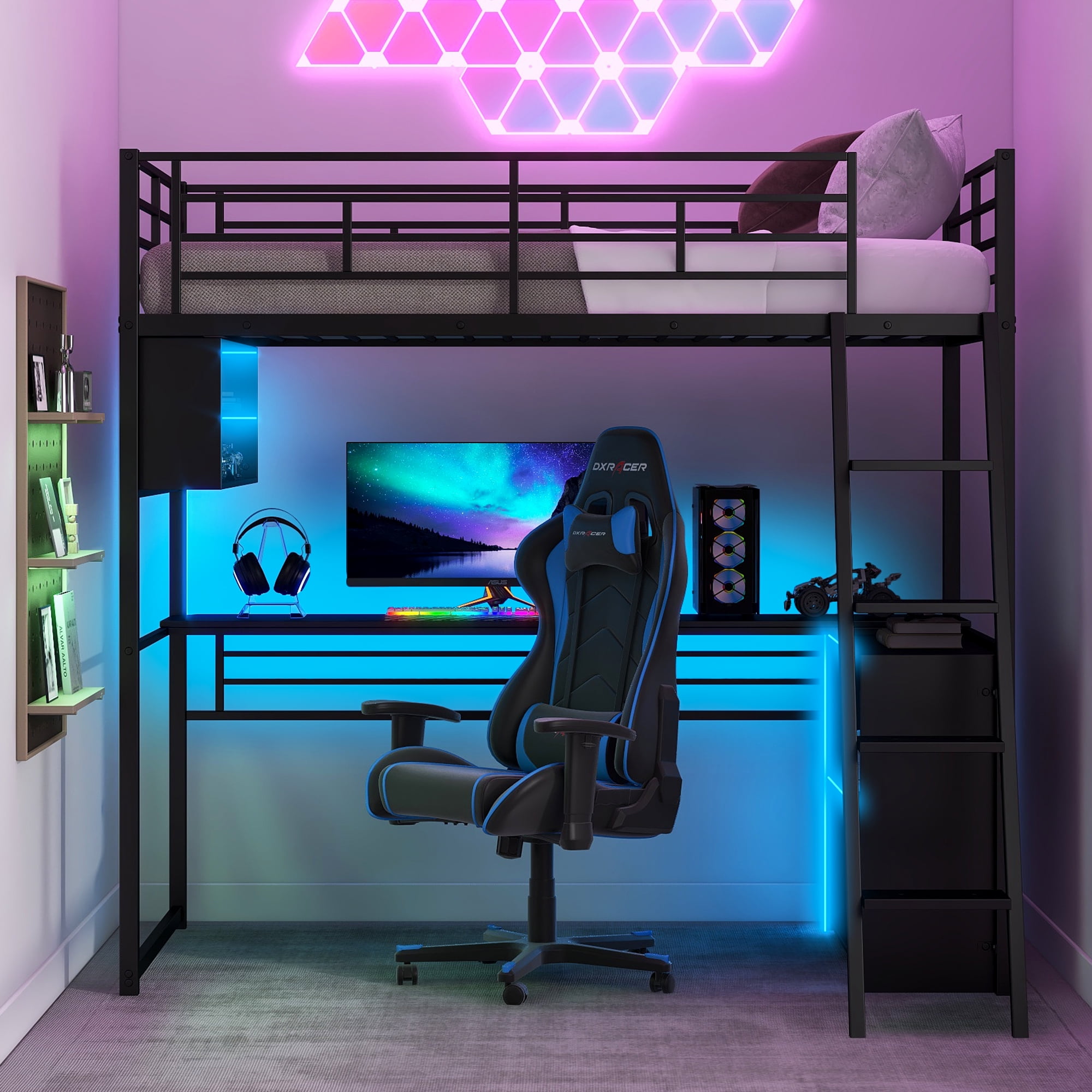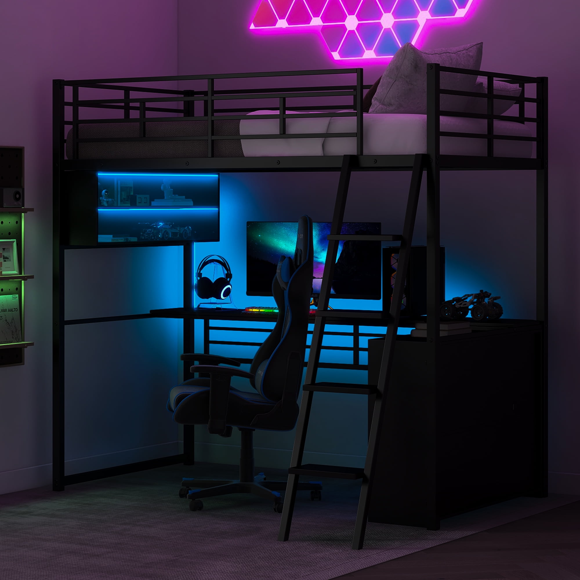 Features: [Gaming Loft Bed]: This bed is designed for gaming lovers and the desk is stable enough for computers or TVs. The LED light around the bed adds the gaming atmosphere and you can choose different colors to match your feeling. [Desks and Shelves]: This loft bed is equipped with a desk and shelves, so you can easily turn the bedroom into a working station for kids to do homework. Three tier shelf is good for kids to place books, toys and other accessories. [Solid Construction]: Constructed from solid metal, this loft bed will stand the test of time and last for years. Loft bed has full length headboard and footboard to keep your mattress in place and also keep your kids safe. [Easy to Assemble]: All the parts and tools needed will be packed in the package. The instruction and the accessories are also included in the package. Just follow the instruction, and then you will get your own gaming bed. Specification: Size: Twin Overall Product Dimension: 77.5”L x 41.4”W x 73.1”H Inner Size: 75.2” x 39” Overall Product Weight: 145lb Bed Weight Capacity: 250lb Mattress Included: No Total Height: 73.1″ Assembly Required: Yes Recommend Bed Mattress Thickness: 8” Material: Metal+MDF Spring Box: No need