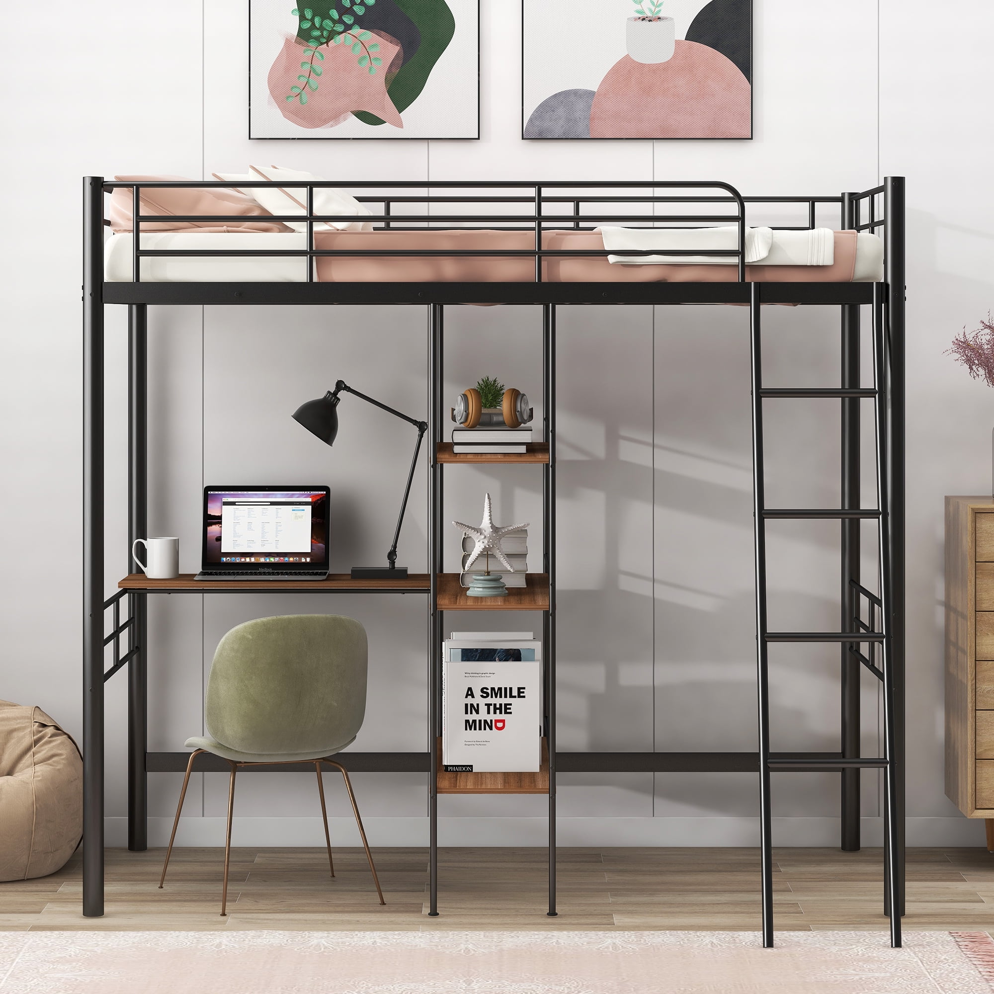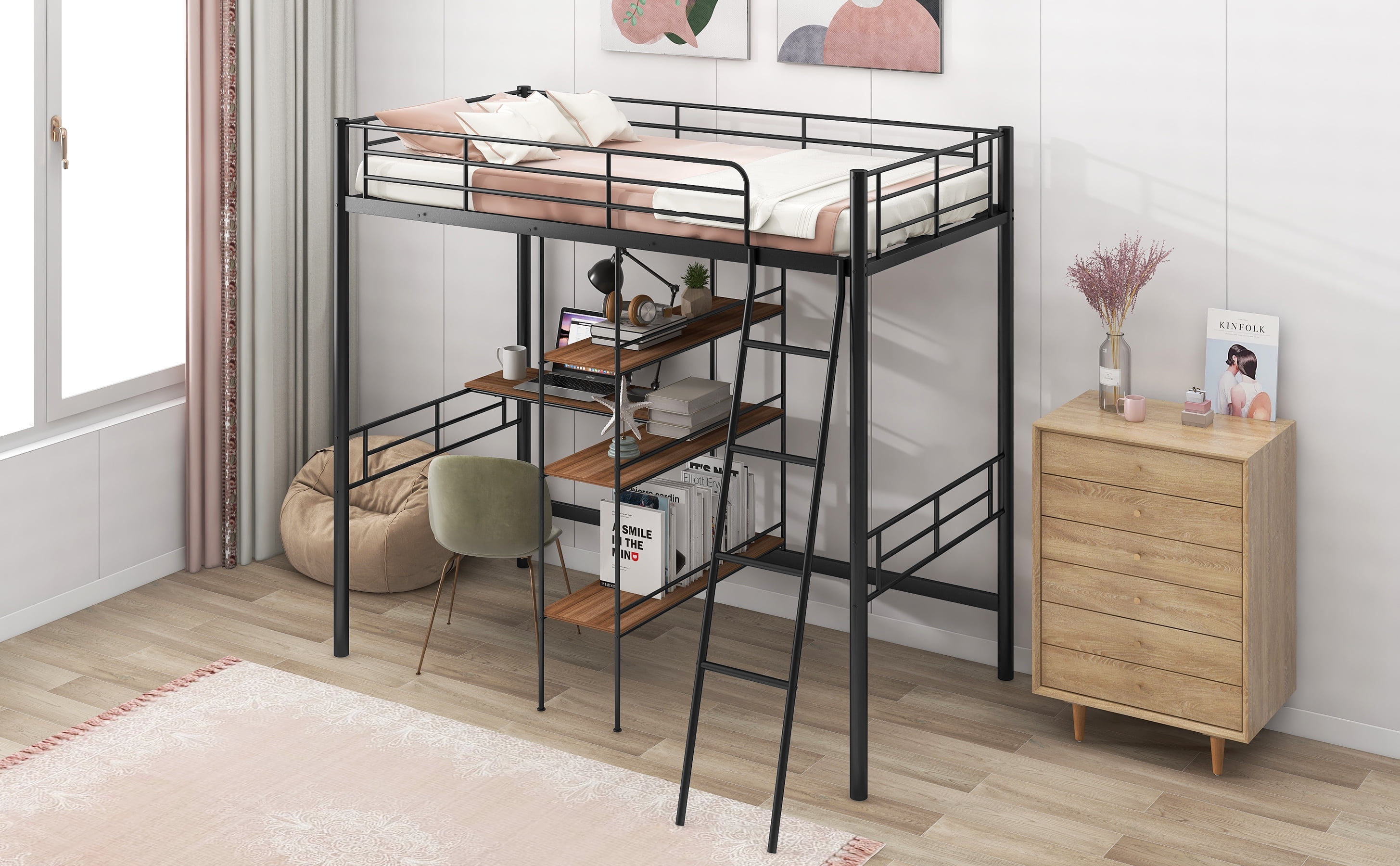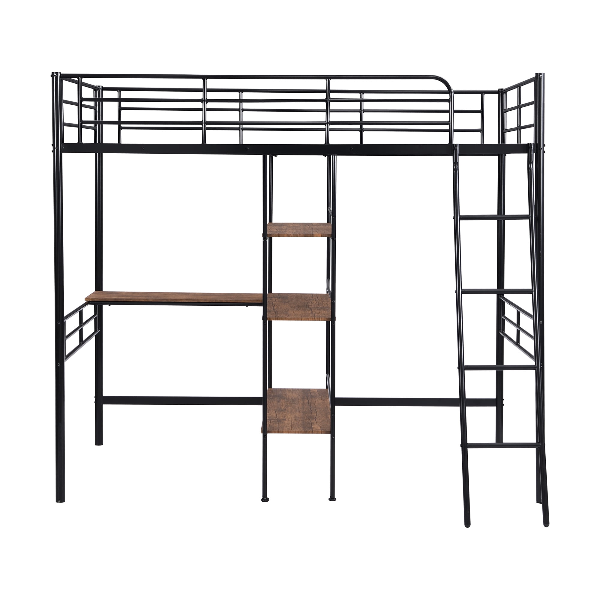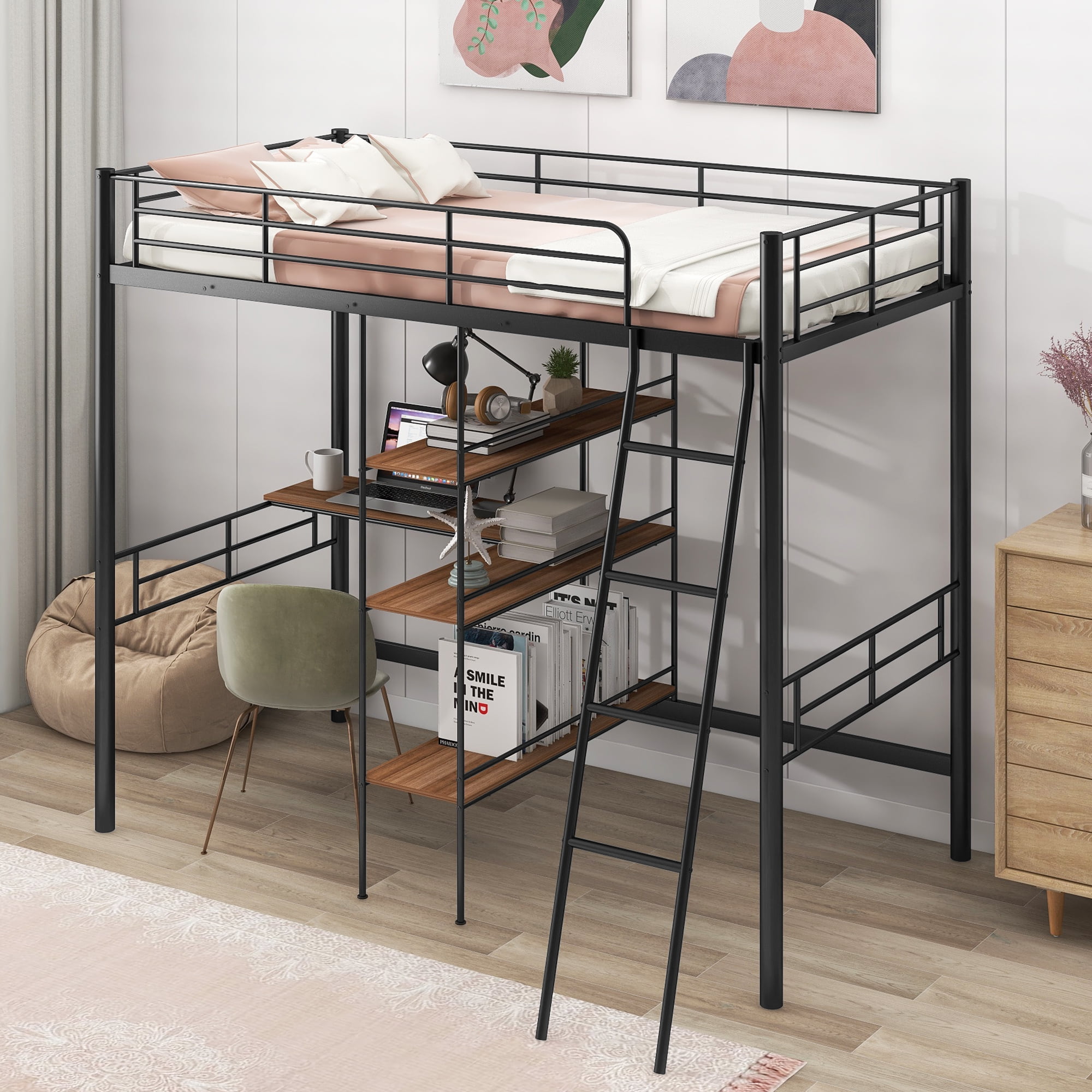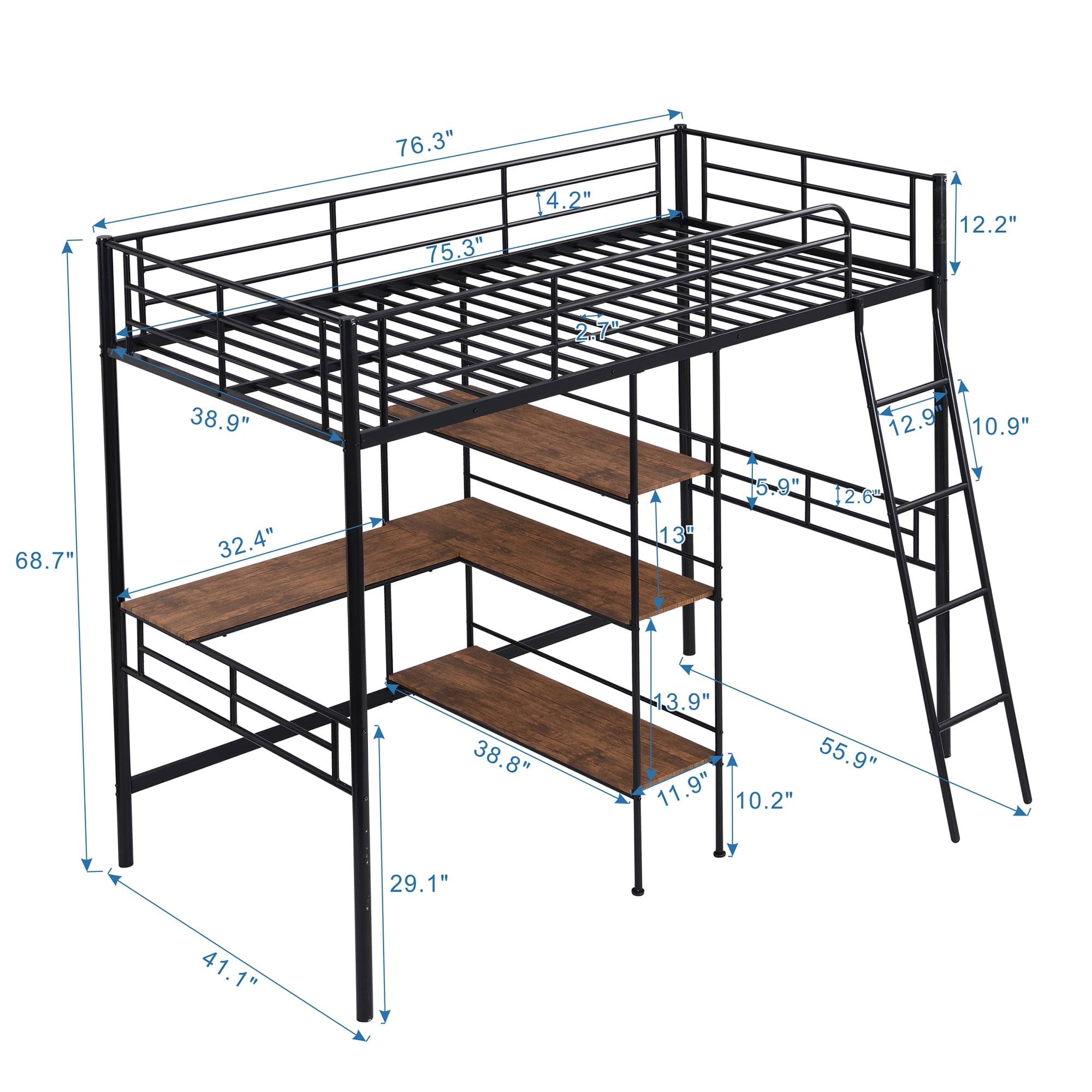 Features: [Space Saving]: This loft bed comes with a desk under the bed and 3-tier shelves bookcase which can be created a personal workstation. This design not only has a comfortable sleeping space, but also has enough space below for you to study, play, and store belongings. [Desk and Shelf]: The built-in desk and shelf will make your bedroom into a work place. You can sturdy in the desk and place books and toys in the shelf. The desk and shelf are brown, which will make the bed more fashion. [Sturdy Construction]: The bed is made of heavy-duty steel, which provides good support for child. In addition, this metal loft bed is equipped with solid steel slats, which can be used without the use of a box spring. [Safe and Reliable]: The loft bed has a full-length guardrail over the upper bed to protect your kids from falling and ensure top safety for your children. The inclined ladder will make the bed more stable. [Easy to Assemble]: All the parts and tools needed for the assembly will be in the packages. It will be useful for you to assembly this bed. You just need to follow the instructions to assemble your own bed. Specification: Size: Twin Overall Product Dimension: 76.3″L*41.1″W*68.7″H Inner Size: 75.3″x 38.9″ Overall Product Weight: 96.3lb Weight Capacity: 250lb Mattress Included: No Total Height: 68.7″ Assembly Required: Yes Recommend Bed Mattress Thickness: 6”-8”