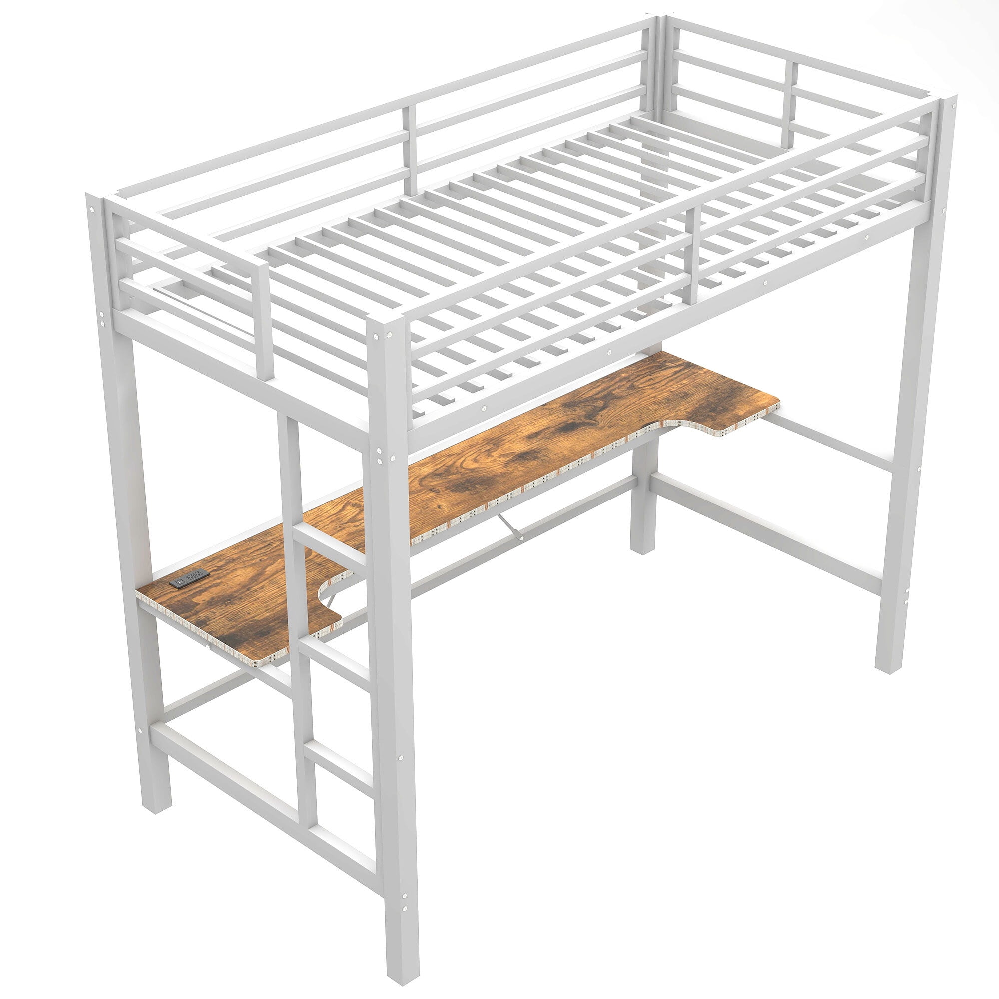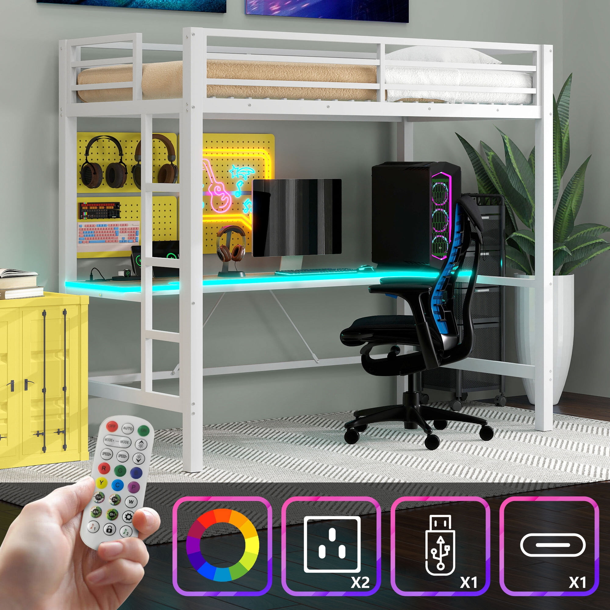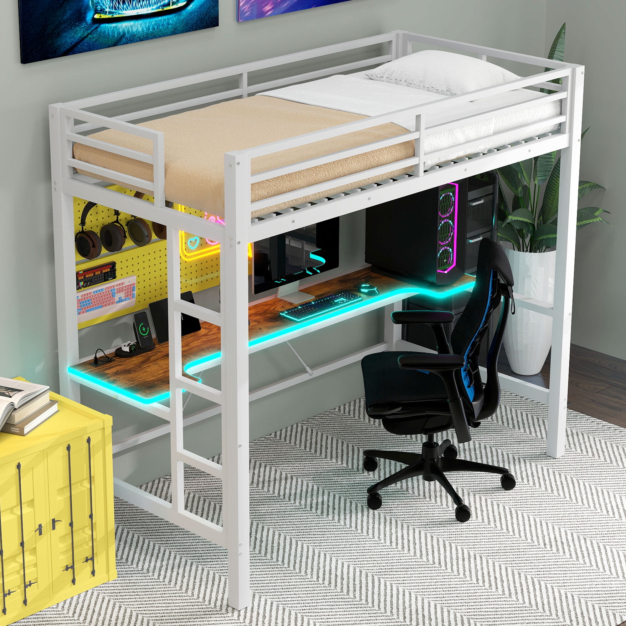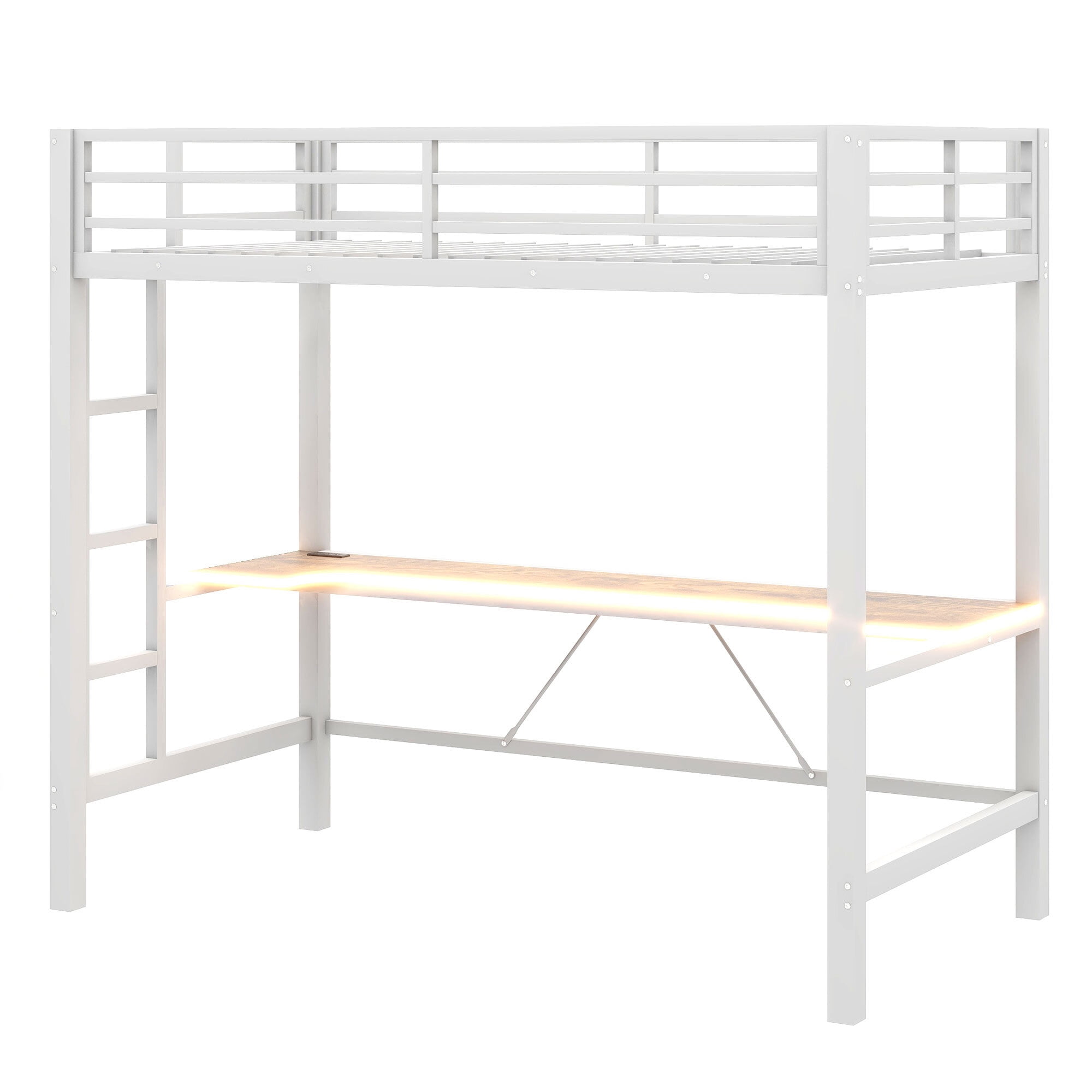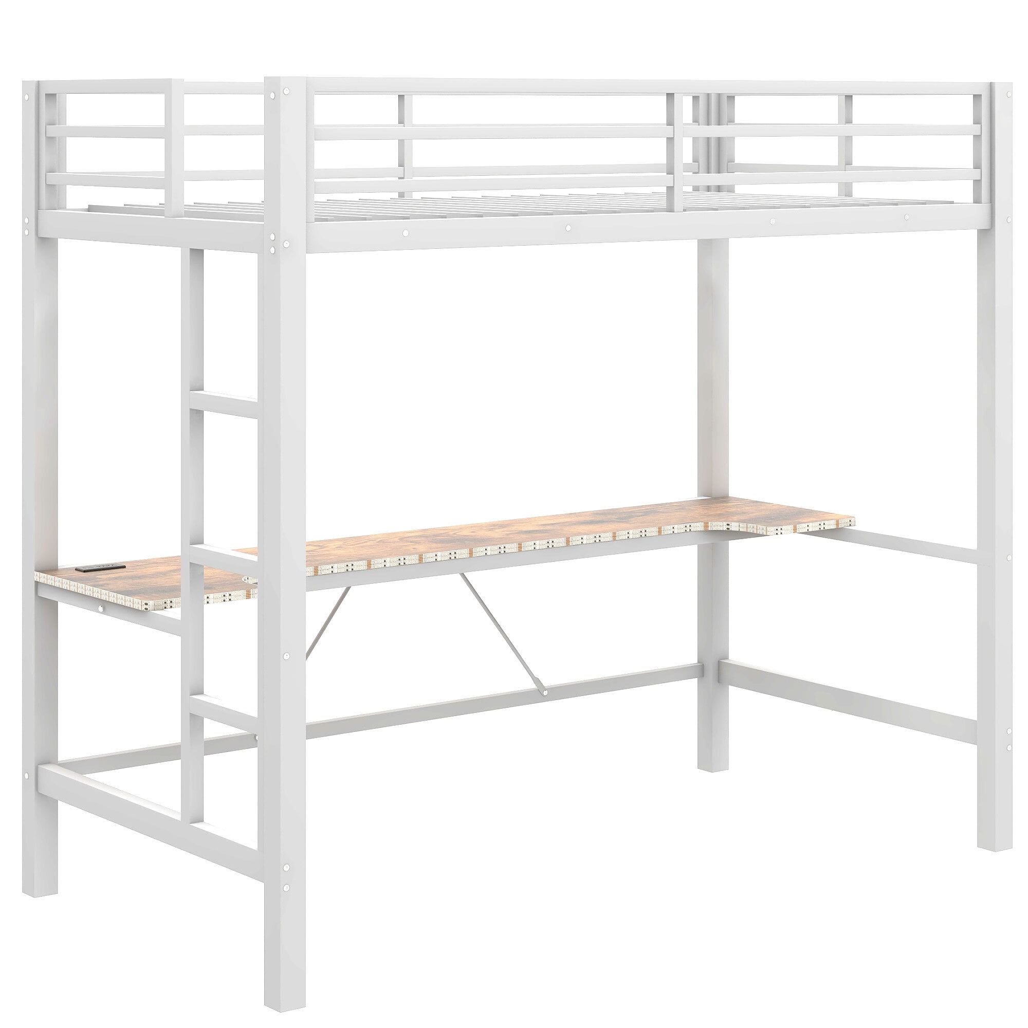 Euroco Metal Twin Size Loft Bed with Desk, Gaming Bed with LED Light and USB Charging for Kids Teens, White