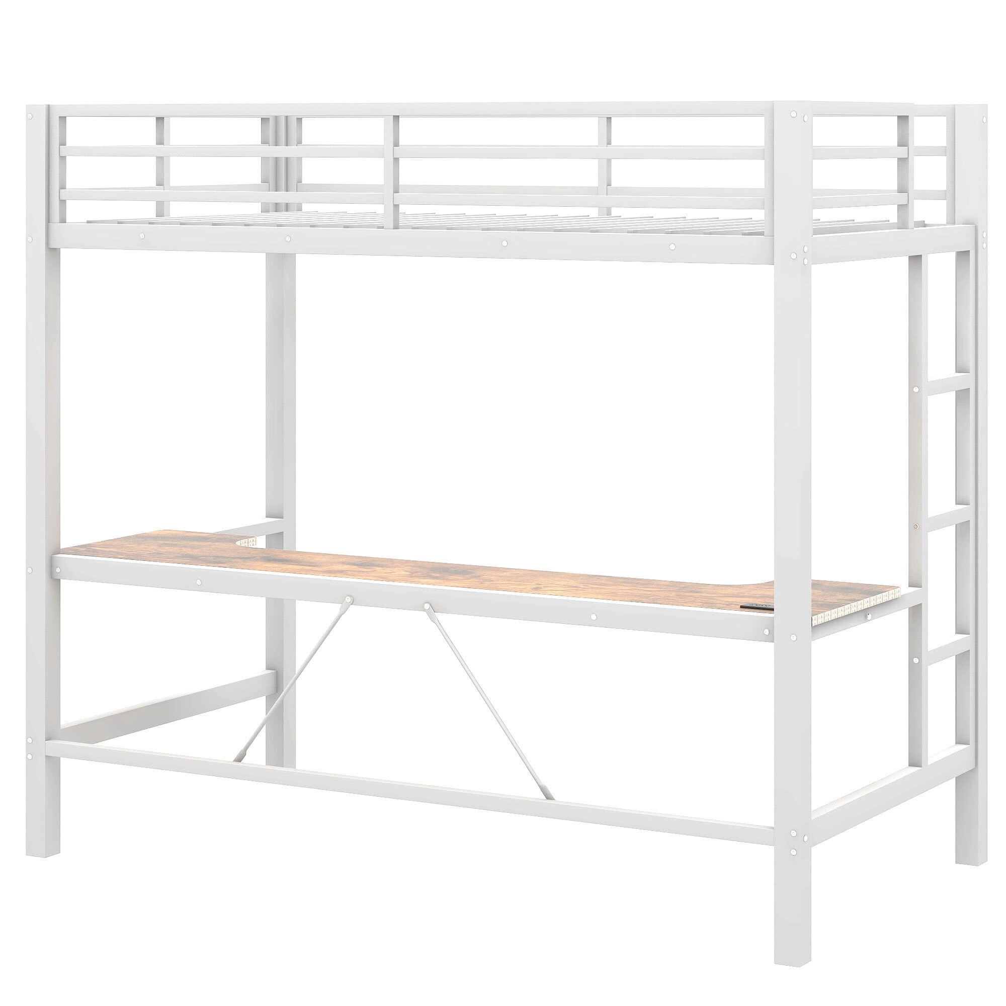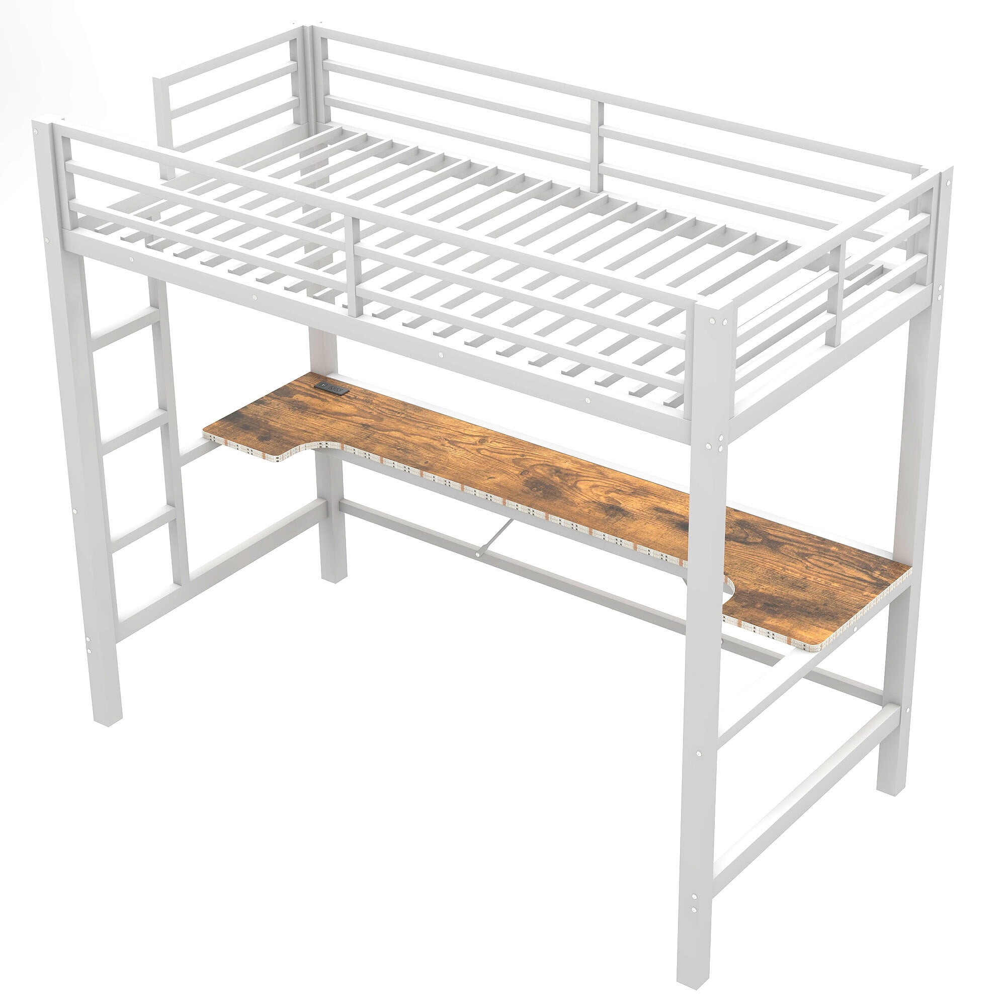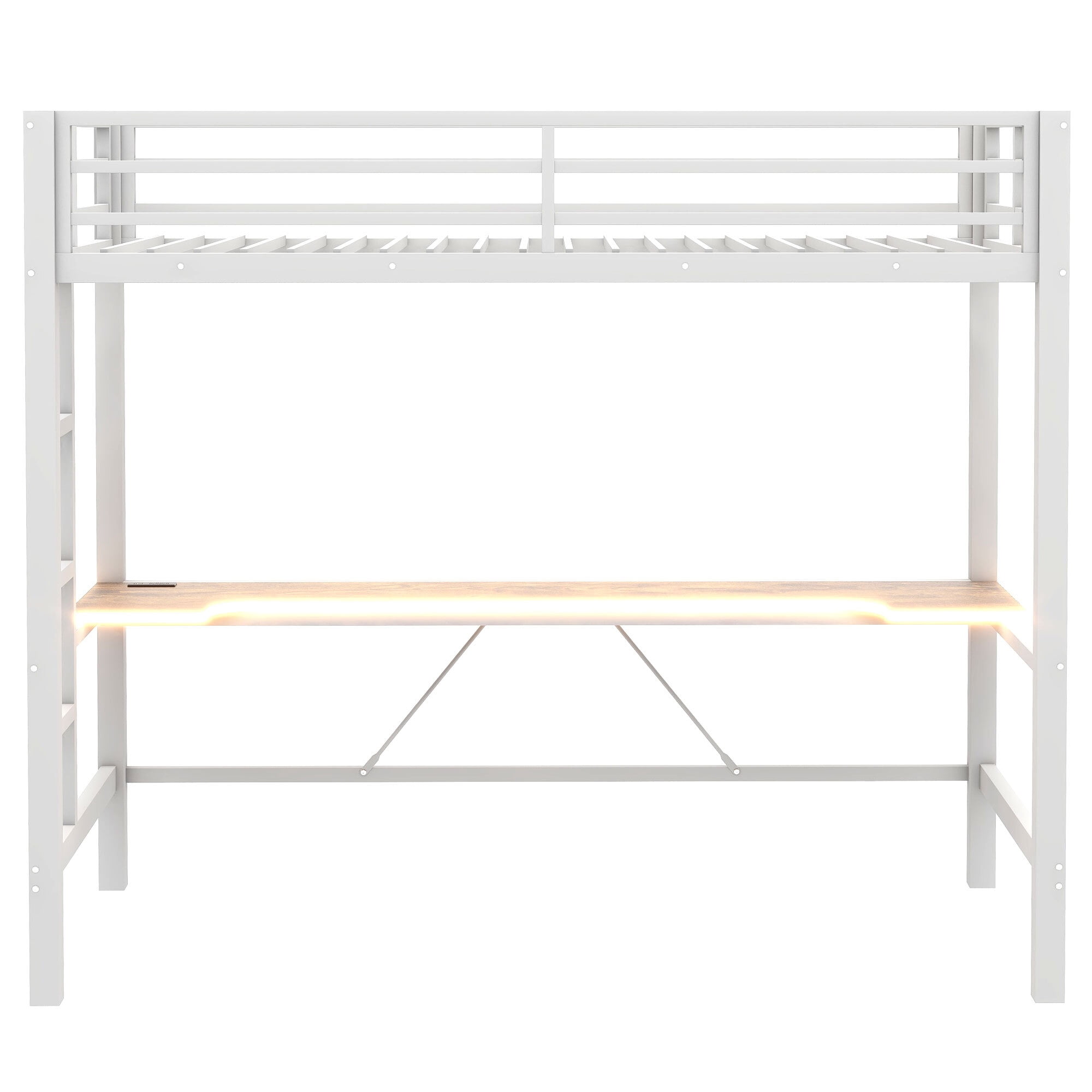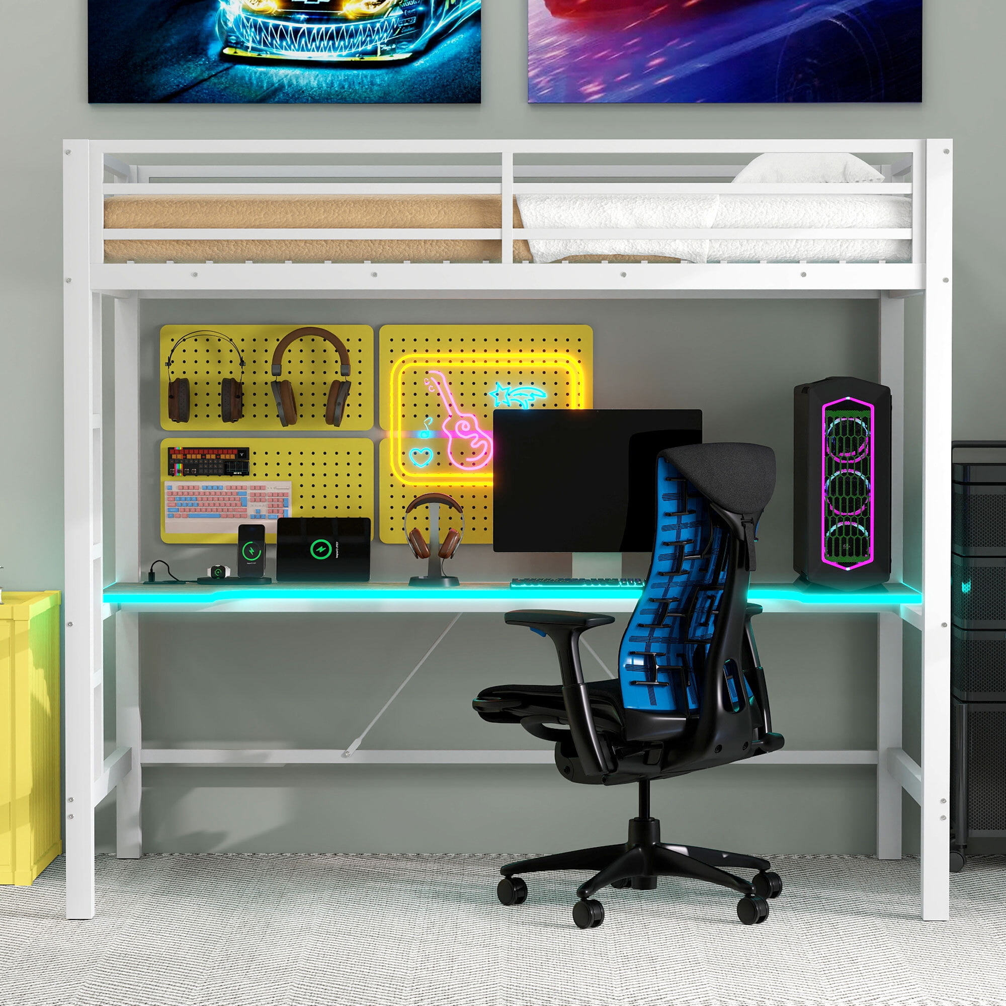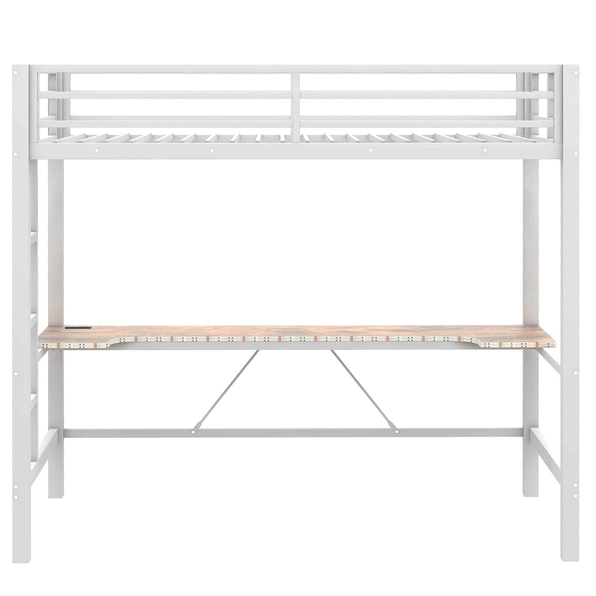 Euroco Metal Twin Size Loft Bed with Desk, Gaming Bed with LED Light and USB Charging for Kids Teens, White
