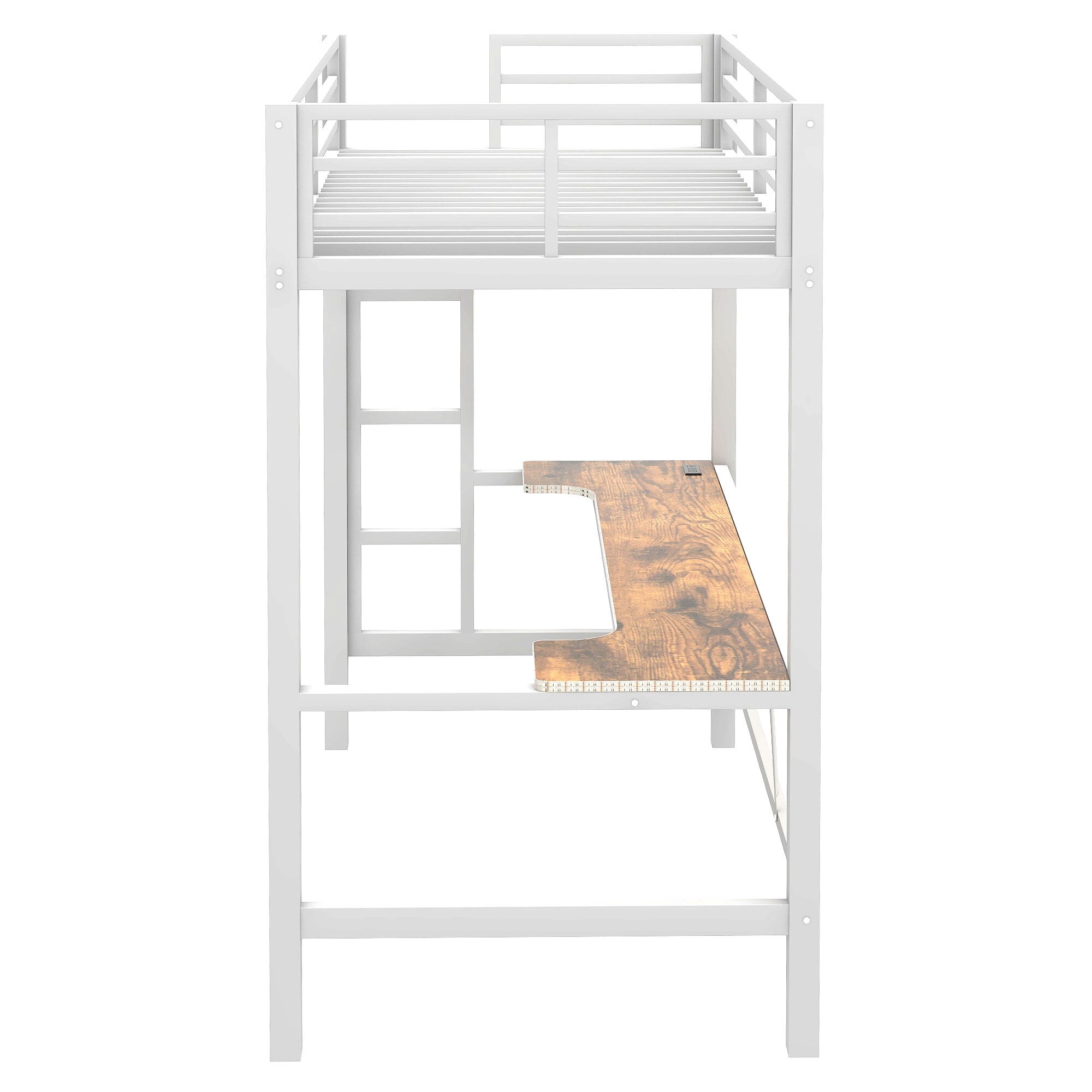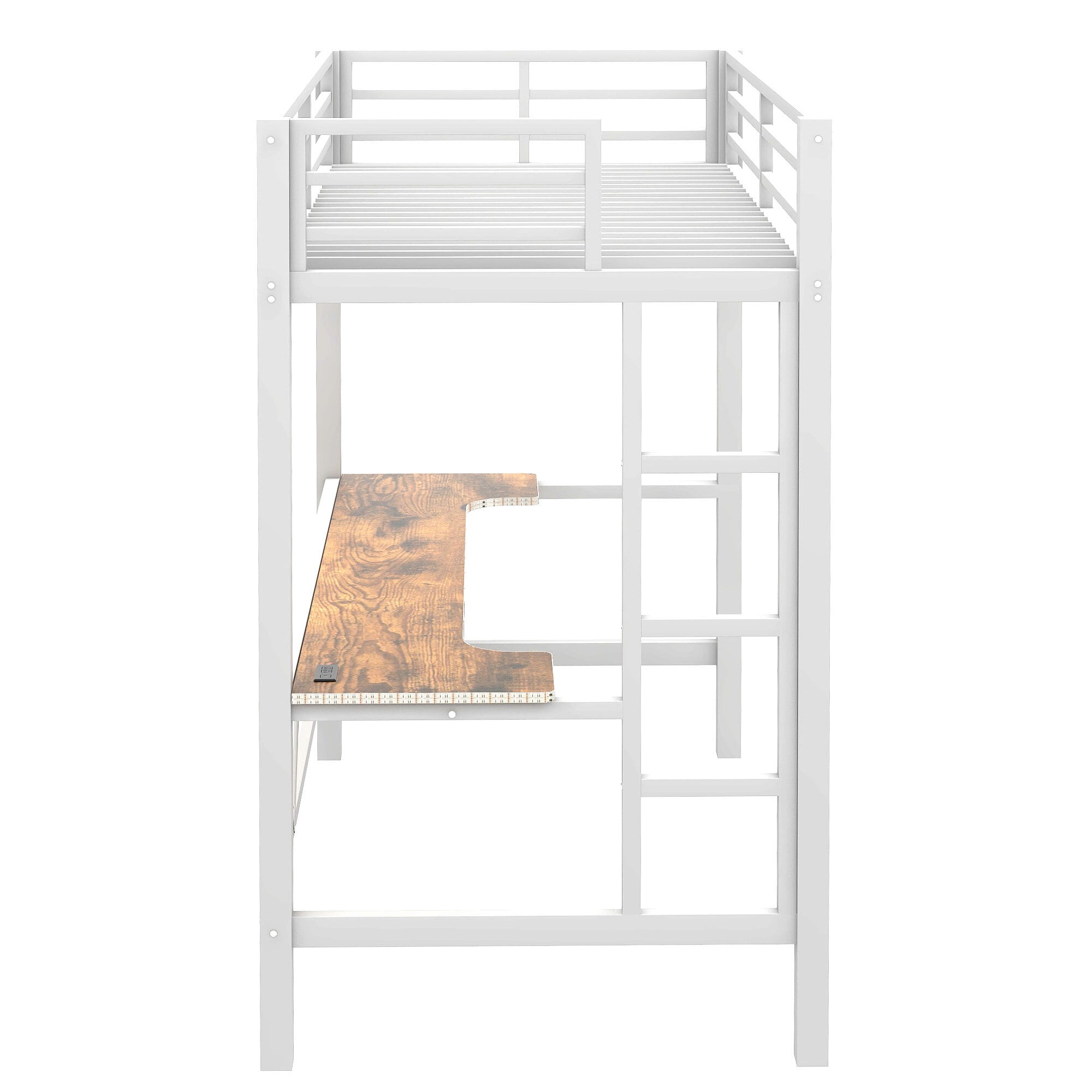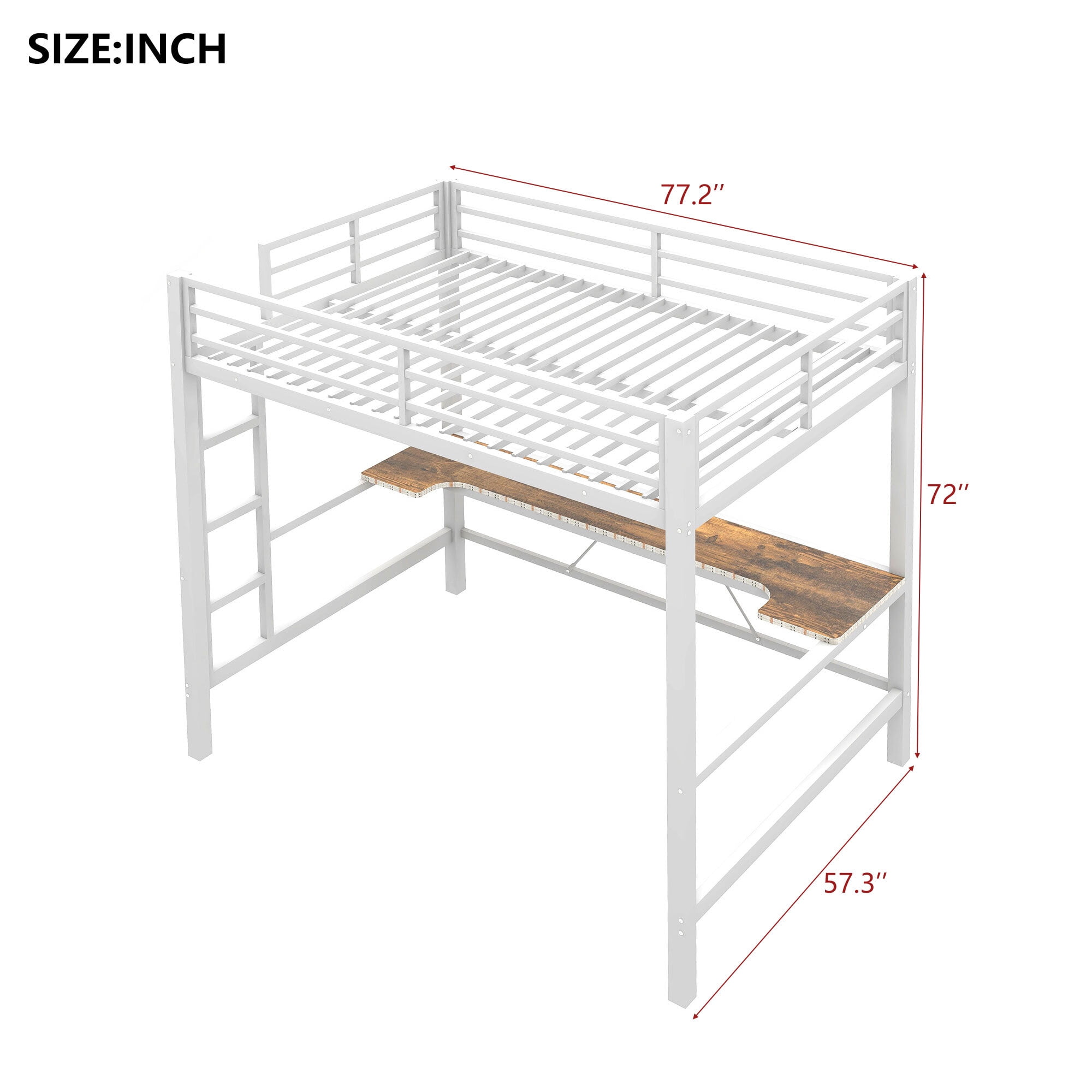 Key Features: Durable Metal Construction: Built with high-quality, sturdy metal frames, this loft bed ensures long-lasting durability and stability. The robust design supports up to 250 lbs, making it a reliable choice for daily use. Integrated Desk with LED Lighting: The built-in desk features a sleek, ergonomic design, providing ample workspace for studying, working, or gaming. The built-in LED light strip adds a modern touch, offering adjustable lighting to create the perfect ambiance for any activity. Convenient USB Charging Ports: Stay connected with dual USB charging ports integrated into the desk. Charge your devices effortlessly while you work, play, or relax, keeping your space organized and clutter-free. Gaming-Ready Design: Designed with gamers in mind, this loft bed offers a dedicated space for your gaming setup. The desk is perfectly sized to accommodate monitors, keyboards, and other gaming accessories, while the LED lighting enhances your gaming atmosphere. Space-Saving Loft Design: The elevated twin-size bed creates valuable floor space underneath, allowing you to utilize the area for a desk, storage, or other furniture. This makes it an excellent choice for small rooms or shared spaces. Comfortable Twin-Size Sleeping Area: The loft bed features a twin-size sleeping area with a secure guardrail for added safety. The bed is compatible with a standard twin-size mattress (sold separately), ensuring a comfortable night’s sleep. Sleek Black Finish: The modern black finish complements any decor style, from contemporary to industrial. Its minimalist design blends seamlessly with your existing furniture, adding a touch of sophistication to your room. Easy Assembly: The loft bed comes with clear instructions and all necessary hardware for straightforward assembly. While it may require some time to set up, the result is a sturdy and functional piece of furniture that will transform your space. Product Specifications: Material: Metal+MDF Color: Black Bed Size: Full (mattress not included) Weight Capacity: 250 lbs Dimensions: 77.2”L x57.3”W x 72”H Included Components: Loft bed frame, desk, LED light strip, USB charging ports, guardrails, and assembly hardware Why Choose the Euroco Metal Twin Size Loft Bed? Whether you’re a student, a gamer, or someone looking to optimize your living space, this loft bed offers the perfect blend of style, functionality, and innovation. With its integrated desk, LED lighting, and USB charging ports, it’s more than just a bed—it’s a multifunctional hub for work, play, and relaxation.