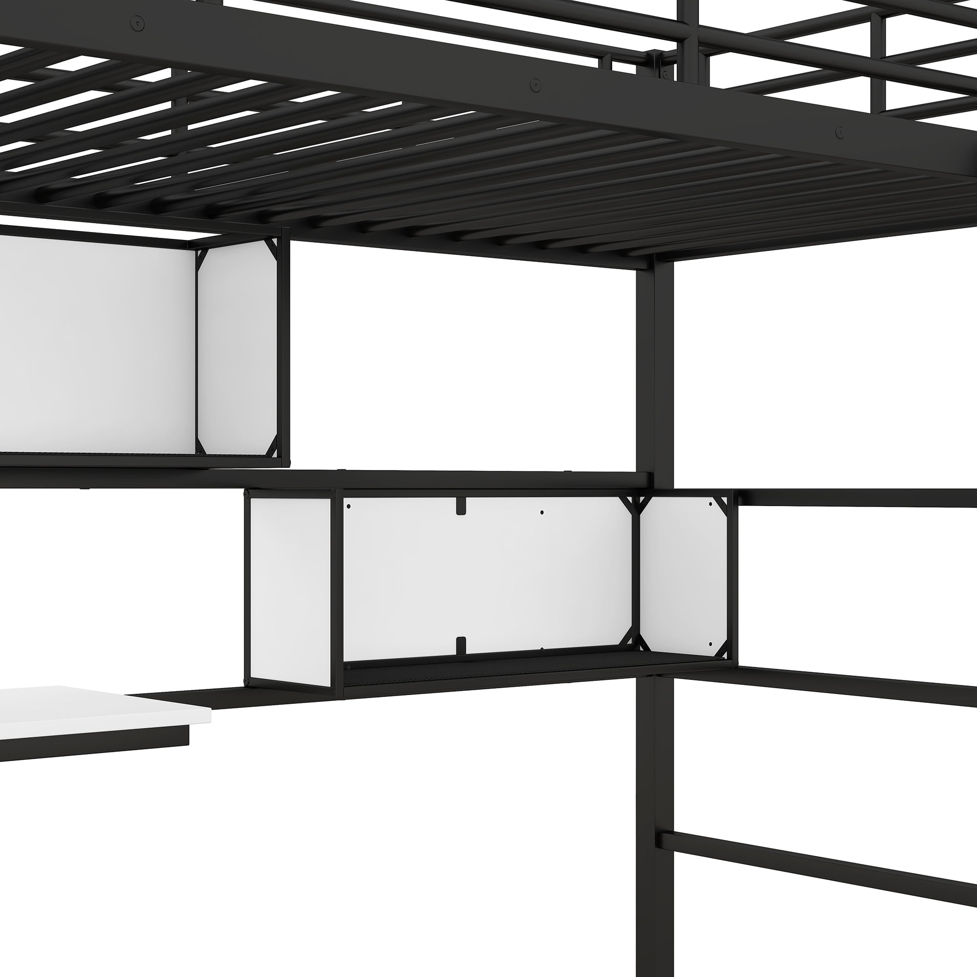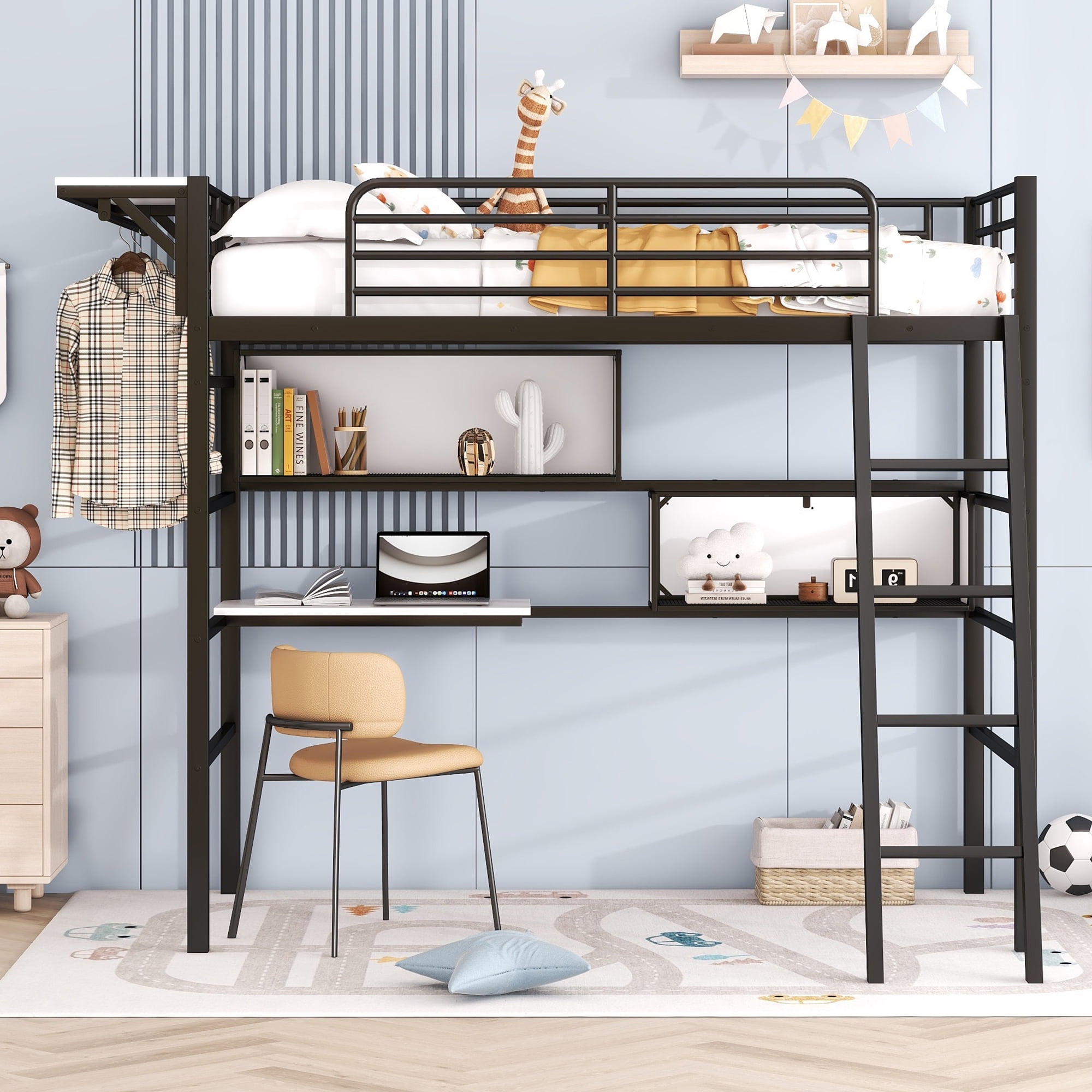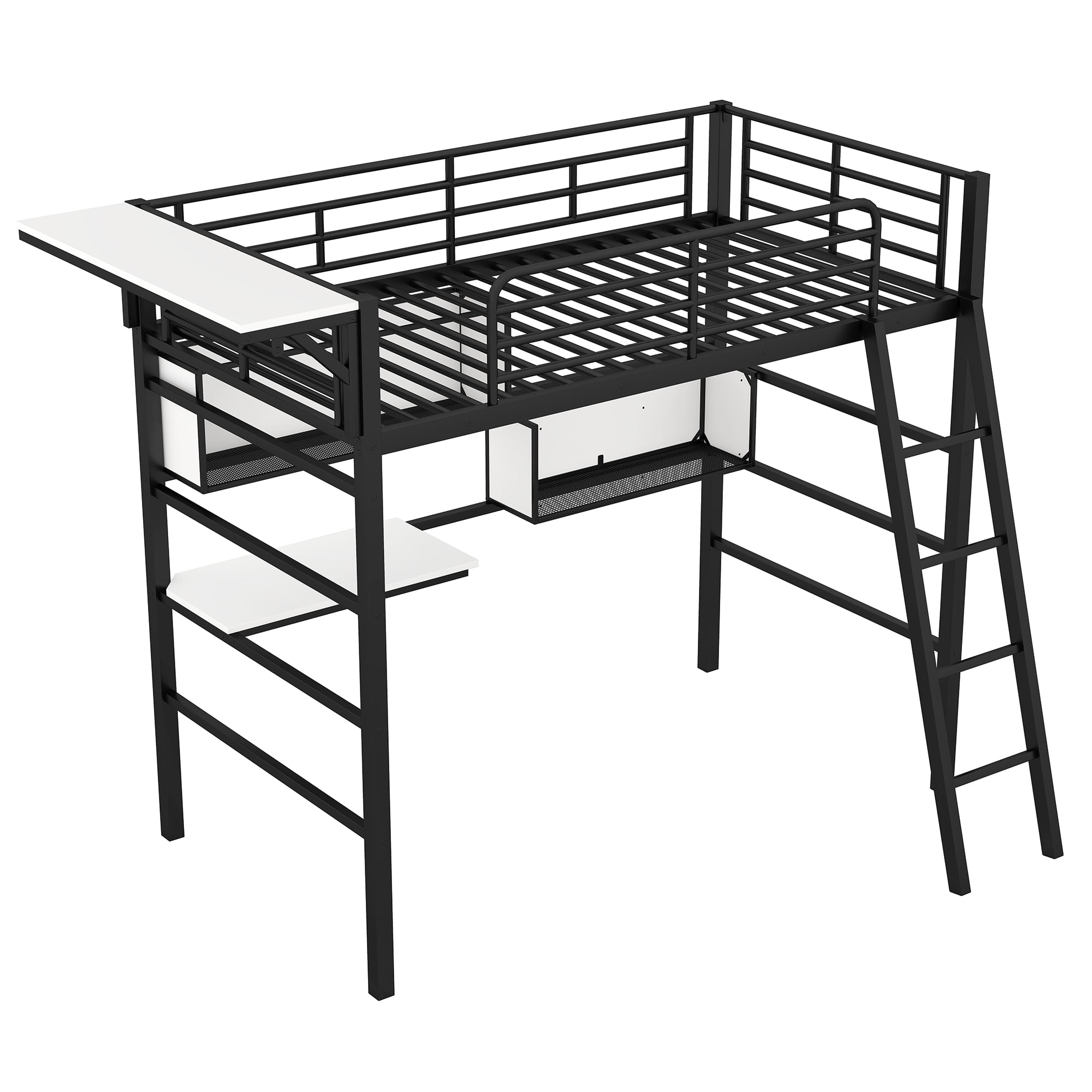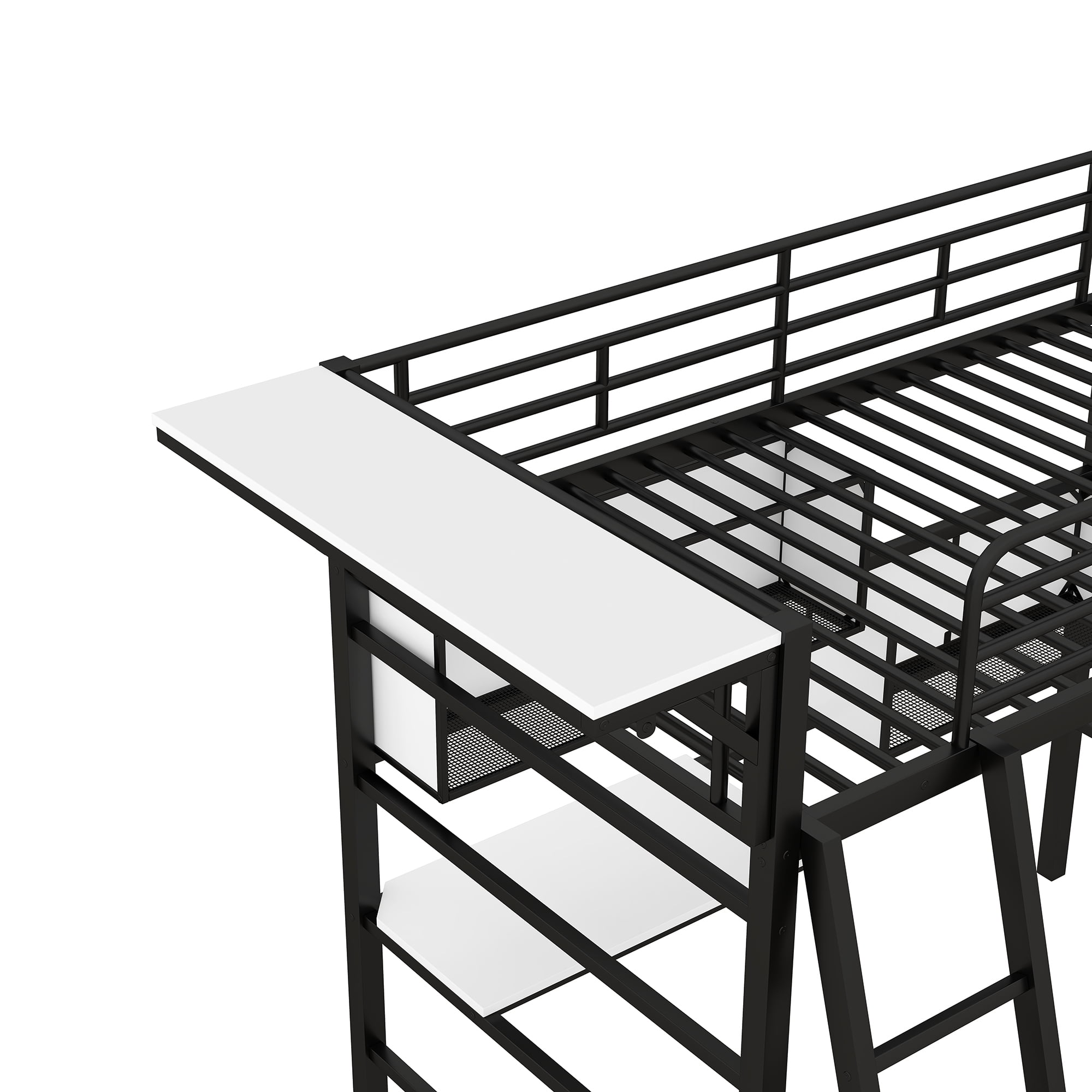Appealing to this eye, this multi-directional loft bed is equipped with all of the basics needed to provide a comfortable and fully functional bedroom that will turn your sleeping quarters into an oasis. Crafted with a finished metal frame, the neutral color scheme will seamlessly play in the background of any bedding and décor styles of your choice. Featuring an expansive twin size bed on top facing different directions, this bunk has been formulated to draw the eye and make a bold contemporary statement while also accommodating multiple people. Guardrails on the upper bed and the secure heavy duty bed frame make this bed a sturdy and safe option for your bedroom, while also featuring a built-in side desk featuring MDF wood accents, making this bed addition to your space. The white shelf and big desktop will help you make room tidy. Clothes hange is also a sweet design.